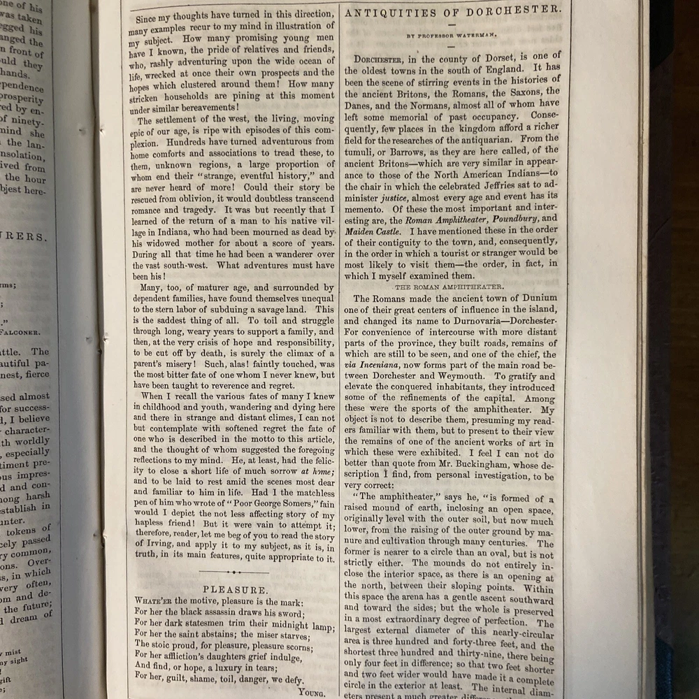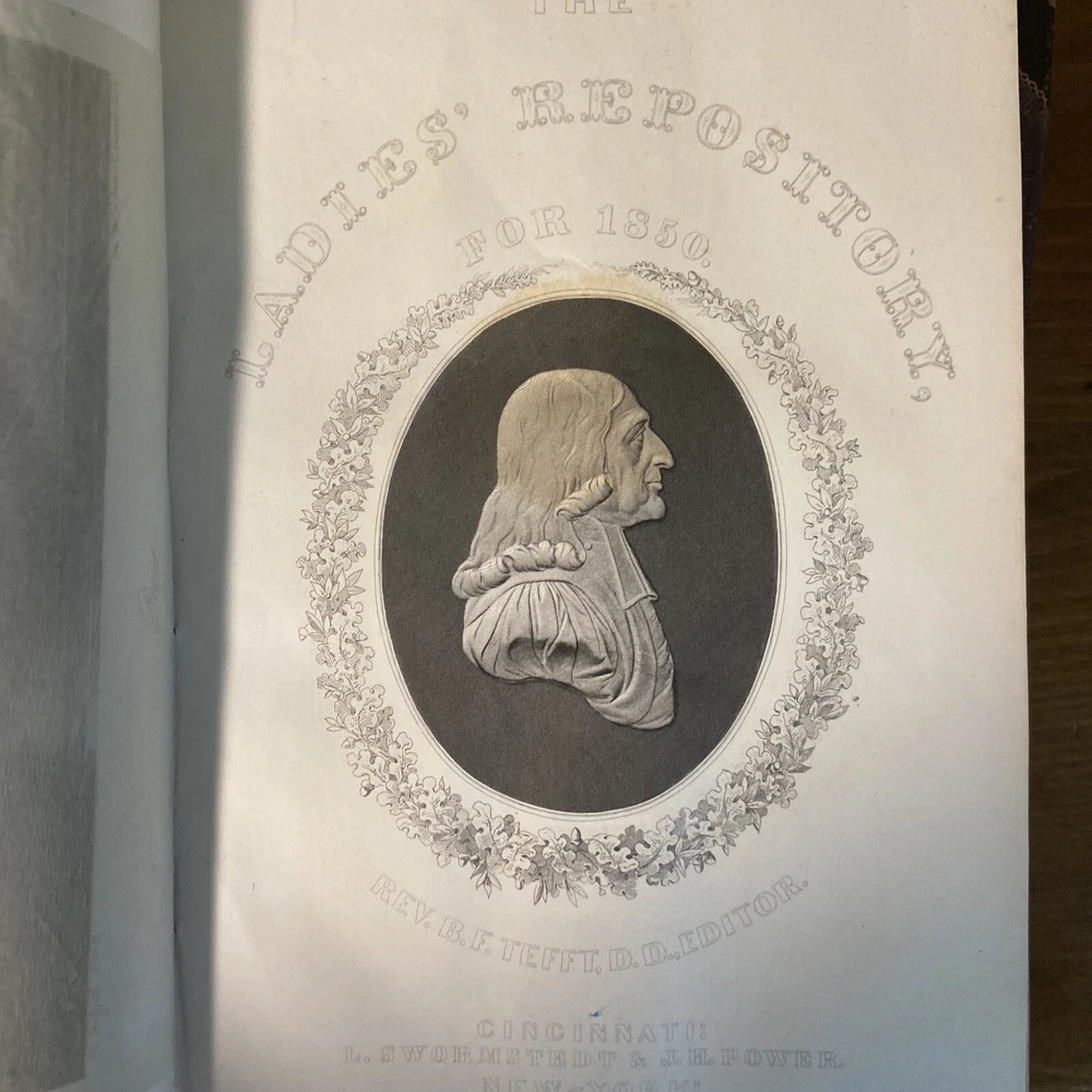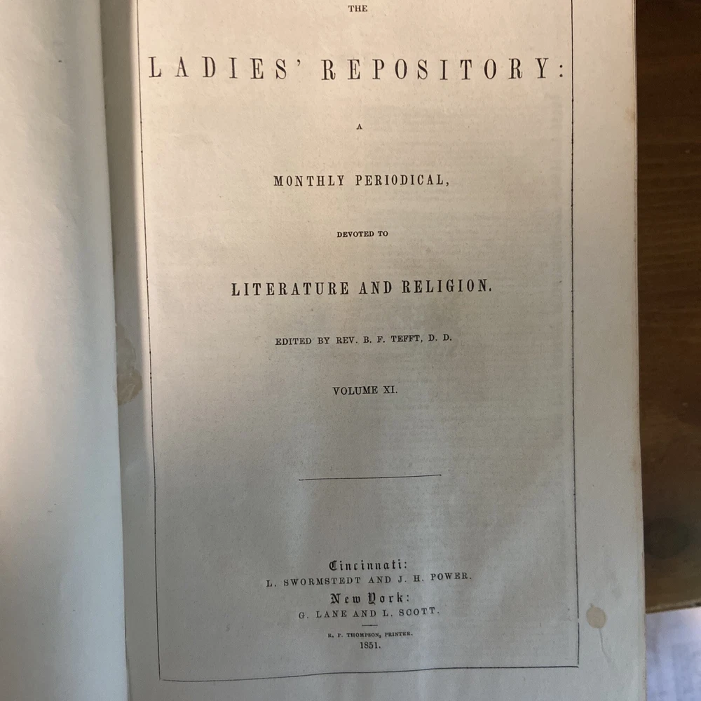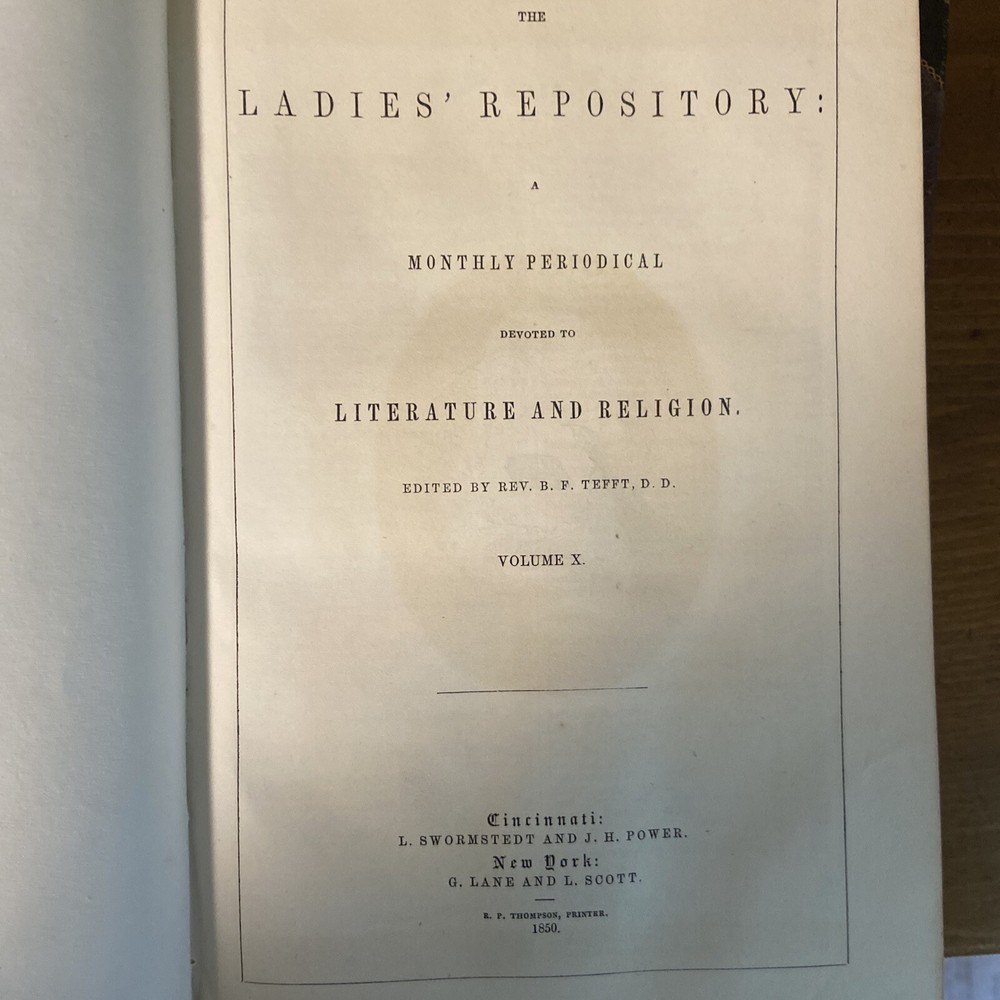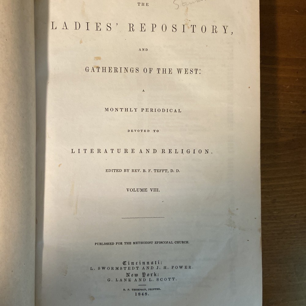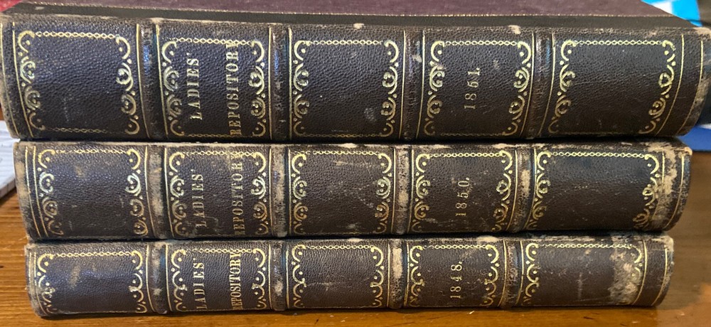 1848 Ladies’ Repository 3 volume set. 10.75 x 6.75 inches. Original 1/2 leather bindings with cloth boards. Overall in very good condition. Minor wear and rub. 1848, volume VIII. 352 pages. Contents secure and clean. 1850, volume X, 412 . Rear hinge a little worn but secure. Contents secure and clean. 1851, volume XI, 476 pages. Hint of foxing.