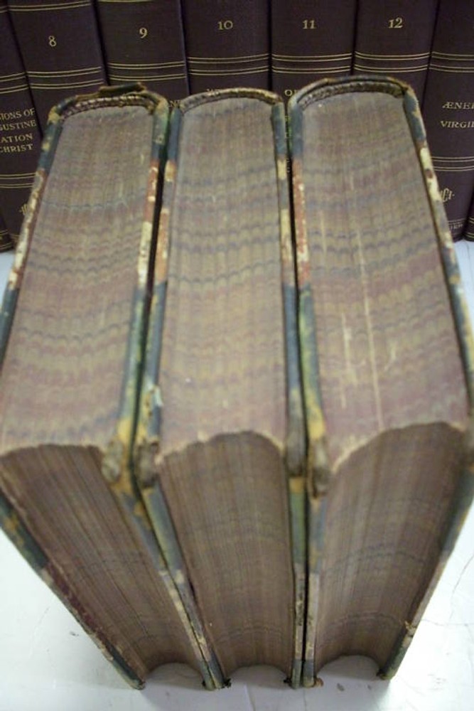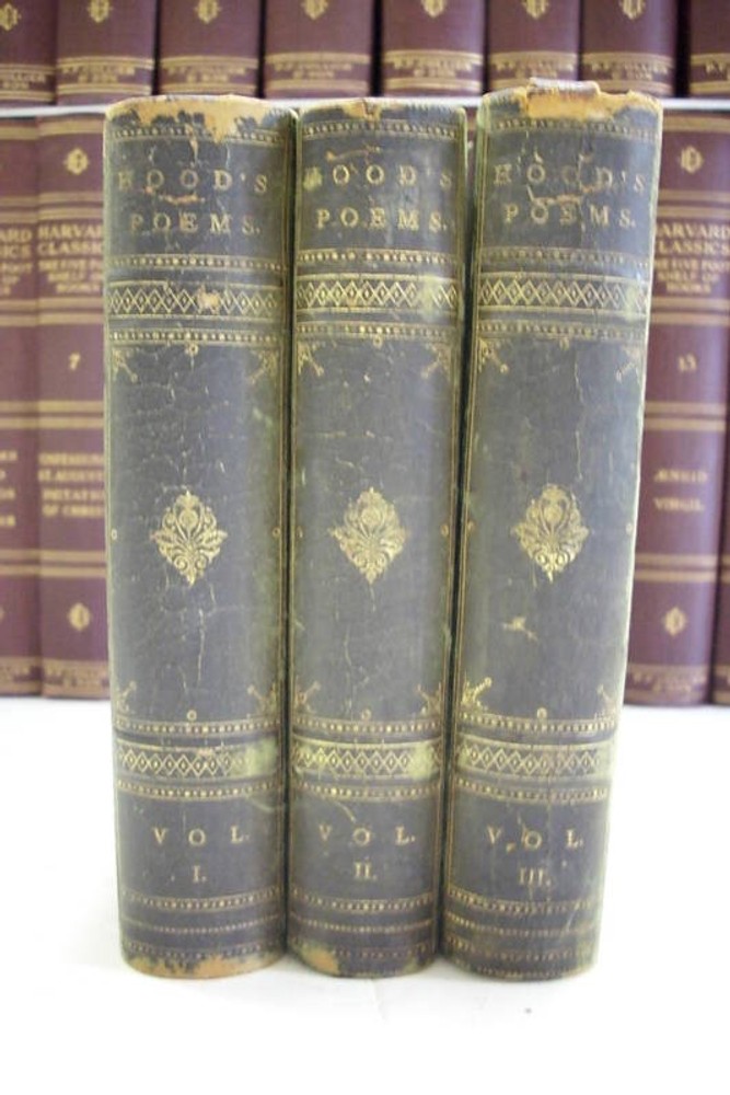 You are bidding on an antique set of hardcover books titled The Poetical Works of Thomas Hood. Contains a memoir of Hood (1799-1845) by Richard Monckton Milnes. Published by James Miller, New York. There is no publishing date, but I estimate around 1850. The set is complete in three volumes and you are bidding on all three volumes. The books are quarter-bound in dark green leather with leather tips. They have gold lettering and design on spines. The leather shows some wear and scuffing, especially to top/bottom of spines. The covers have an attractive marbellized design. All covers are firmly attached with no cracking of hinges, either inside or outside. There is some wear to the corners. The same marbellized design is on all three page ends. There are also decorative endpages that have the same design. All pages are very clean and tightly bound. There is a total of over 1,200 pages of poetry! This set is in overall very good condition! Would make a super addition to a collection. Great gift idea! (Inventory: Box 114) Track Page Views With Auctiva's FREE Counter