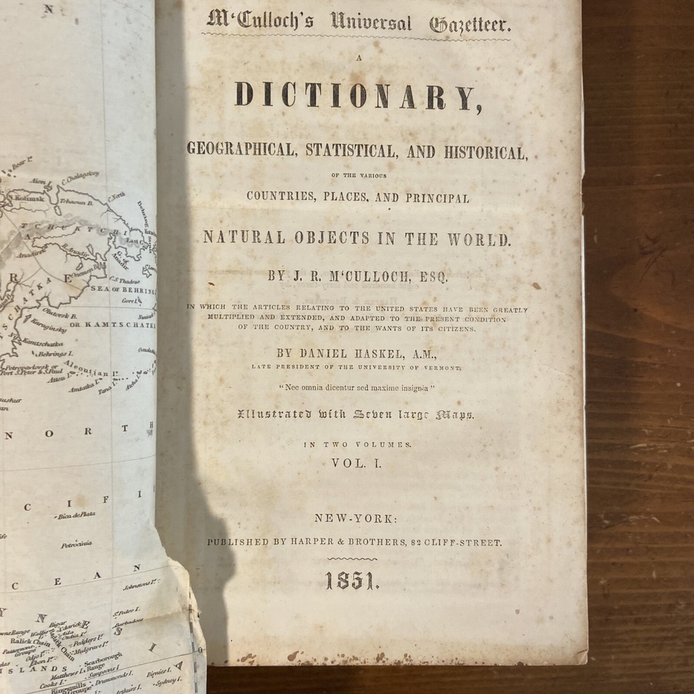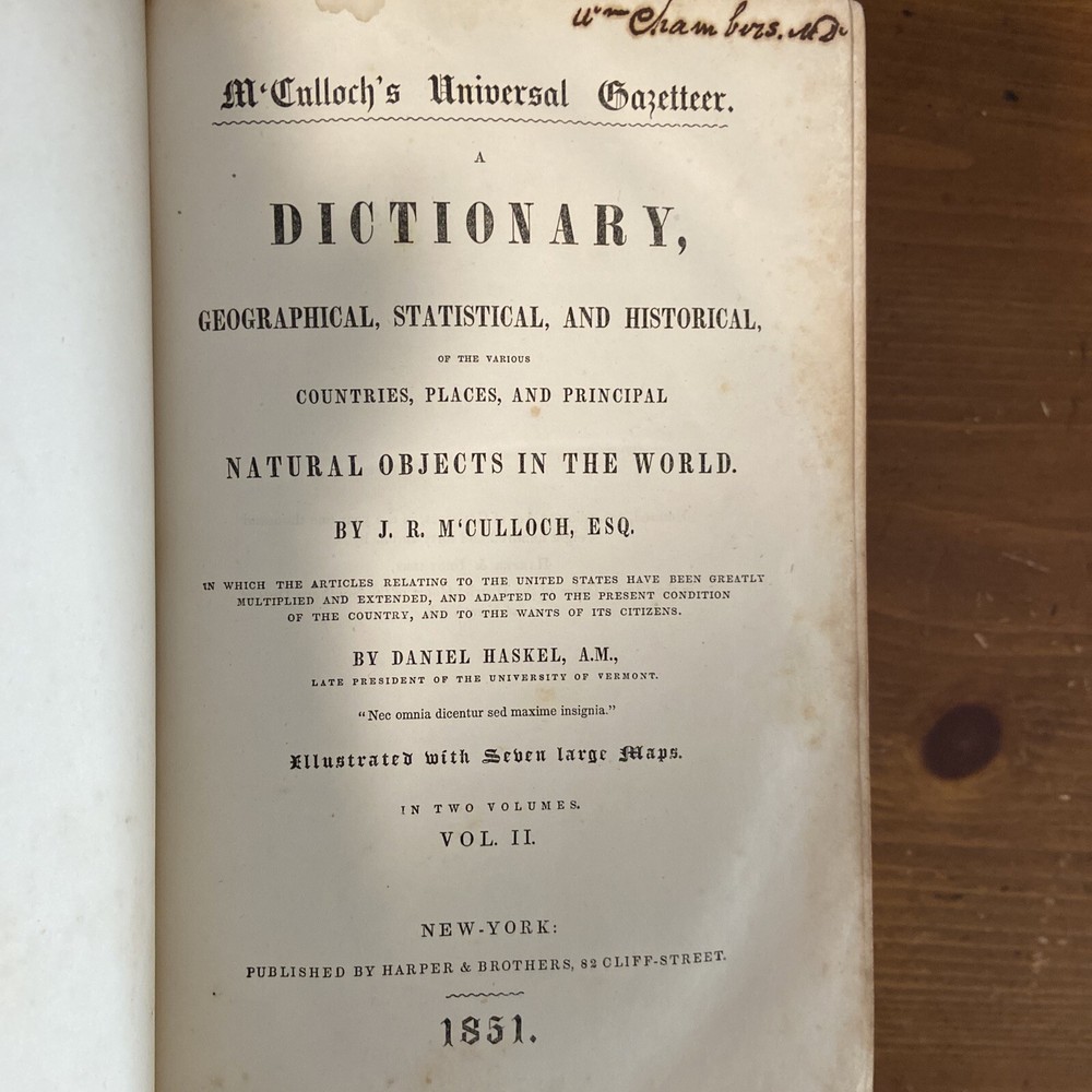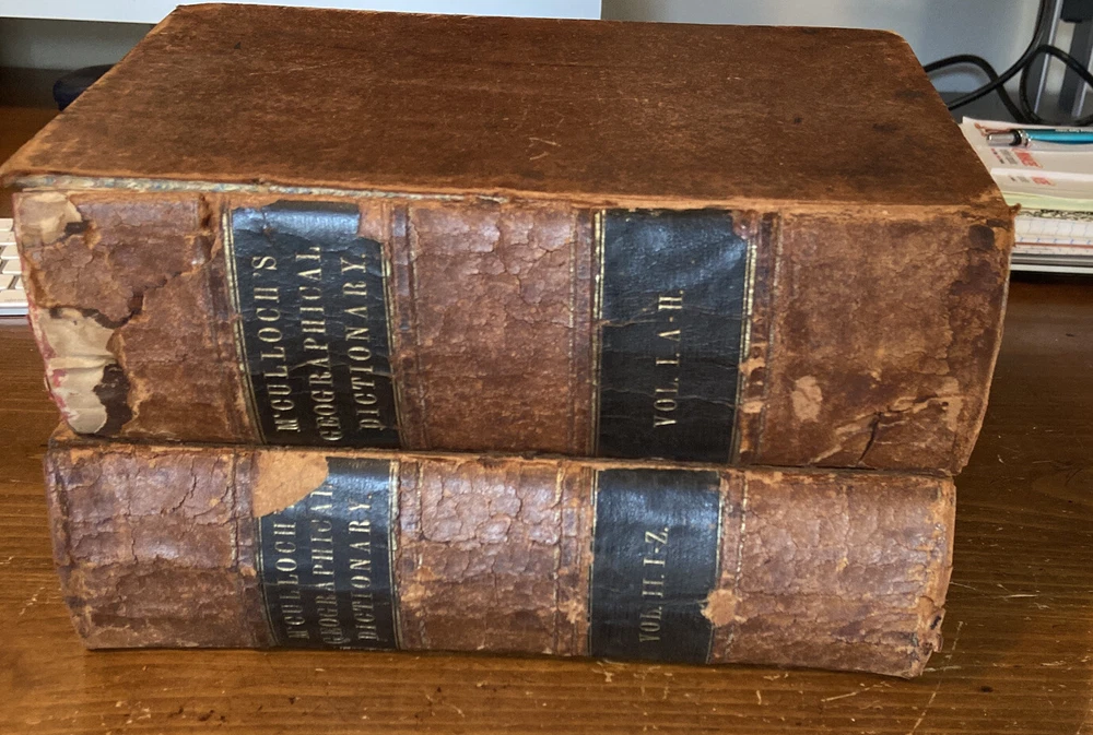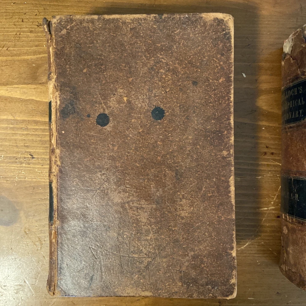 1851 Mc’Culloch’s Geographical Dictionary 2 vol set. 9.75 x 6.25 inches. Original leather bindings in good plus condition. Volume I; 1148 pages. Front board loose. Marbled pastedowns and endpapers. Contents well preserved. Foxing. Some edge wear and minor splits to maps. Volume II; 1109 pages plus advertisements. Contents well preserved.Foxing.