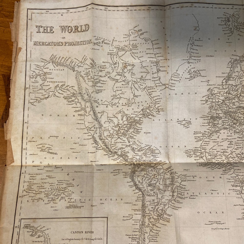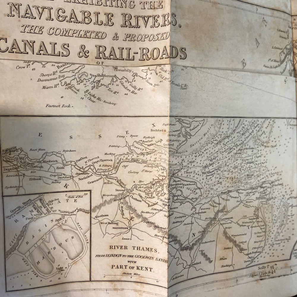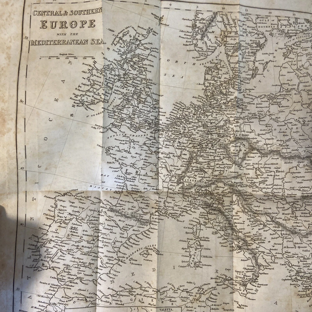 1851 Mc’Culloch’s Geographical Dictionary 2 vol set. 9.75 x 6.25 inches. Original leather bindings in good plus condition. Volume I; 1148 pages. Front board loose. Marbled pastedowns and endpapers. Contents well preserved. Foxing. Some edge wear and minor splits to maps. Volume II; 1109 pages plus advertisements. Contents well preserved.Foxing.