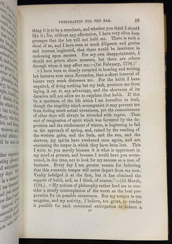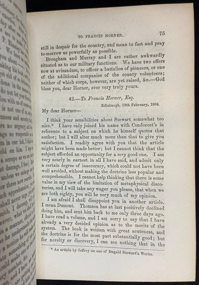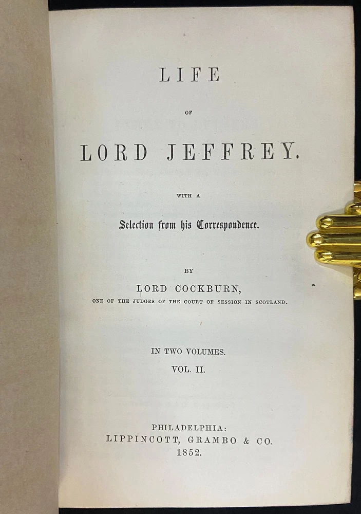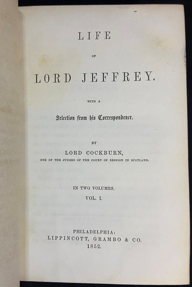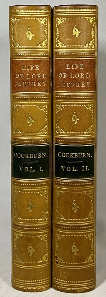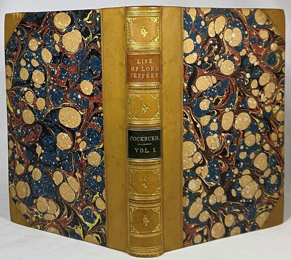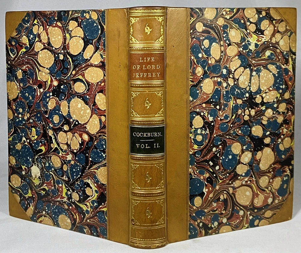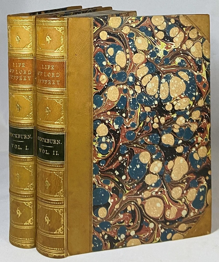 Lovely original 1852 complete 2 volume set of Lord Cockburn's, "Life of Lord Jeffrey. With a Selection from his Correspondence." The books are overall in very good condition with just some minor signs of wear and age. The covers only have some light wear. The bindings are good and sound. All of the page edges are marbled. The interiors are lightly toned from age with some occasional light foxing. Along with that there may be the very occasional page with some kind of other minor imperfection, such as a tiny chip or tear, light wrinkle, creased page corner, minor stain or marking, light bit of soiling, etc. Generally though, it's a beautiful set. The books measure approximately 7 3/4 inches by 5 3/8 inches. Volume 1 is 343 pages long and Volume 2 is 368. Please look at all of the photos to further note the condition.