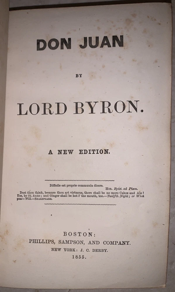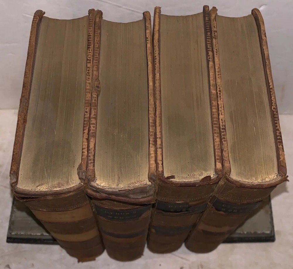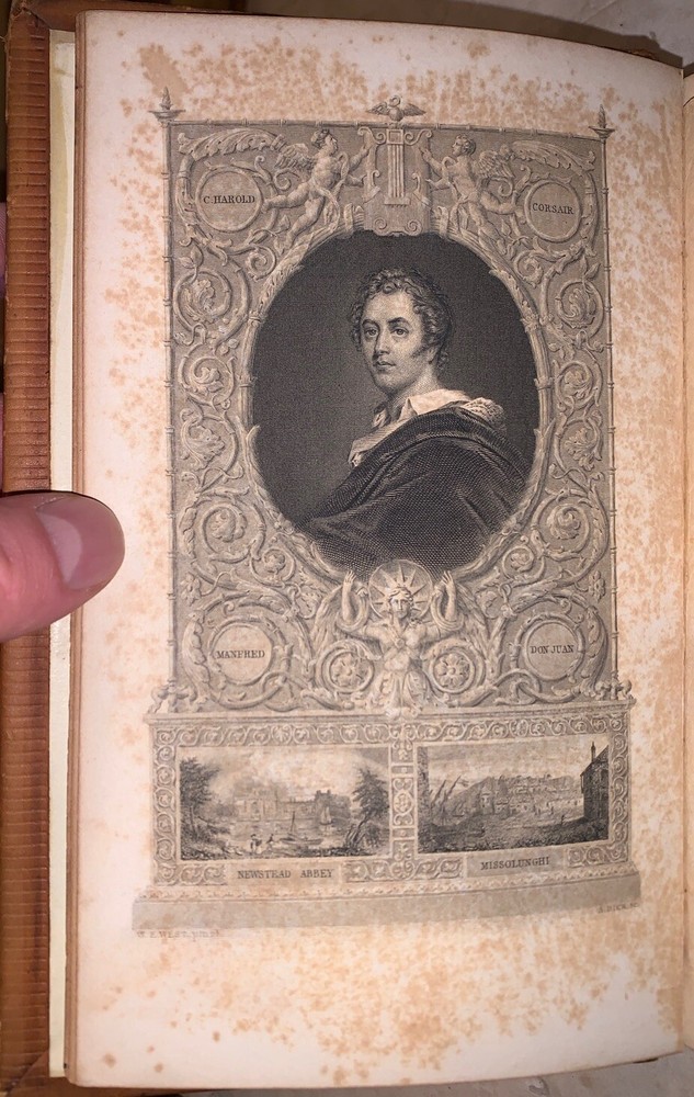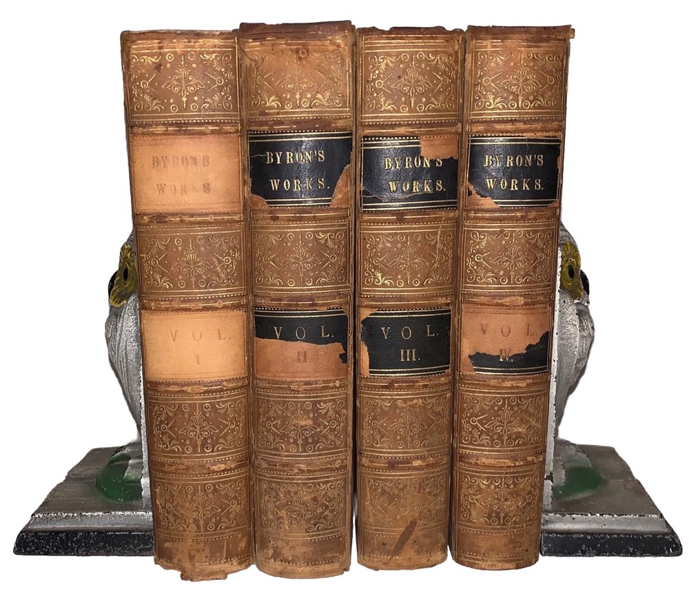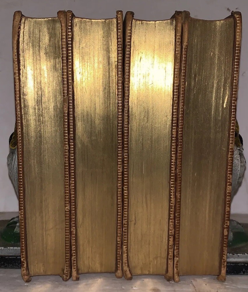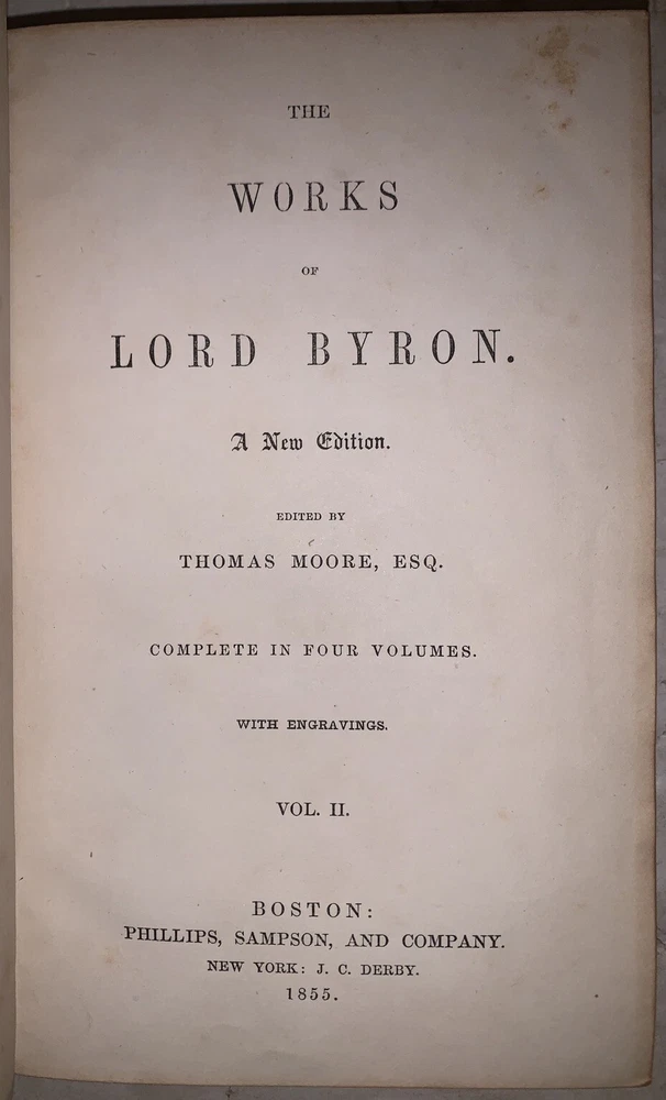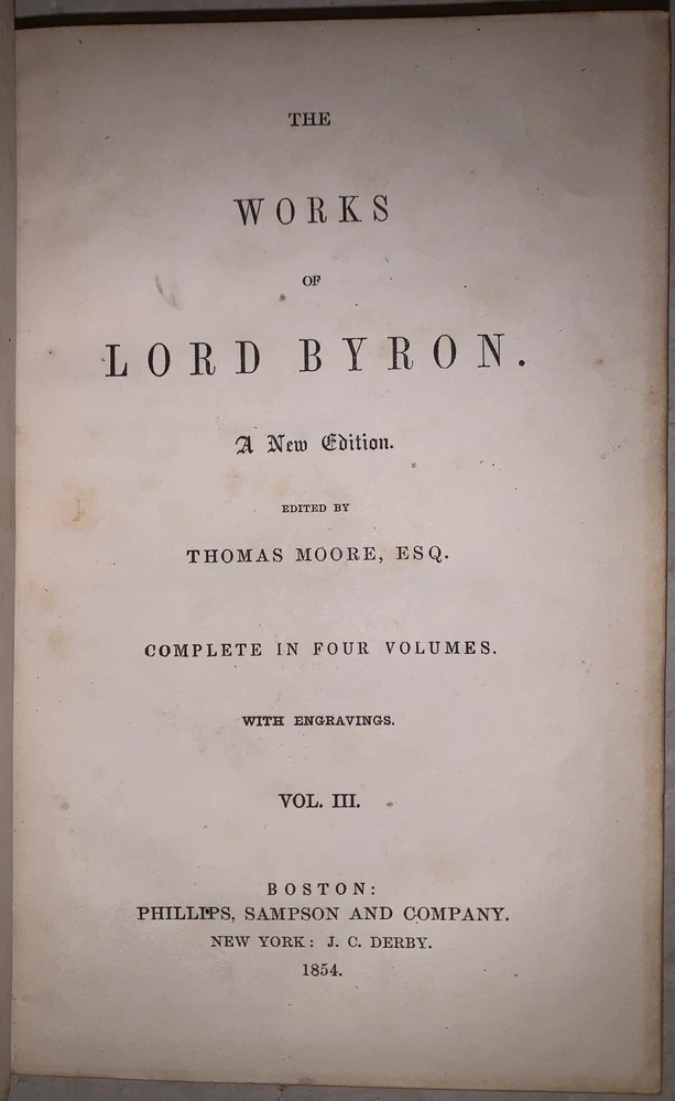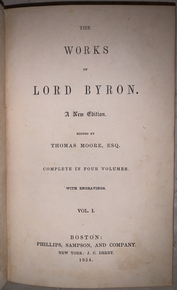The Works of Lord Byron A New Edition Edited by Thomas Moore, Esq Complete in Four Volumes With Engravings Boston: Philips, Sampson, and Company 1854 - 1855 - 1854 - 1855 Four octavos, bound in period full leather with small raised bands and gilt decroation to spines. All edges gilt. Some rubbing and wear, several spine labels missing and others are very delicate and falling apart, scuffs, some damage to spines, some discoloration, else in good condition. If you have any questions, feel free to ask and don't forget to check out my other listings.
