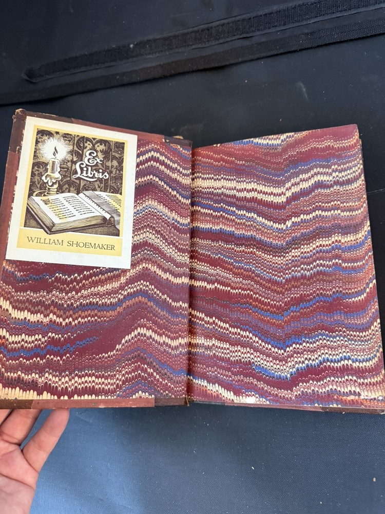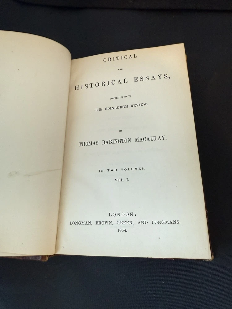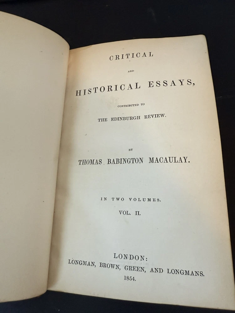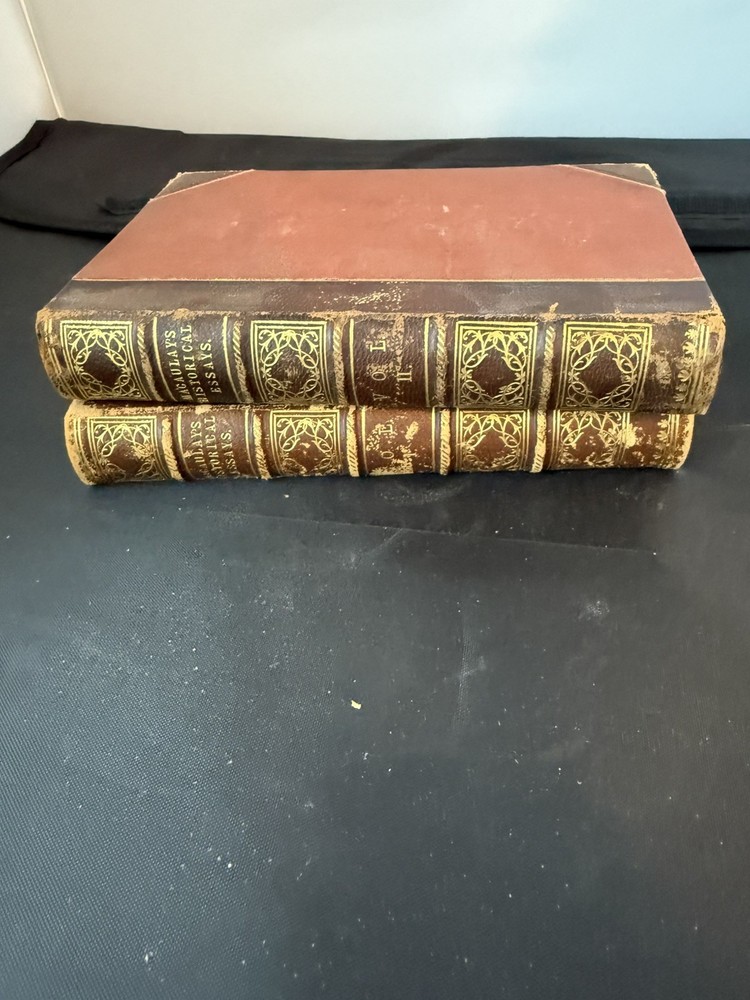 This is a stunning 2-volume antique set of Critical and Historical Essays by Thomas Babington Macaulay, published in 1854 by Longman, Brown, Green, and Longmans in London. These beautifully bound books feature: • Decorative gilt spines with raised bands • Marbled endpapers and page edges • Half-leather binding over marbled boards • Ex Libris plate from previous owner (William Shoemaker) Macaulay’s essays—originally published in the Edinburgh Review—cover influential figures such as Sir William Temple, Lord Clive, Warren Hastings, and Frederic the Great, among others. Condition: • Both volumes show exterior wear to spine and corners (see photos) • Bindings remain solid • Interior pages are clean with mild age toning • Attractive marbled endpapers and edges intact • Great example of mid-19th-century craftsmanship and bookbinding Perfect for collectors of antiquarian books, history enthusiasts, or as display decor. Shipping: Ships securely packed via USPS Media Mail.