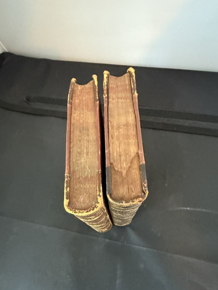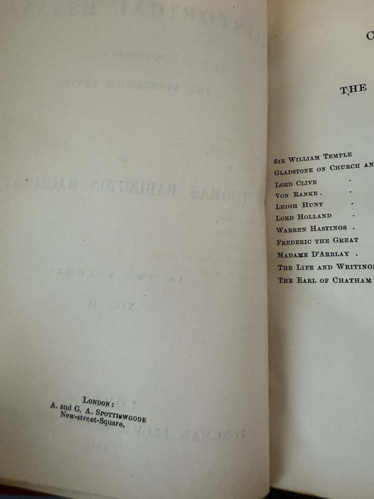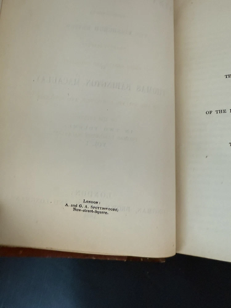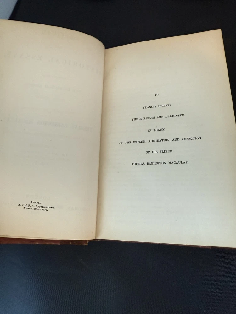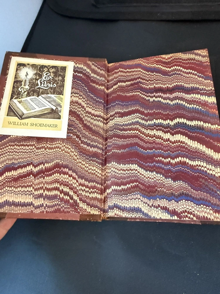 This is a stunning 2-volume antique set of Critical and Historical Essays by Thomas Babington Macaulay, published in 1854 by Longman, Brown, Green, and Longmans in London. These beautifully bound books feature: • Decorative gilt spines with raised bands • Marbled endpapers and page edges • Half-leather binding over marbled boards • Ex Libris plate from previous owner (William Shoemaker) Macaulay’s essays—originally published in the Edinburgh Review—cover influential figures such as Sir William Temple, Lord Clive, Warren Hastings, and Frederic the Great, among others. Condition: • Both volumes show exterior wear to spine and corners (see photos) • Bindings remain solid • Interior pages are clean with mild age toning • Attractive marbled endpapers and edges intact • Great example of mid-19th-century craftsmanship and bookbinding Perfect for collectors of antiquarian books, history enthusiasts, or as display decor. Shipping: Ships securely packed via USPS Media Mail.