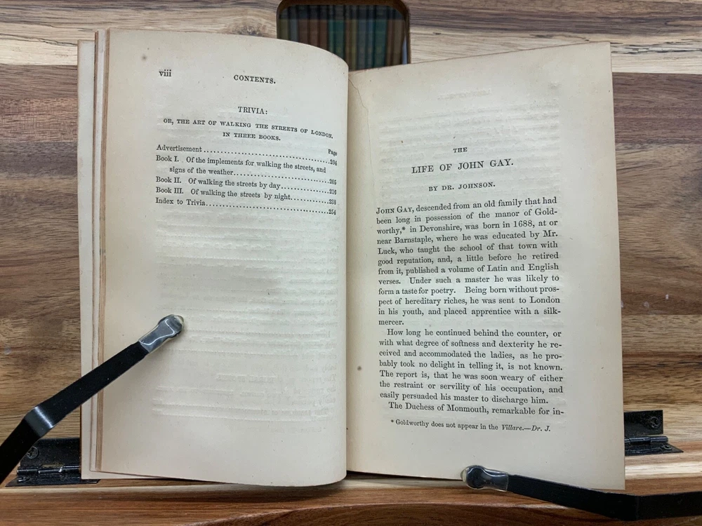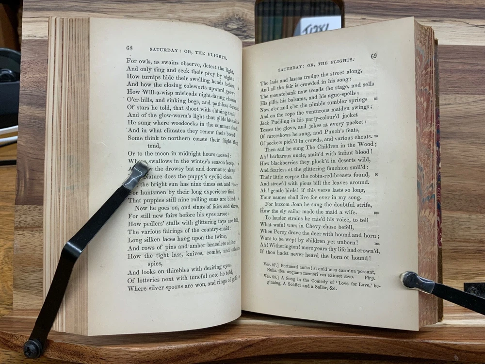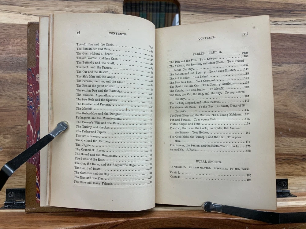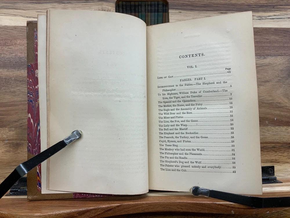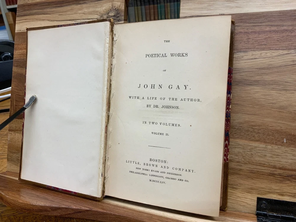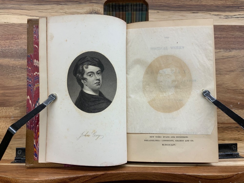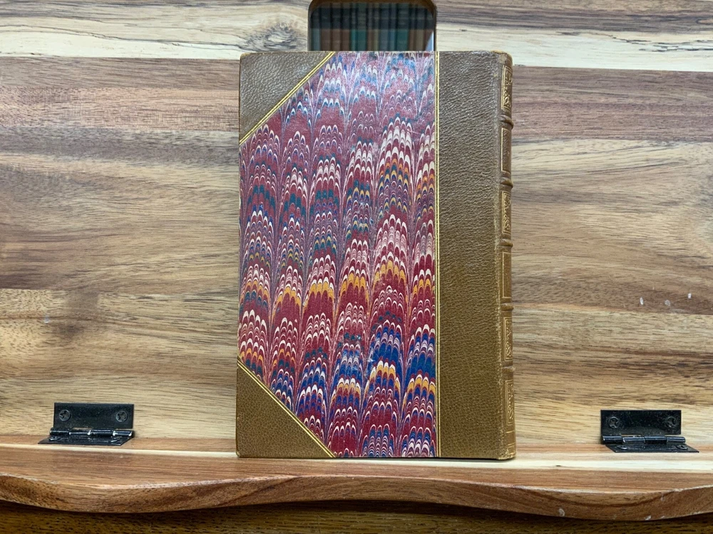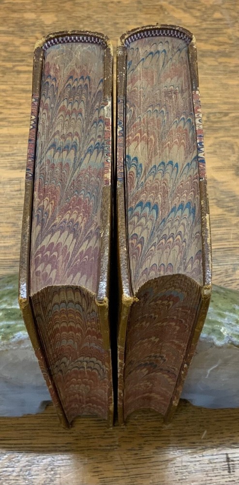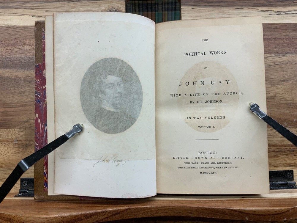 The Poetical Works of John Gay. With a Life of the Author by Dr. Johnson. In Two Volumes. Boston: Little, Brown and Company, 1854. Vol. I: Frontispiece of Gay, 260 p; Vol. II: 304 p. Fine half-leather marbled bindings measure 6.5 x 4.5", 18mo. In fair condition. Boards are lightly scuffed at edges and worn/bumped at leather corners. Heads and tails of spines scuffed; hinges and raised bands rubbed. Gilt lettering and deco bright and clean. Edges of text-blocks marbled (Top edges dulled). Front gutter of Vol. II broken at title page, end-page & fly-leaf fragile. Off-setting on tissue guard & title page of Vol. I from frontispiece. Normal to light toning in margins throughout both text-blocks. Bindings intact. Please see photos. John Gay (1685 - 1732) was an English poet and dramatist and member of the Scriblerus Club . He is best remembered for The Beggar's Opera (1728), a ballad opera. The characters, including Captain Macheath and Polly Peachum, became household names. Complete Set. Fine Binding. RAREA1854BFGA - 03/18 FORN-TUB-0079-BB-2505-HKREV873
