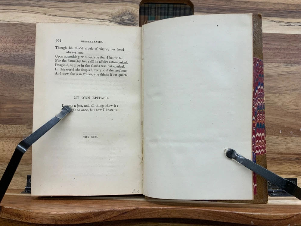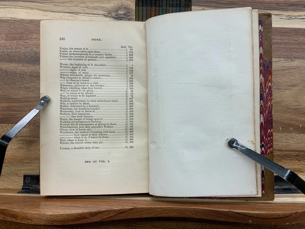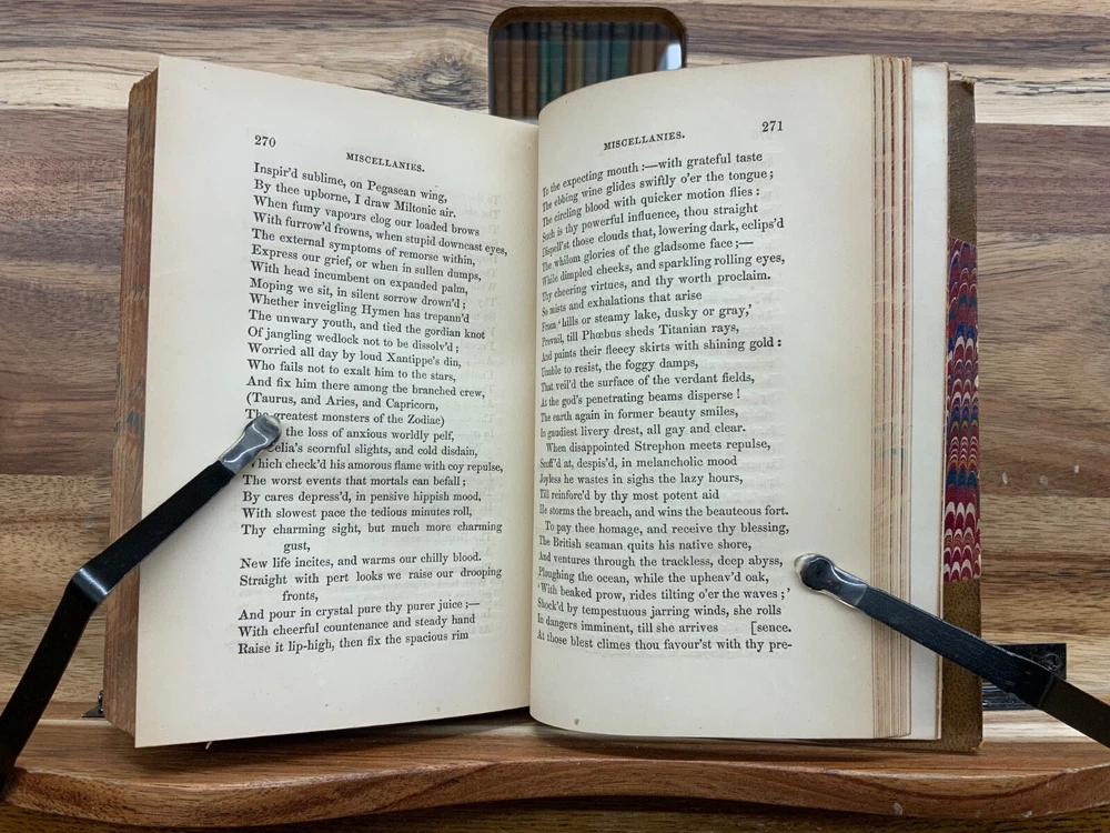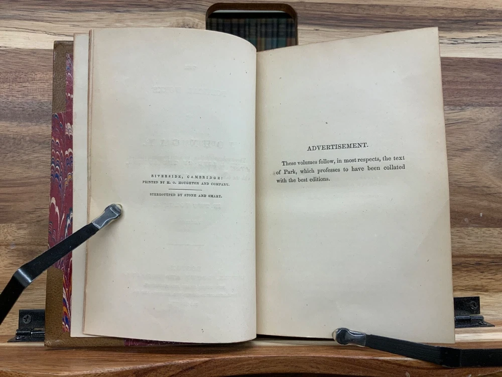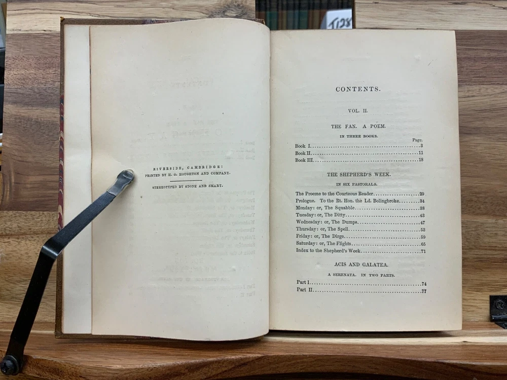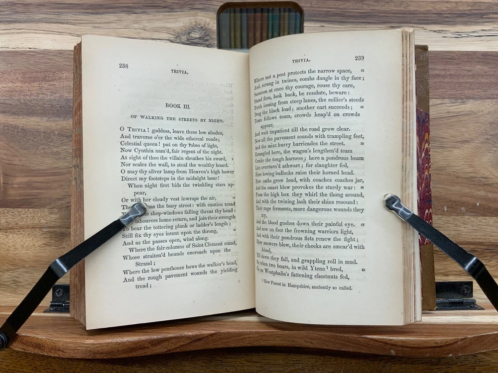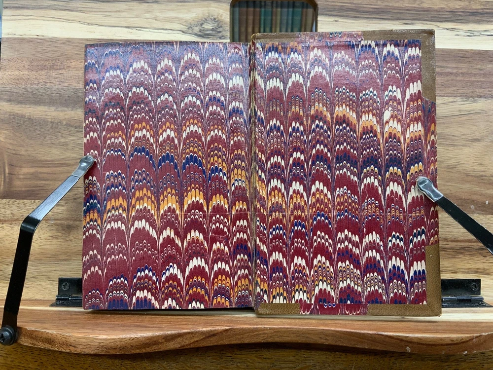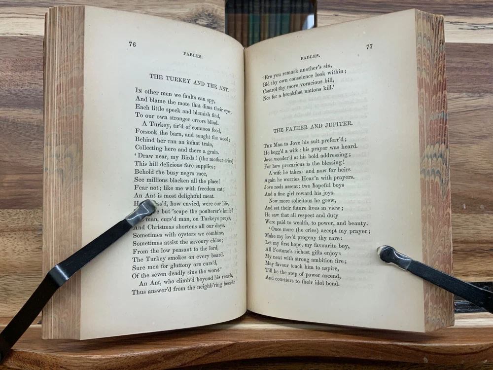 The Poetical Works of John Gay. With a Life of the Author by Dr. Johnson. In Two Volumes. Boston: Little, Brown and Company, 1854. Vol. I: Frontispiece of Gay, 260 p; Vol. II: 304 p. Fine half-leather marbled bindings measure 6.5 x 4.5", 18mo. In fair condition. Boards are lightly scuffed at edges and worn/bumped at leather corners. Heads and tails of spines scuffed; hinges and raised bands rubbed. Gilt lettering and deco bright and clean. Edges of text-blocks marbled (Top edges dulled). Front gutter of Vol. II broken at title page, end-page & fly-leaf fragile. Off-setting on tissue guard & title page of Vol. I from frontispiece. Normal to light toning in margins throughout both text-blocks. Bindings intact. Please see photos. John Gay (1685 - 1732) was an English poet and dramatist and member of the Scriblerus Club . He is best remembered for The Beggar's Opera (1728), a ballad opera. The characters, including Captain Macheath and Polly Peachum, became household names. Complete Set. Fine Binding. RAREA1854BFGA - 03/18 FORN-TUB-0079-BB-2505-HKREV873