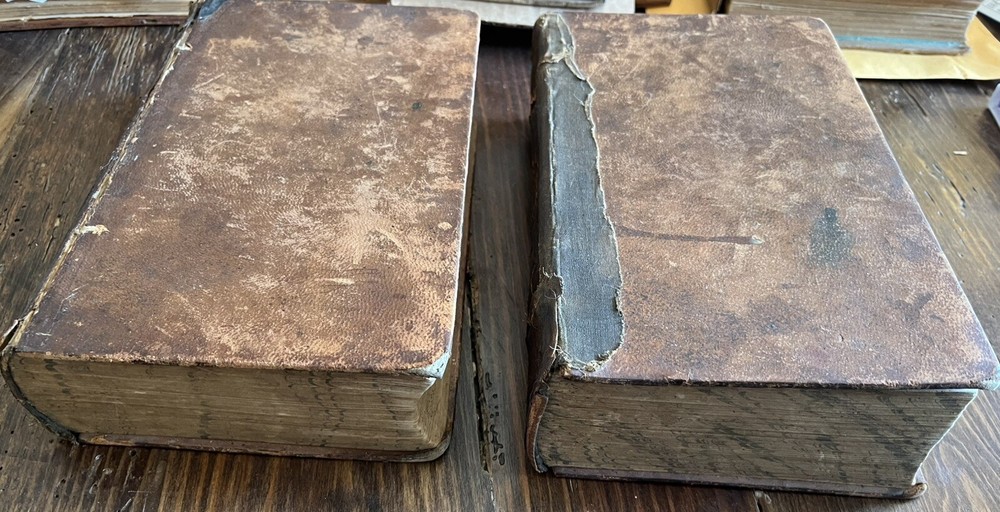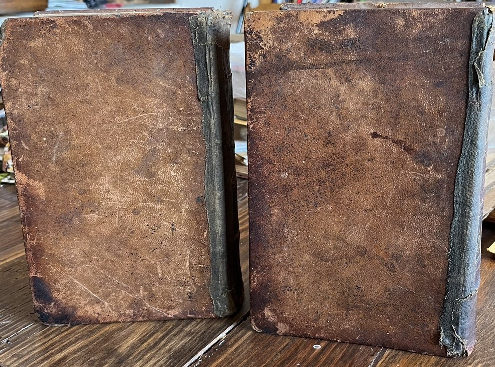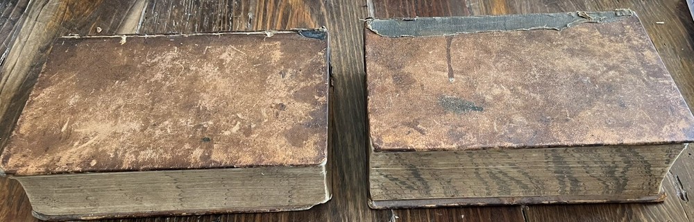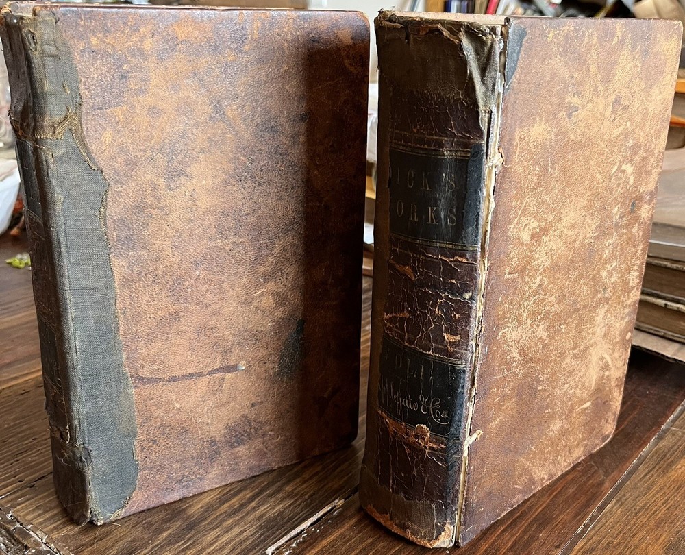 A well-worn but sturdy 1856 illustrated leather-bound two-volume set with plenty of signs of wear and conservation, both recent and long-ago to cover and hinges, including repair and archival tape over some hinges. Text block shows some doxing but is complete, solid, and completely free from markings/marginalia.