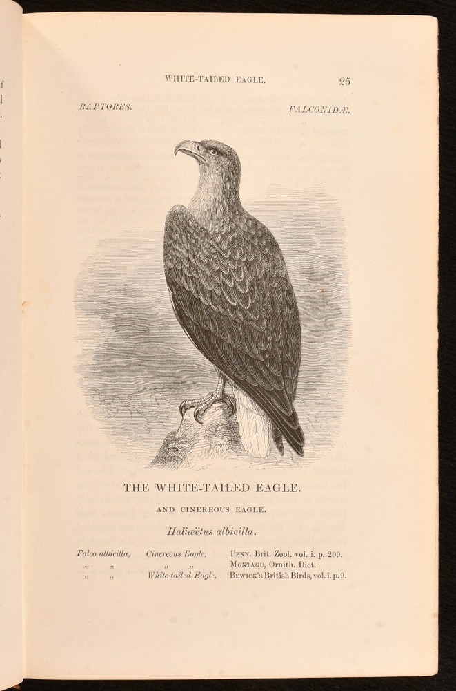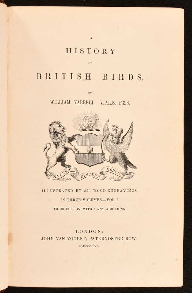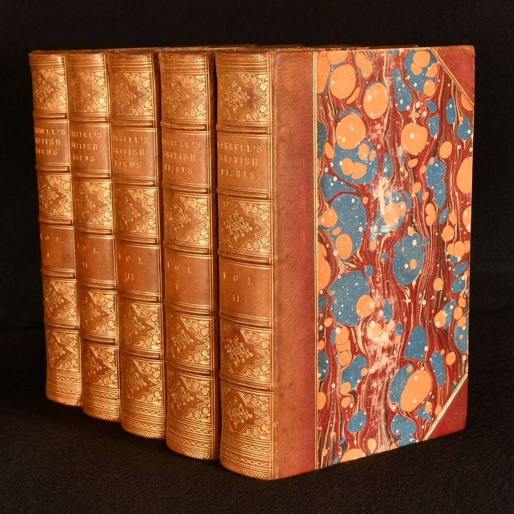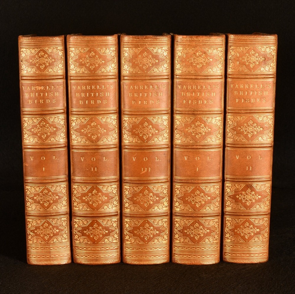 Click here to see our other books! A History of British Birds & A History of British Fishes William Yarrell 1856-1859 John Van Voorst : London 9" by 6" xxxv, 614; 702; 679; xxxviii, 675; 670pp. SUMMARY A smart set of William Yarrell's important works on British birds and British fishes, with illustrations. Illustrated,Leather Binding Overall Condition: Very Good This book weighs 3 KG when packed UK Postage: £ 3.99 US Postage: £ 36.99 EU Postage : £ 25.99 European Postage: £ 27.99 Asia Postage: £ 47.99 Worldwide Postage: £ 69.99 DESCRIPTION Five volumes. Written by William Yarrell, an English zoologist, prolific writer, bookseller and naturalist admired for his precise scientific work. This set includes: A History of British Birds, 1856. Third edition, with many additions. Complete in three volumes. Illustrated with five hundred and fifty wood-engravings. A catalogue of British bird species, with descriptions of each individual species' habits, habitats, plumage, song, and history. Includes a detailed study of the natural history of bird-life in Britain and the changing visitors to the isles. A History of British Fishes, 1859. Third edition. Complete in two volumes. Illustrated with five hundred and twenty-two wood-engravings. A catalogue of British fish species, with descriptions of the habits, feeding, mating, and locations of each species. Includes a memoir of the author, as well as important historical commentary on the changes in fish species over the ages. Edited by Sir John Richardson, a Scottish naval surgeon, naturalist and Arctic explorer. Previously held in the library of Evelyn Baring, 1st Earl of Cromer, a British statesman, diplomat and colonial administrator. CONDITION Bound in half red calf with marbled boards. Externally, very smart with light rubbing to the extremities and the odd small mark to the boards. Fading to the spines. Small cracks to the joints with a 2" crack to the front joint of volume II of A History of British Birds. Front hinge failed to volume I of A History of British Birds with the rear hinge starting but firm. The front hinge of volume II of A History of British Birds is tender. Internally, firmly bound. Pages are very bright and clean with the odd spot. Minor age toning to the endpapers. Previous owner's bookplates to the front endpaper and pastedown. Overall Condition: Very Good GLOSSARY OF TERMS Overall Condition (Dustwrapper condition rating is shown after that for the book itself, where a dustwrapper is present) Fine - Very well preserved copy showing very little wear Very Good Indeed - Only one or two minor faults, really a very attractive copy Very Good - Quite a wide term meaning no major faults but probably several smaller ones often expected given the age of the book, but still a respectable copy Good - Meaning not very good. Some more serious faults as will be described in the condition report under 'condition' Good Only - Meaning one or more faults that could really do with repair Fair - As with good only above but with other faults leaving a compromised copy even after repair Poor - Really bad and possibly seriously incomplete. We only sell books in this condition where their rarity or value makes them attractive none the less. Major defects will be described. GUARANTEE We offer a full money back guarantee on our descriptions. Please ask for details and conditions. We prefer PAYPAL. If you pay via PAYPAL we will post the item off the same or the next working day with the postage you have selected. Please note we cannot accept USD cheques