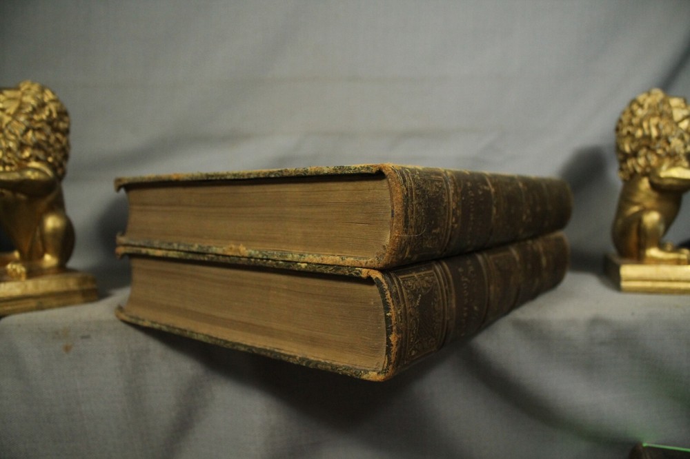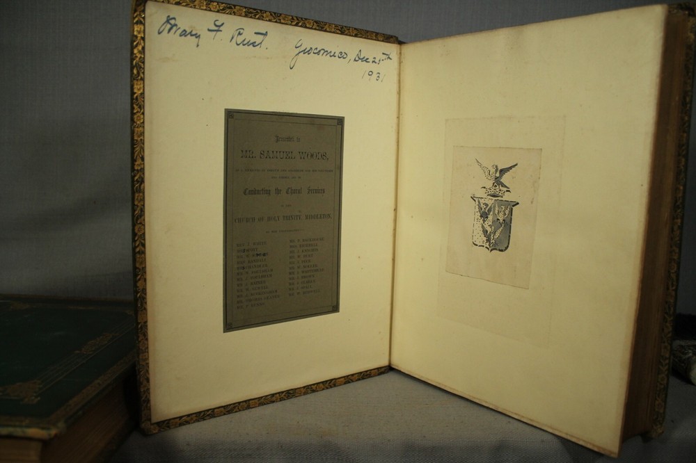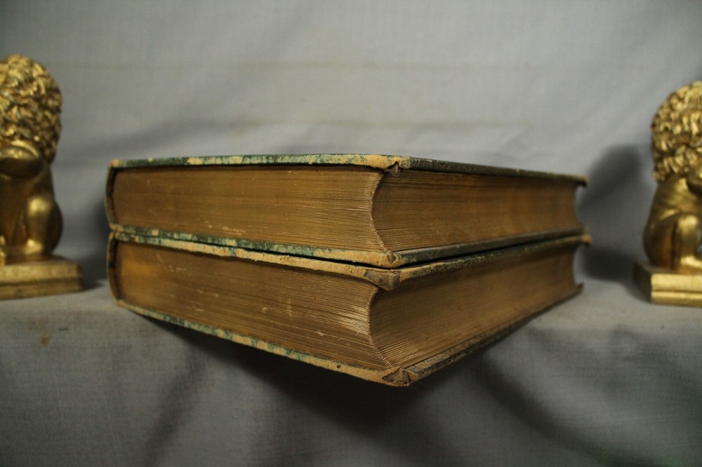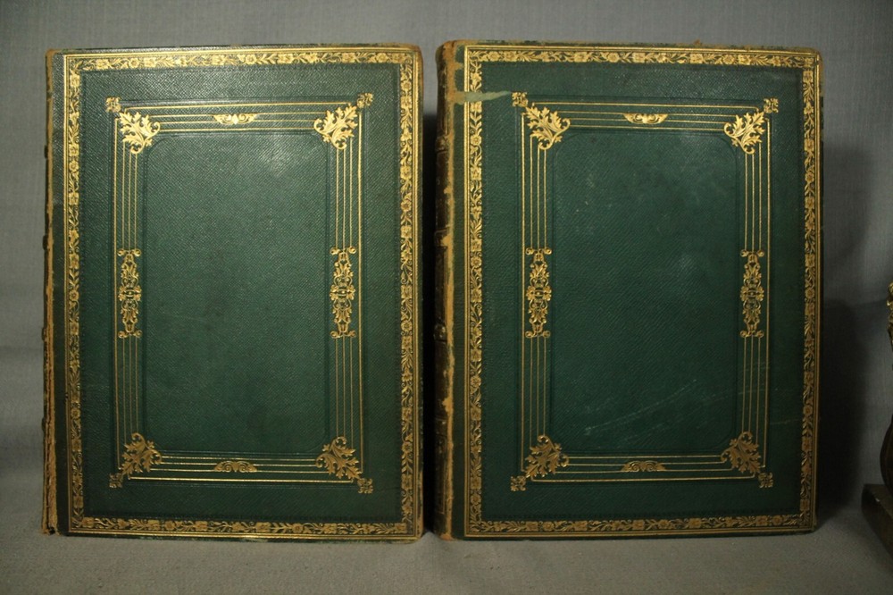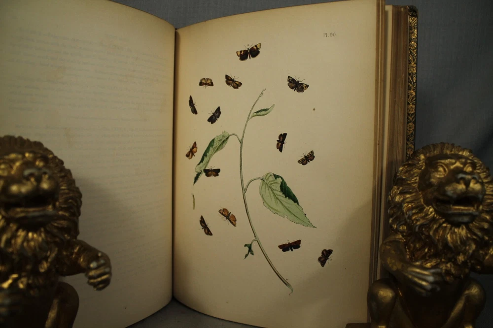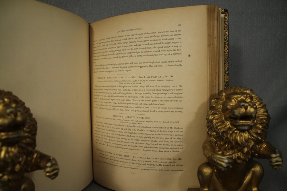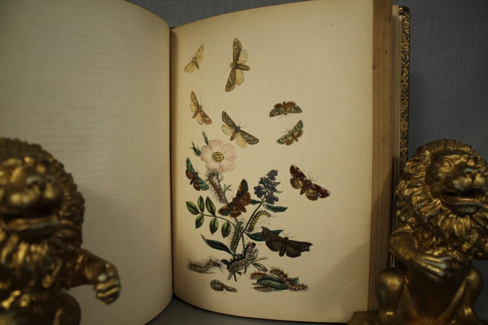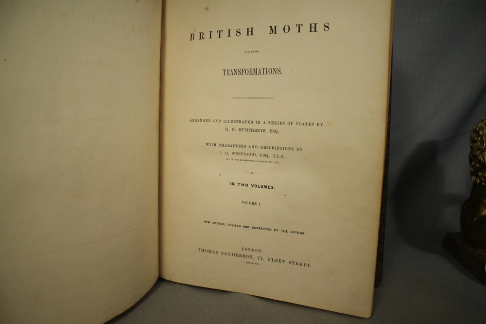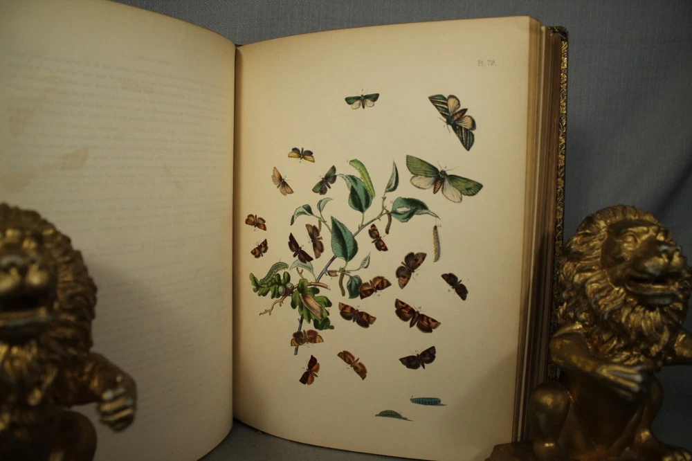 British Moths and their Transformations arranged and illustrated in a series of plates by H. N. Humphreys, esq. with characters and descriptions by J. O. Westwood, esq. F.L. S. sec. of the Entomological Society, in two volumes. Two volume set published by Thomas Sanderson, 77, Fleet street. London 1857 Books measure 11 1/4" by 9" green with gold decorations leather bindings have wear, edge wear, bumped/worn corners, rubbing, scuffing, wear along spine edges. vol 2 has some splitting along front spine edge. spine faded to a neutral brown color. names /writing on endpapers. book plate/presentation plate to Mr Samuel Woods( Original owner ?) from Church of Holy Trinity, Middleton. also coat of arms plate on blank page. pages overall very good/clean with light yellowing/age toning. great reading/reference/study/decorating/gift.. books would look great on your home library/office bookshelf. please look at the photographs loc. upstairs hall.. yes.