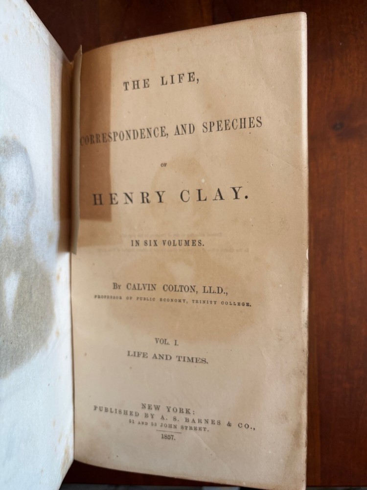 The Life, Correspondence, and Speeches of Henry Clay (Complete Six Volume Set) By Henry Clay and Calvin Colton Published: A.S. Barnes and Co., New York, 1857. Complete Six Volume Set. Condition of bindings are very POOR. This set would essentially require a professional rebind. Covers are detached on most volumes and the leather is mostly gone on most volumes as well. The rear board for Volume One (pictured individually) is in the worst condition. An important work not commonly found as a complete set. Vols 1-3 are biographical; vol 4 is correspondence; vols 5-6 are speeches. All volumes have tables of contents. Vols 2, 3 and 4 have indexes (vol 2 index is for vols 1 + 2). 8vos, 3,439 total pp (paged: 504, 504, 504, 639, 656, 632). See, OCLC #883842521 I've done my best to describe the books, but if you have additional questions, please don't hesitate to send me an e-mail.