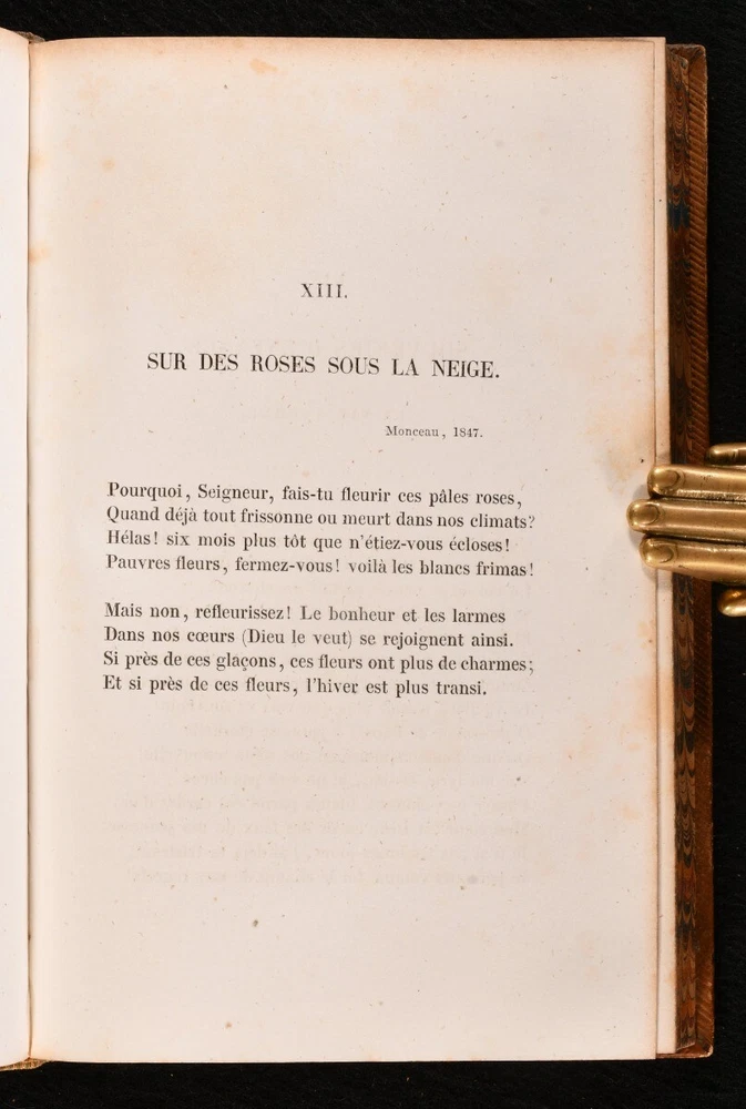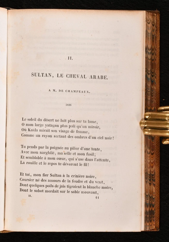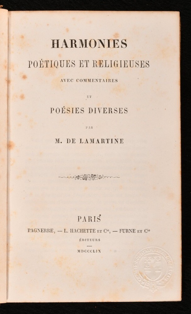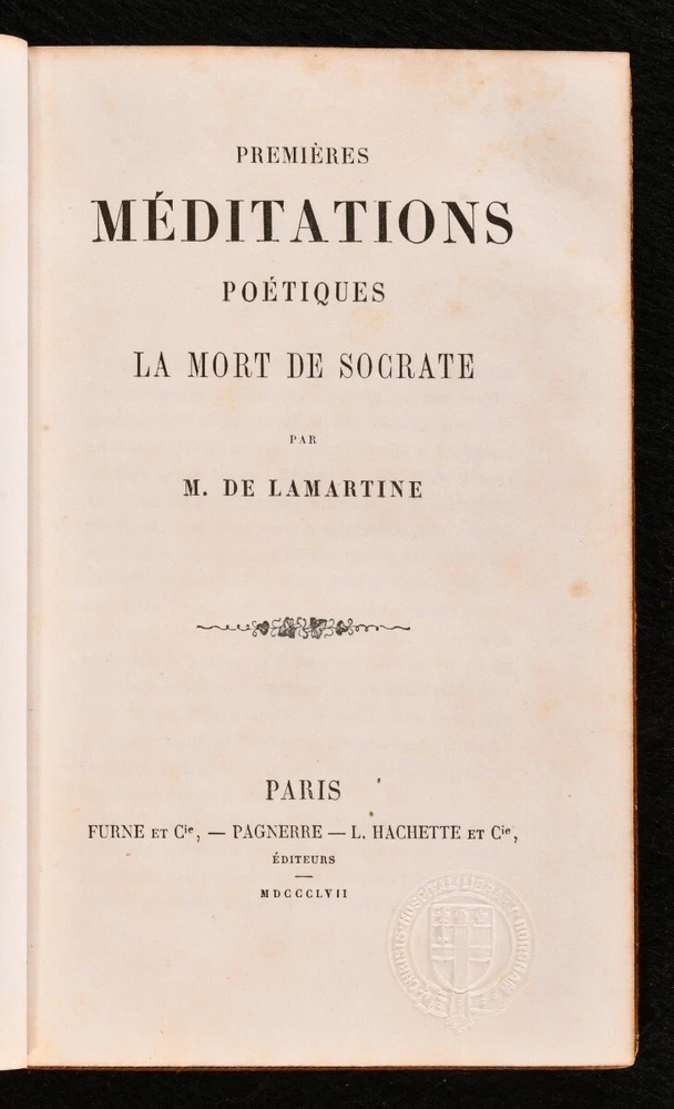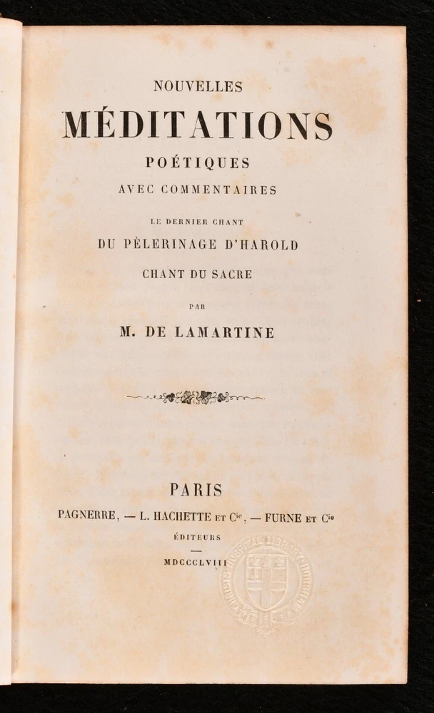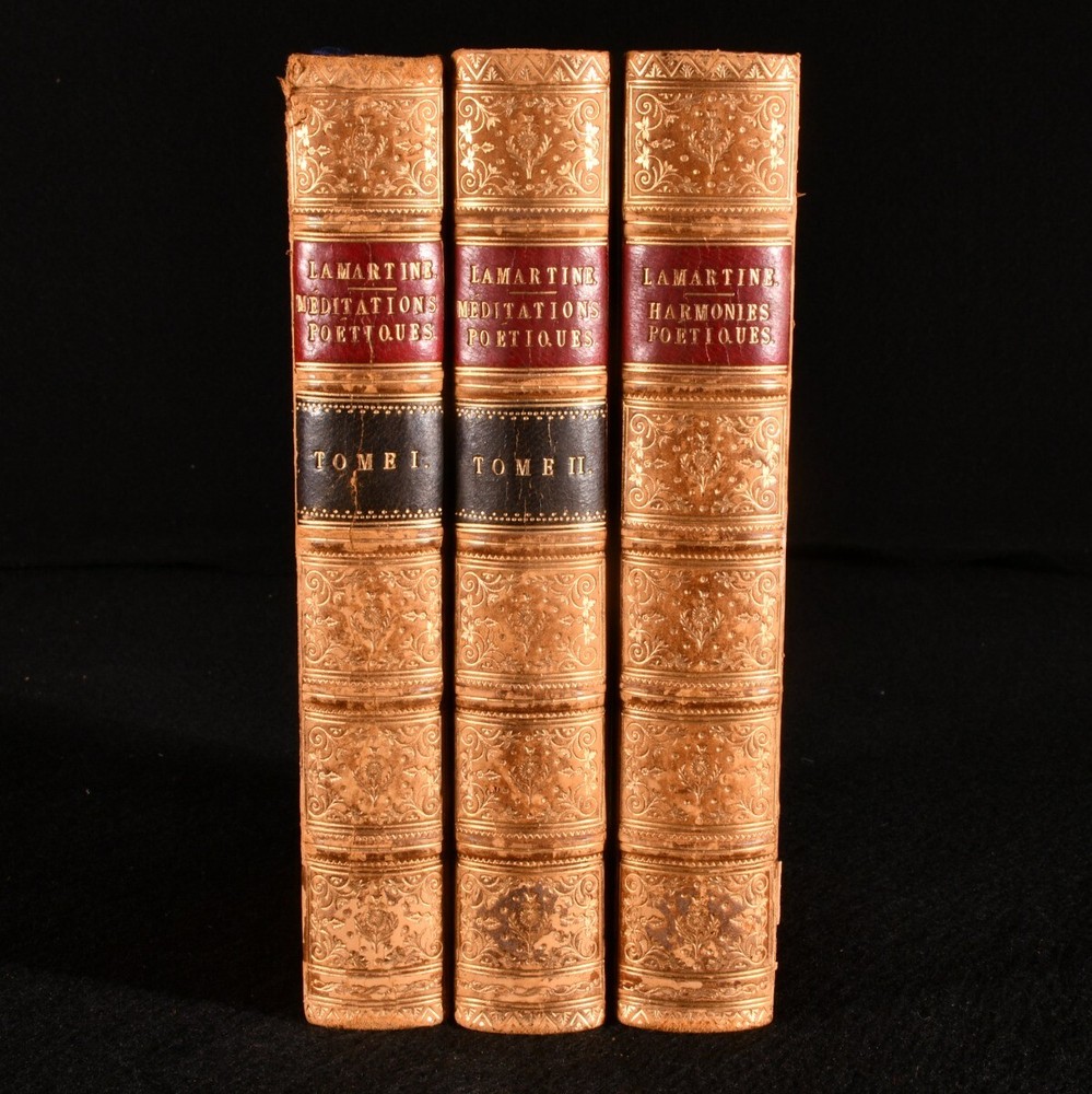 Click here to see our other books! Meditations Poetiques de Lamartine M. de Lamartine 1857-59 Furne et Cie, Pagnerre, L. Hachette et Cie. : Paris 7.5" by 4.5" 390; 427pp SUMMARY A smart set of selected poetical and literary works by French writer Alphonse de Lamartine, handsomely bound in full calf prize binding from Christ's Hospital. Leather Binding,Prize Binding,Rebound Overall Condition: Very Good This book weighs 1 KG when packed UK Postage: £ 3.99 US Postage: £ 22.99 EU Postage : £ 16.99 European Postage: £ 17.99 Asia Postage: £ 22.99 Worldwide Postage: £ 28.99 DESCRIPTION A two volume set of selected literary works of early nineteenth-century French author Alphonse de Lamartine. Including three volumes: I. Premieres Meditations Poetiques, La Mort de Socrate , published in 1857 II . Nouvelles Meditations Poetiques, Le Dernier Chant du Pelerinage d'Harold, Chant du Sacre , published in 1858 III. Harmonies Meditations Poetiques Avec Commentaires et Poesies Diverses , published in 1859 Originally published in the 1820s, these works are poetical in nature, and are very much in the post-Revolutionist emotional style, evoking strong personal lyricism and grappling with the themes of life, death, and memory. These works have been handsomely bound in full calf prize binding from Christ's Hospital. Their coat of arms can be found to the front boards, and a prize bookplate to each front pastedown. There is also a library stamp and sticker to each pastedown from Christ's Hospital School Library. CONDITION Handsomely bound in full calf prize binding, with gilt detailing to the spine and front boards. Externally, smart, with some rubbing to the joints, spines, and extremities. General shelf wear and remnants of sticker adhesive the tail of the boards. Rear joint to 'Meditations Poetiques' is starting to the head, resulting in a small amount of lifting to the binding at the head of the joint. A few marks to the boards. 'Harmonies Poetiques' does not include a 'Tome III' spine label. Prize bookplate and library stamp and sticker to the front pastedown of each volume, and a library stamp to one of the front free-endpapers and title page of each volume. Internally, front hinges to 'Meditations Poetiques' and 'Harmonies Poetiques' are strained but firm. All volumes are firmly bound. Instances of scattered spots to the pages, though many pages do remain bright and clean. Overall Condition: Very Good GLOSSARY OF TERMS Overall Condition (Dustwrapper condition rating is shown after that for the book itself, where a dustwrapper is present) Fine - Very well preserved copy showing very little wear Very Good Indeed - Only one or two minor faults, really a very attractive copy Very Good - Quite a wide term meaning no major faults but probably several smaller ones often expected given the age of the book, but still a respectable copy Good - Meaning not very good. Some more serious faults as will be described in the condition report under 'condition' Good Only - Meaning one or more faults that could really do with repair Fair - As with good only above but with other faults leaving a compromised copy even after repair Poor - Really bad and possibly seriously incomplete. We only sell books in this condition where their rarity or value makes them attractive none the less. Major defects will be described. GUARANTEE We offer a full money back guarantee on our descriptions. Please ask for details and conditions. We prefer PAYPAL. If you pay via PAYPAL we will post the item off the same or the next working day with the postage you have selected. Please note we cannot accept USD cheques