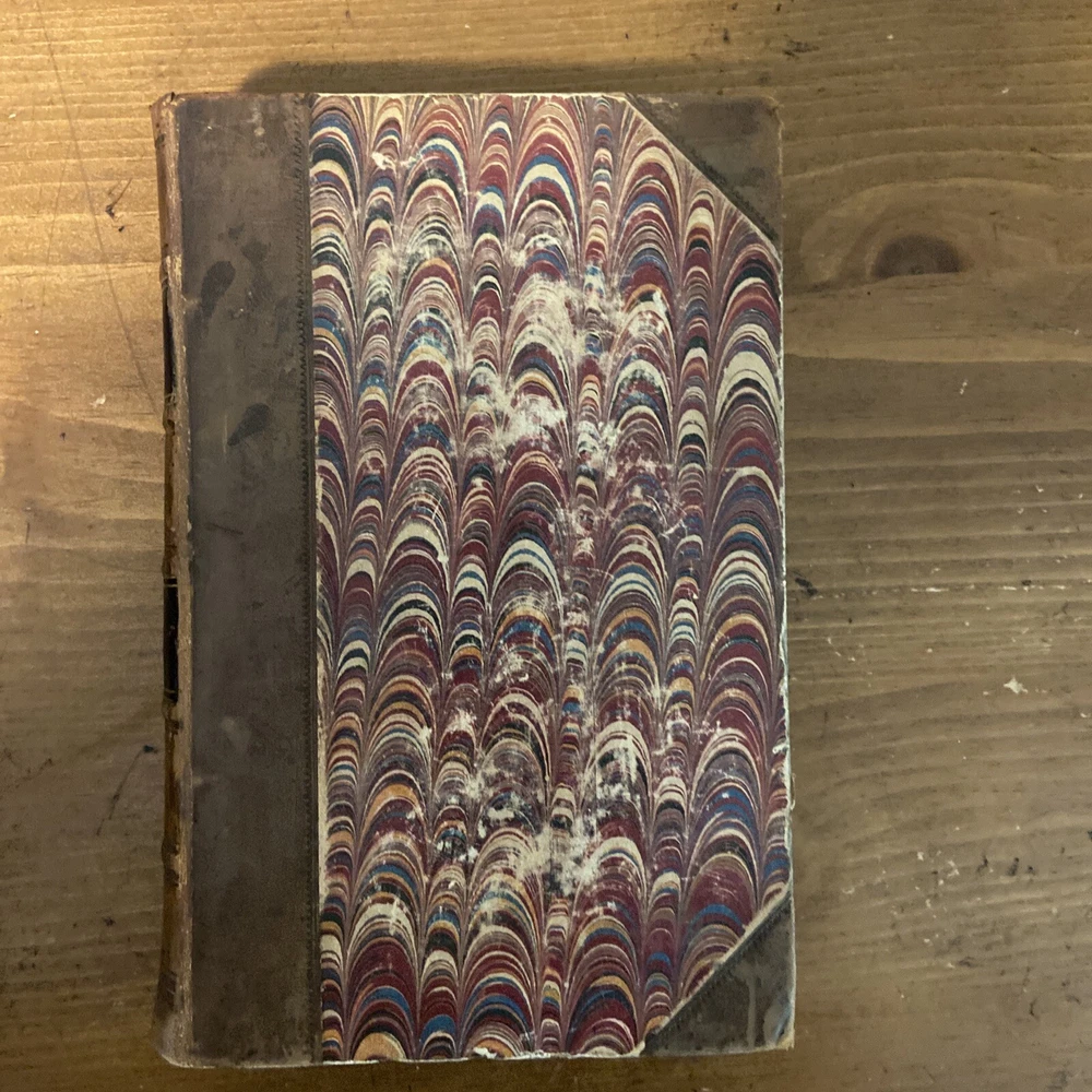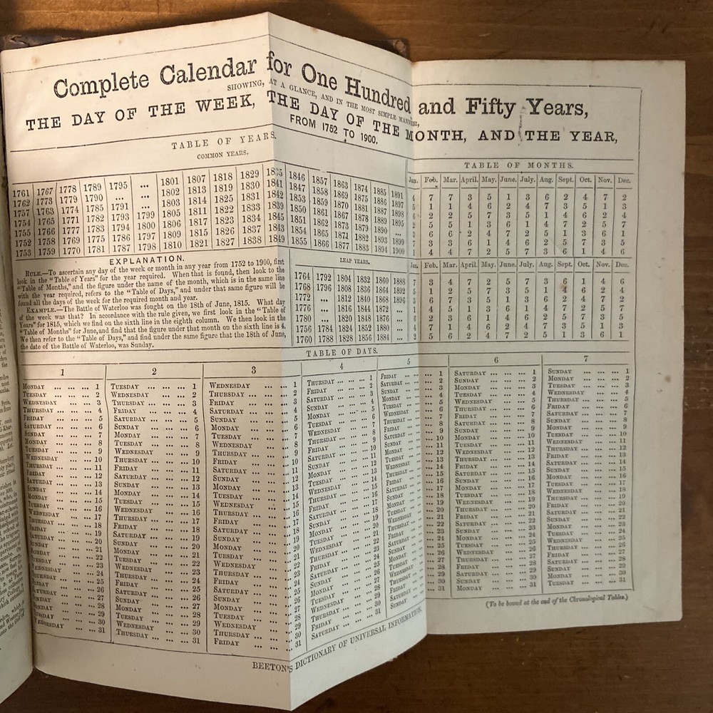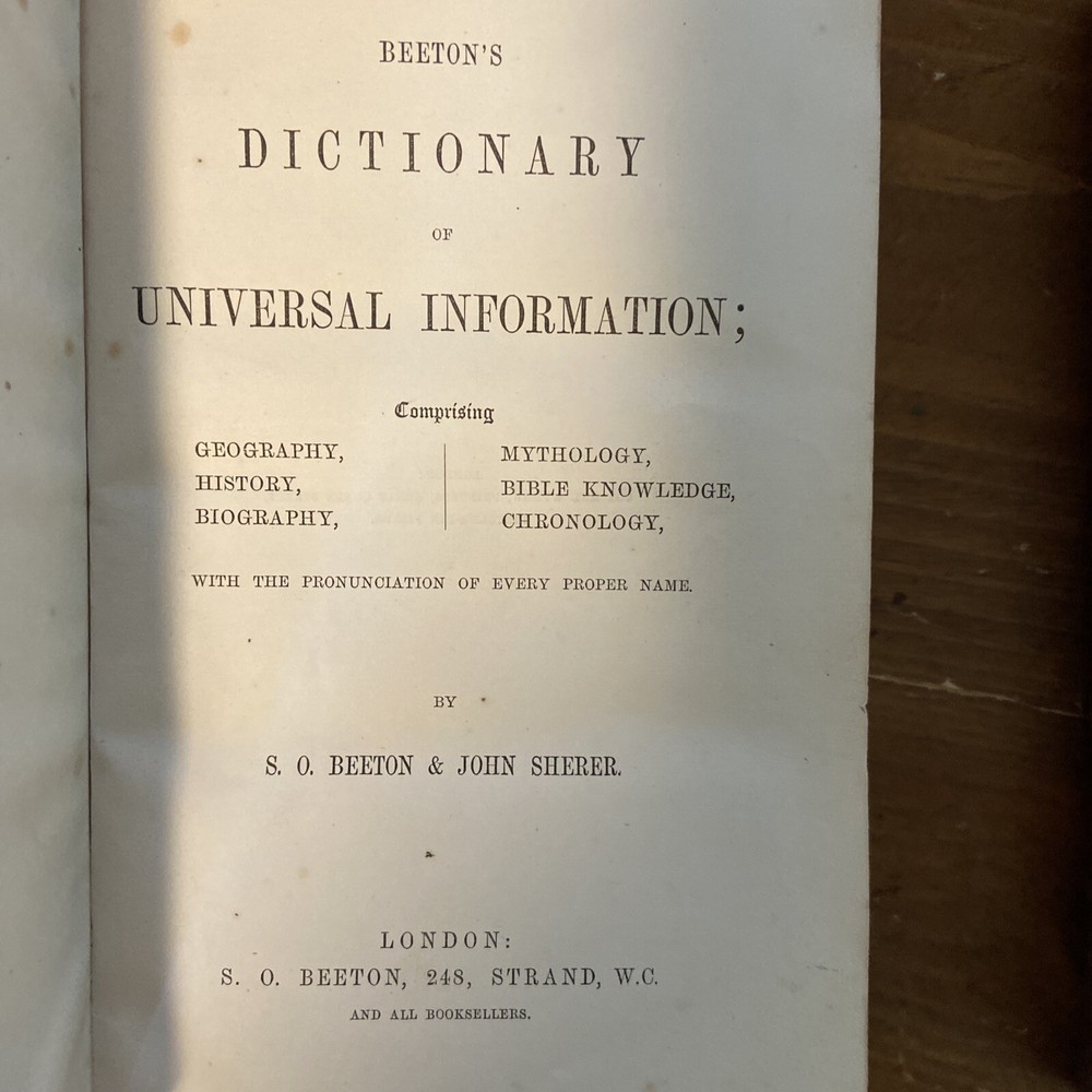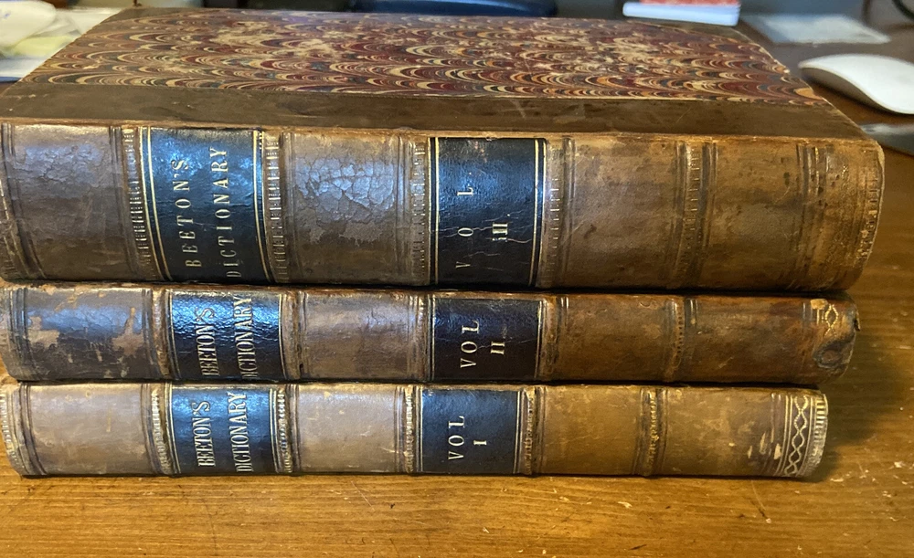 1859 Beeton’s Dictionary 3 vol set. 8.75 x 5.5 inches. 1/2 leather binding with marbled boards in very good condition. Volume I 384 pages. Volume II through 708 pages and Volume III 1412 pages plus 52 page Chronological Table. Contents secure and well preserved.