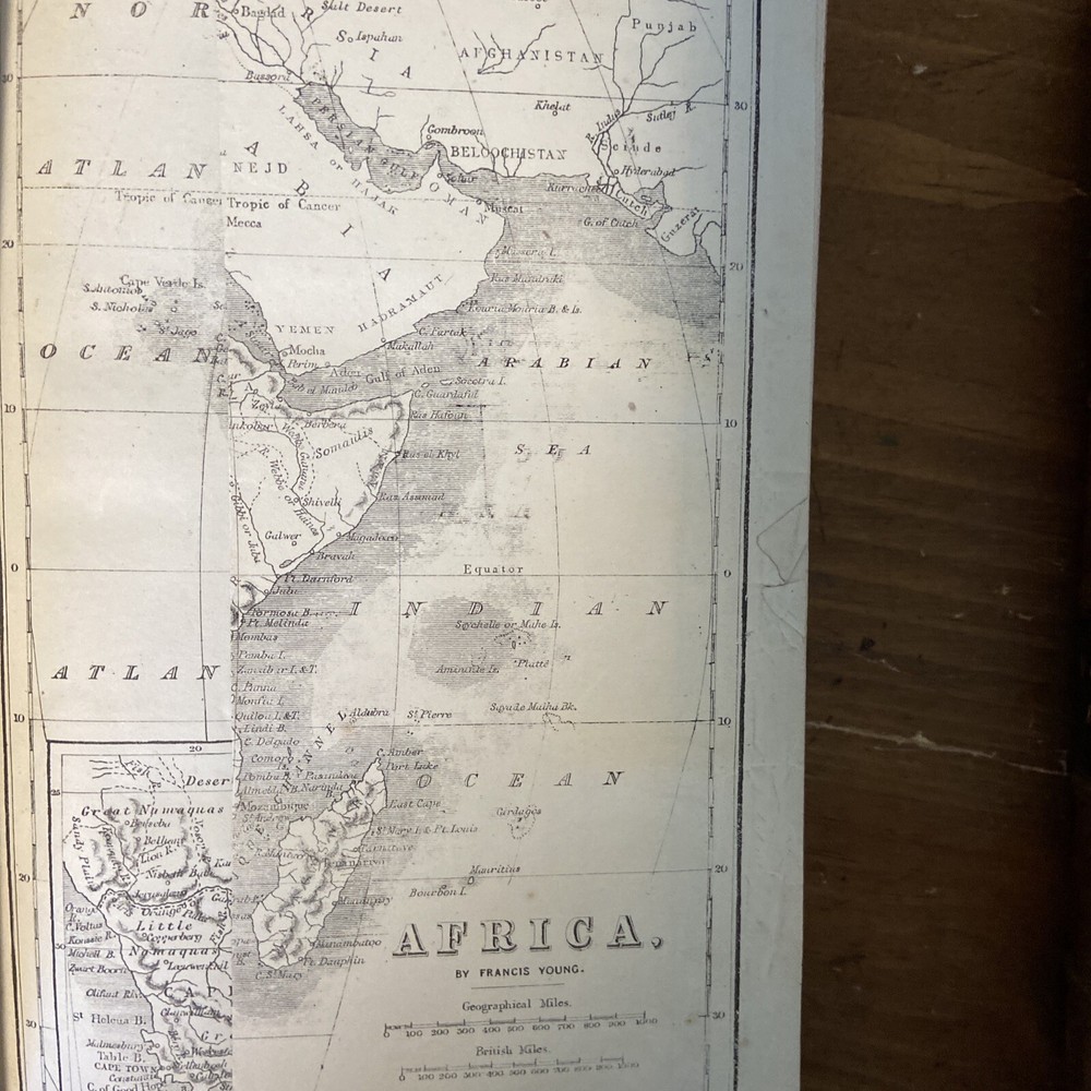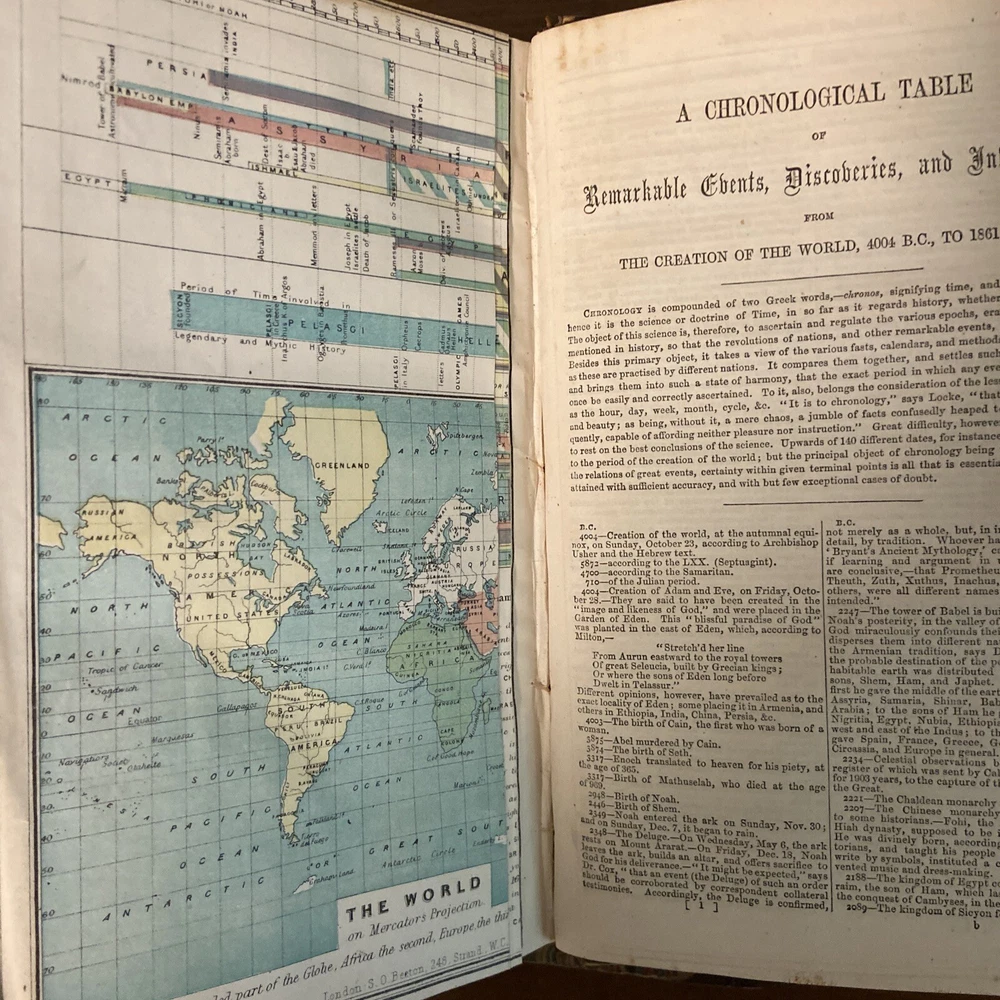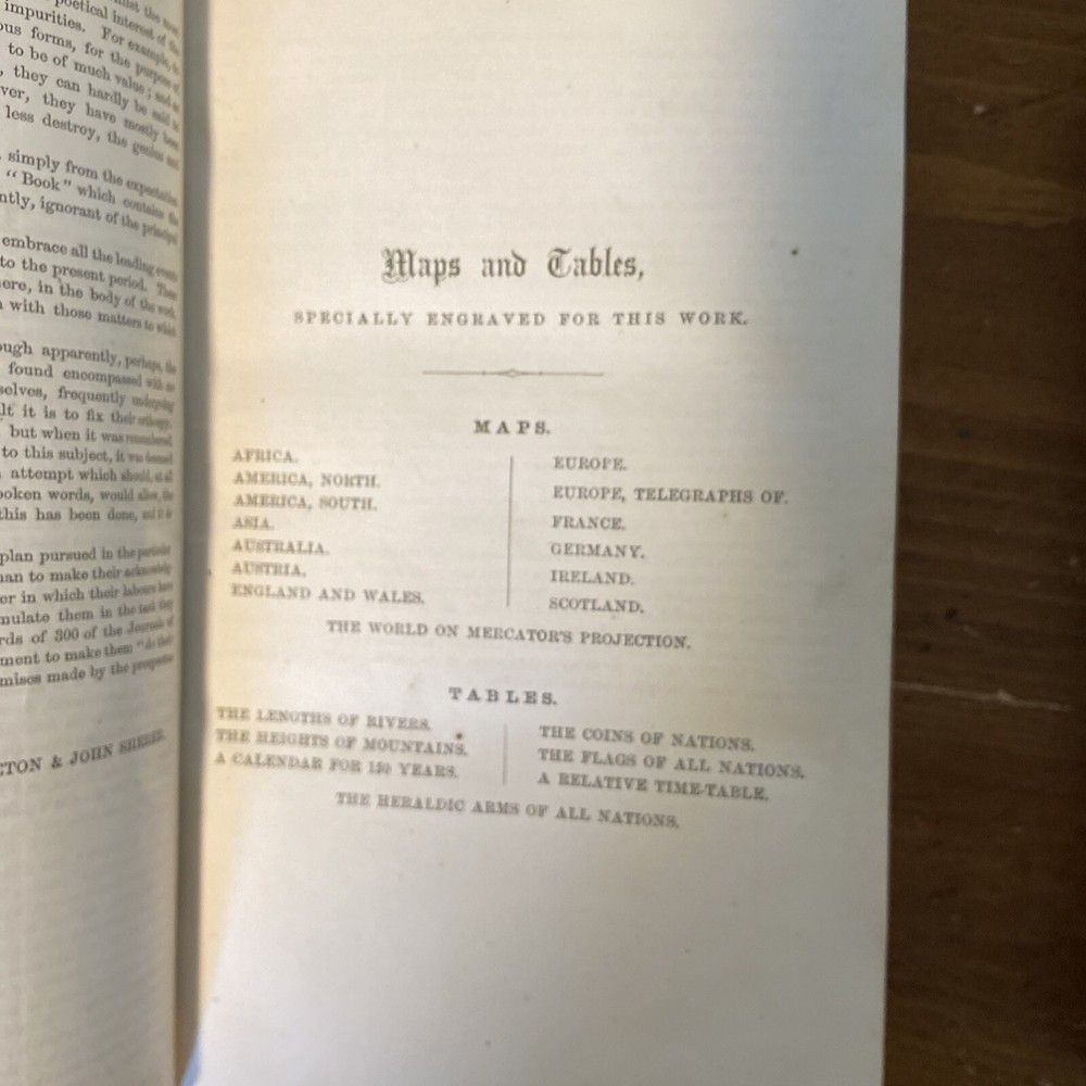 1859 Beeton’s Dictionary 3 vol set. 8.75 x 5.5 inches. 1/2 leather binding with marbled boards in very good condition. Volume I 384 pages. Volume II through 708 pages and Volume III 1412 pages plus 52 page Chronological Table. Contents secure and well preserved.