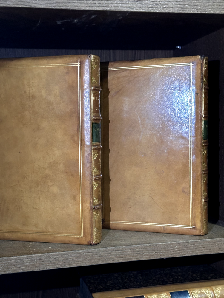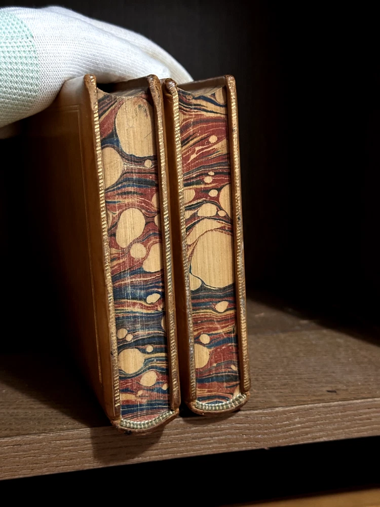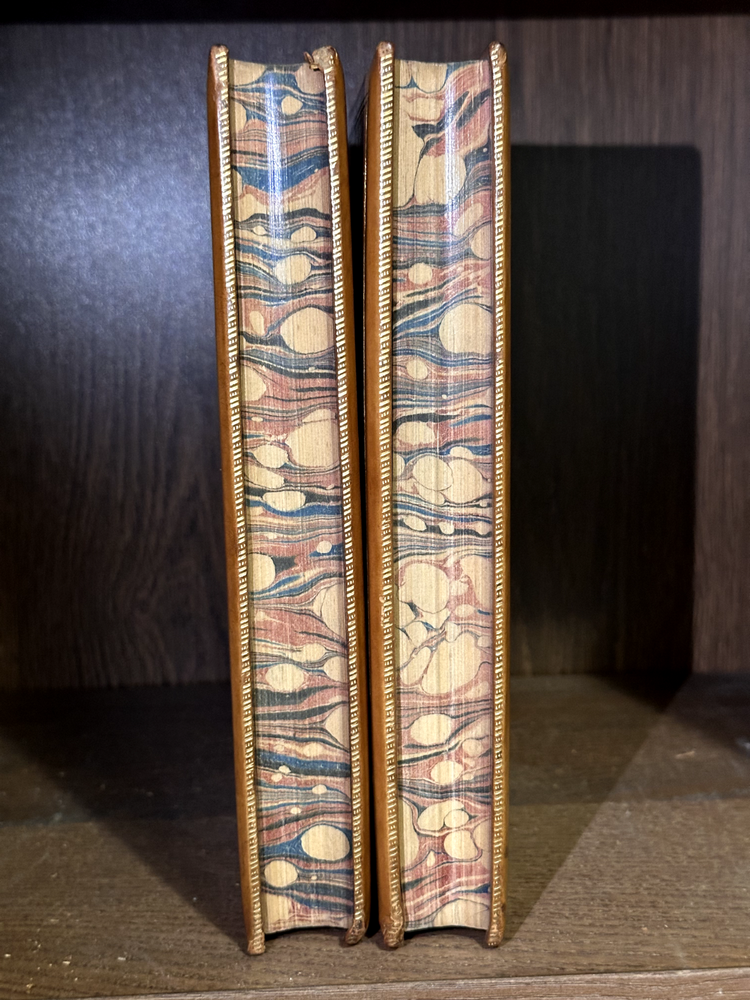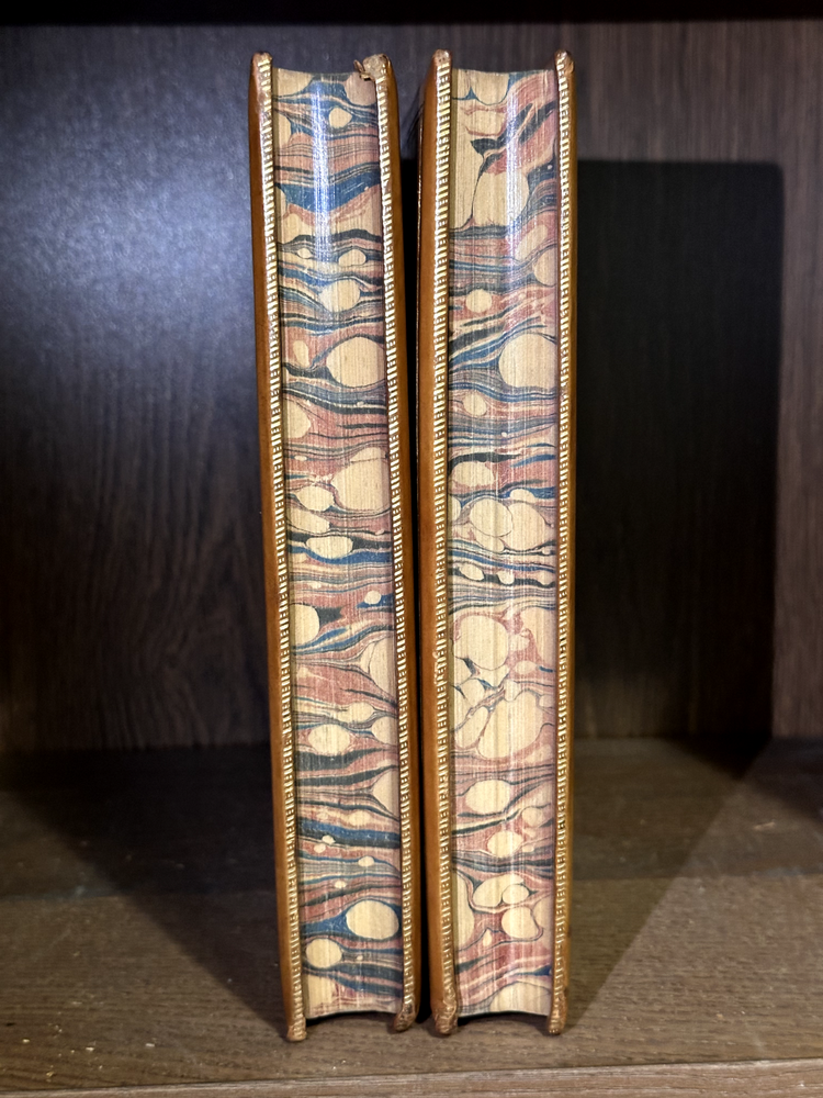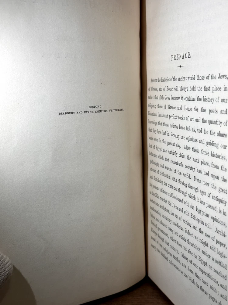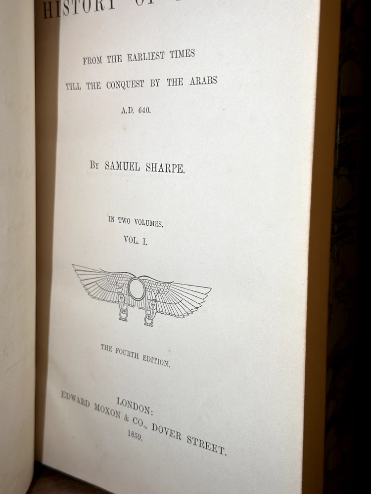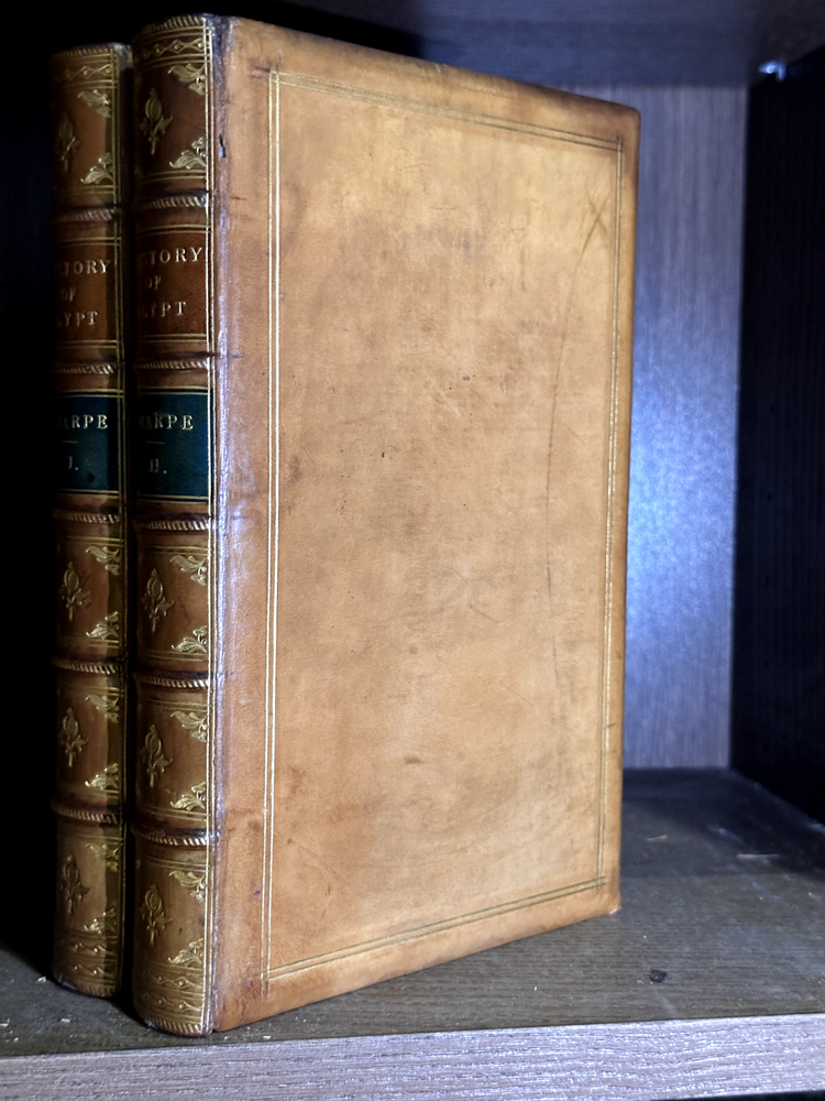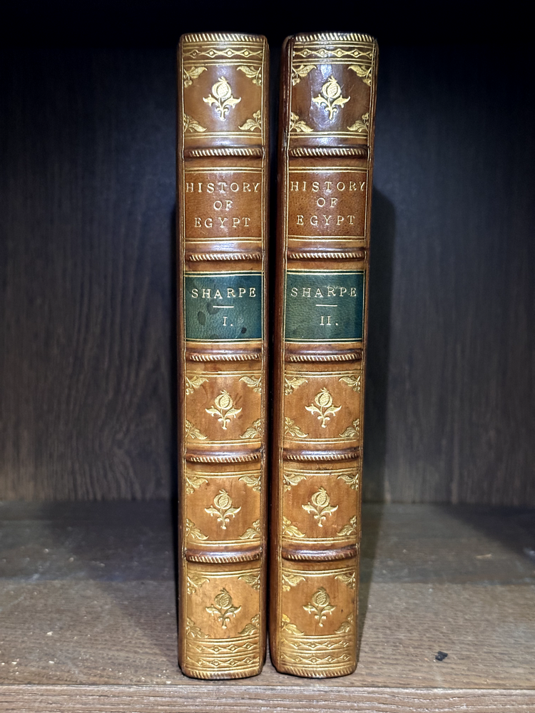 This is a 2 volume set of Samuel Sharpe's HISTORY of EGYPT FROM THE EARLIEST TIMES TILL THE CONQUEST BY THE ARABS A.D. 640, in 2 volumes. FOURTH EDITION. Printed in London, by Edward Moxon & Company, Dover Street. These volumes are 1 of 1. The book cover is wooden, covered in genuine, delicate calfskin leather. The spines have 5 raised ribs. The spine and ends of the cover are gold tooled by hand. The end pages are beautifully marbled. All sides of the book pages are beautifully marbled. These volumes are VERY, VERY HEAVY. Beautiful gold tooling on the spine. The author's name is written on a green colored leather, in gold letters. Printed on archival quality, acid-neutral paper that will last for centuries. The covers are clean, intact, and tightly bound. The pages are clean. There is a pencil inscription on one of the spare front pages, with a message of dedication, written in 1865. Size: 8.8 x 5.8 inches. Shipping is free to continental United States via Media Mail. International buyers, please ask for a quote before making an offer or purchasing. Check out my other items if you are looking for rare, collectible, antiquarian books.