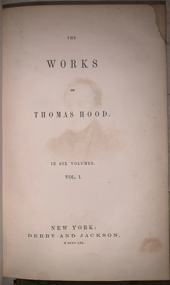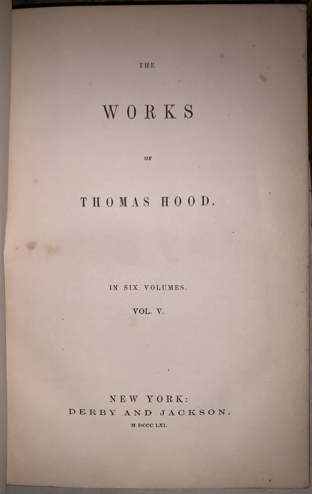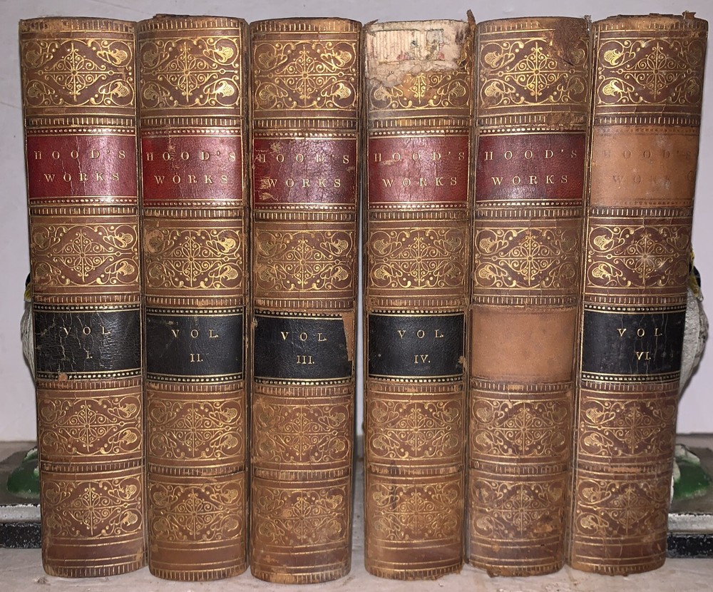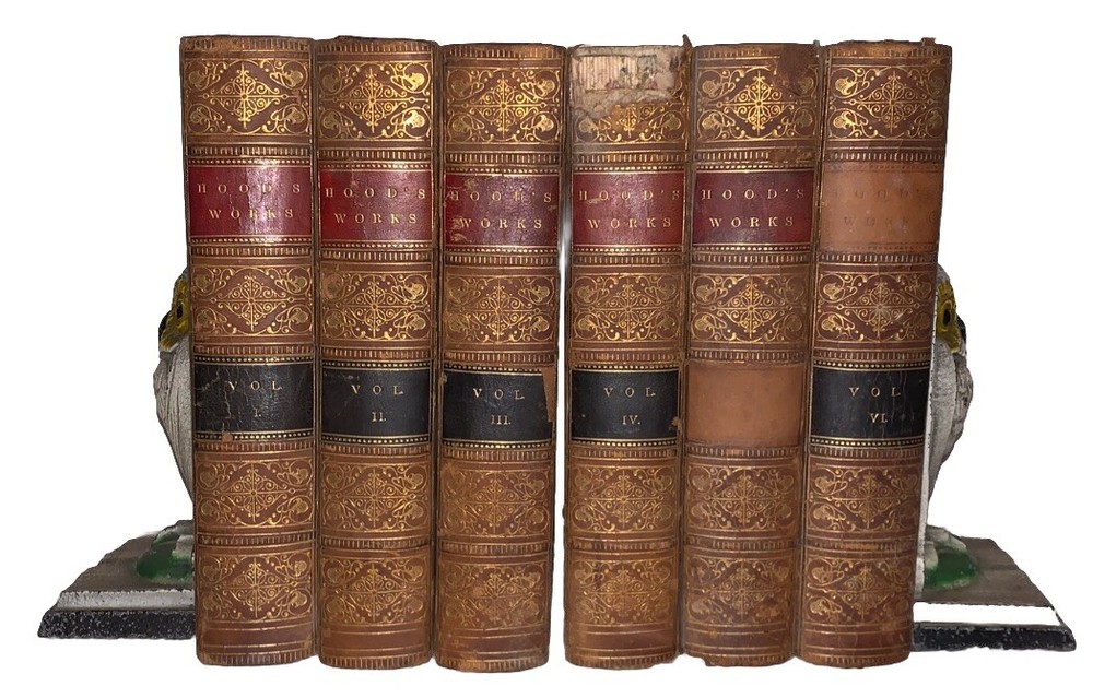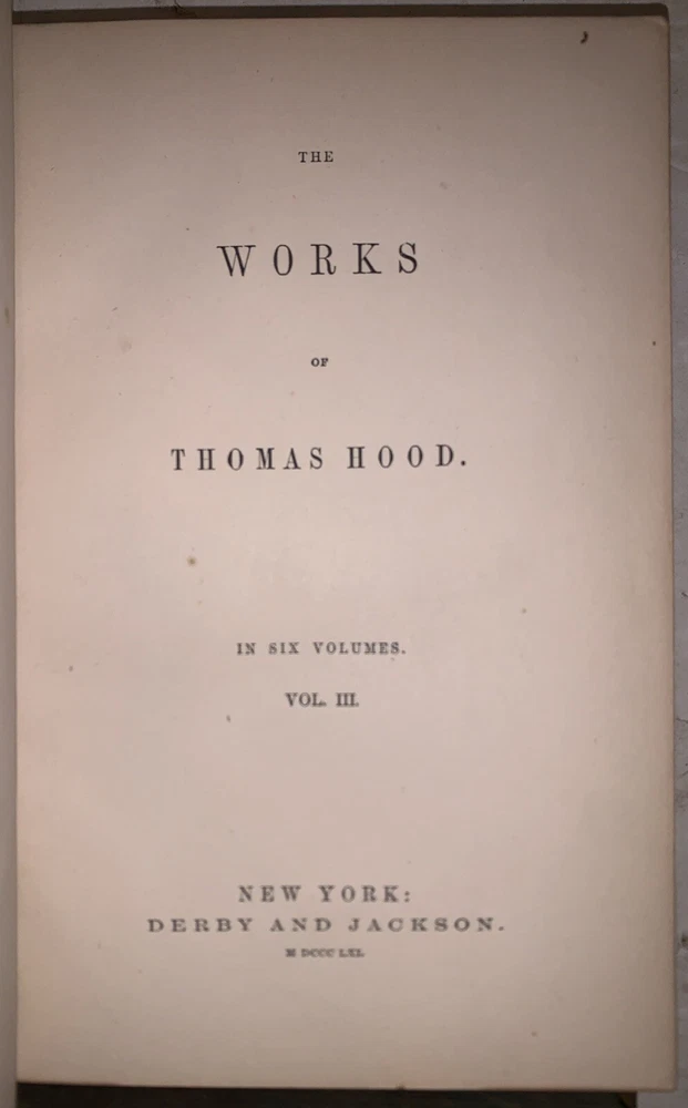 The Works of Thomas Hood In Six Volumes New York: Derby and Jackson 1861 First Edition Thus Six octavos, xxviii, 475p; 488p; 487p; 494p; 496p; 506 pages, bound in period quarter leather over marbled boards. Gilt lettering and decoration to spines. Marbled edges on all six volumes and marbled endpapers in volumes 2 through 6. Some discoloration, damage to a couple of the spines, spine label missing, boards slightly splayed on a few of the volumes, previous owner's inscription, rubbing and wear, else in good + condition. The Works of Thomas Hood is a celebrated collection that showcases the wit, humor, and poetic prowess of Thomas Hood, a 19th-century English poet and satirist known for his distinctive blend of light-hearted verse and dark, often socially conscious themes. The collection includes a wide range of Hood's poetry and prose, from playful puns and whimsical rhymes to poignant reflections on poverty and injustice, capturing his versatility as a writer. Hood's work frequently addresses social issues of his time, such as labor rights and the plight of the working poor, making his voice both timeless and impactful. Notable pieces like "The Song of the Shirt" and "The Bridge of Sighs" highlight his empathetic eye for the suffering of others, while his humorous works reflect a keen wit that made him a favorite in literary circles. The Works of Thomas Hood remains a valuable resource for readers seeking both entertainment and insight into 19th-century social issues. If you have any questions, feel free to ask, and don't forget to check out my other listings.