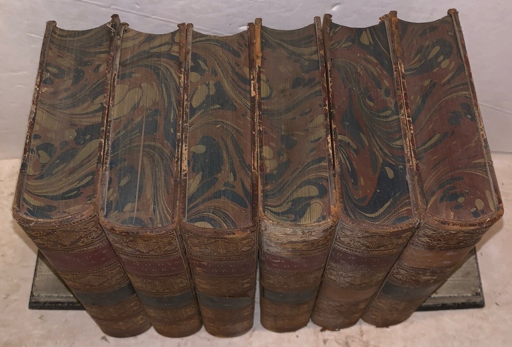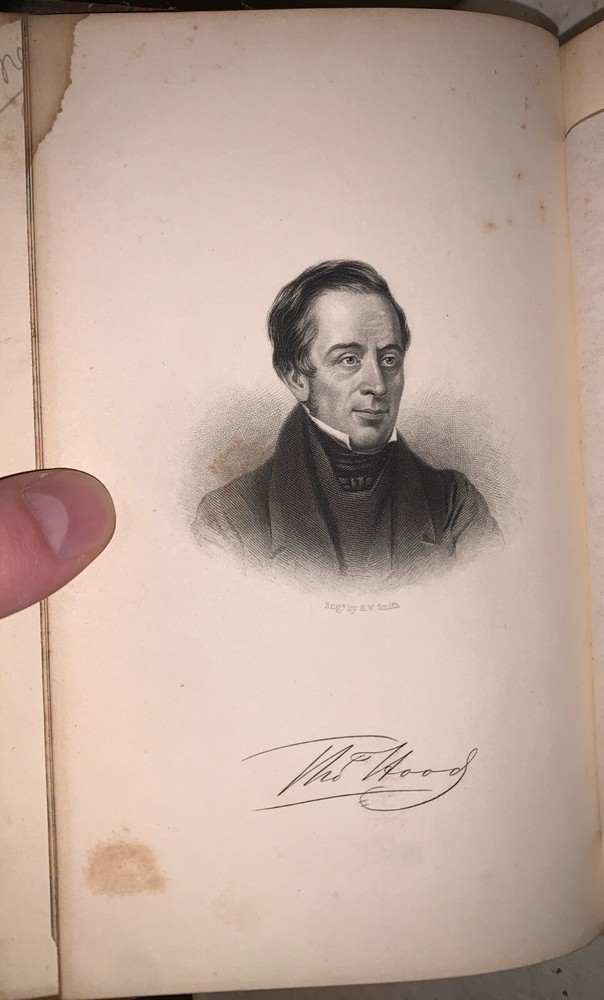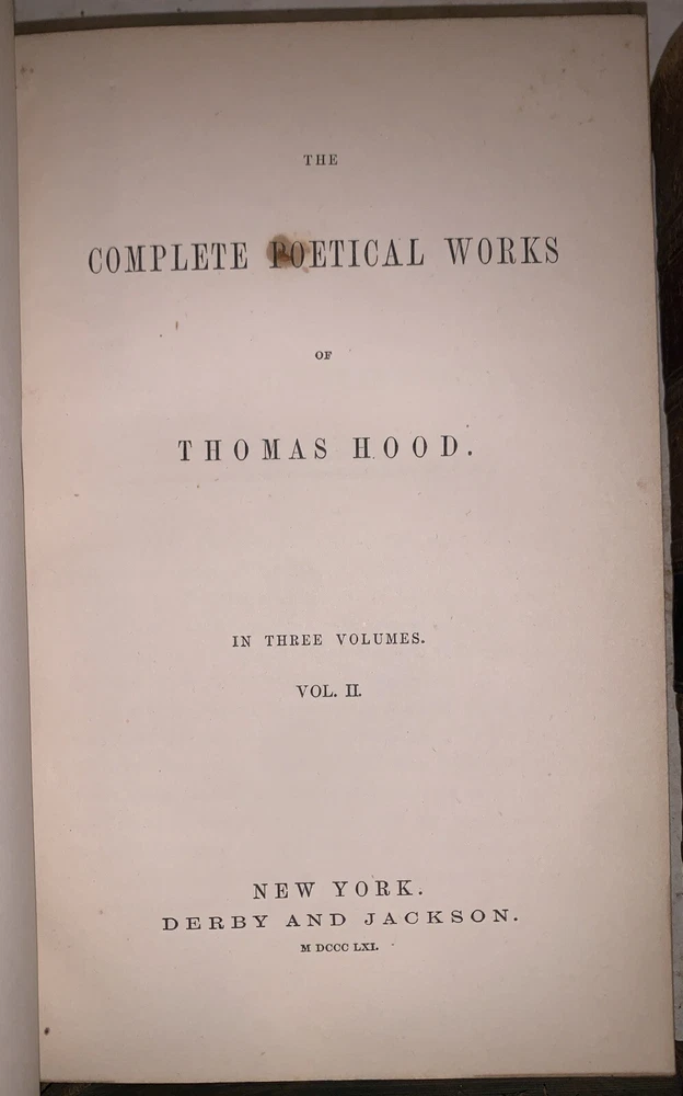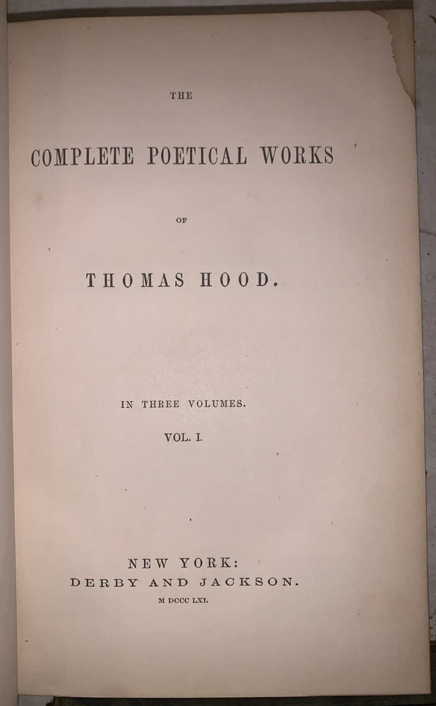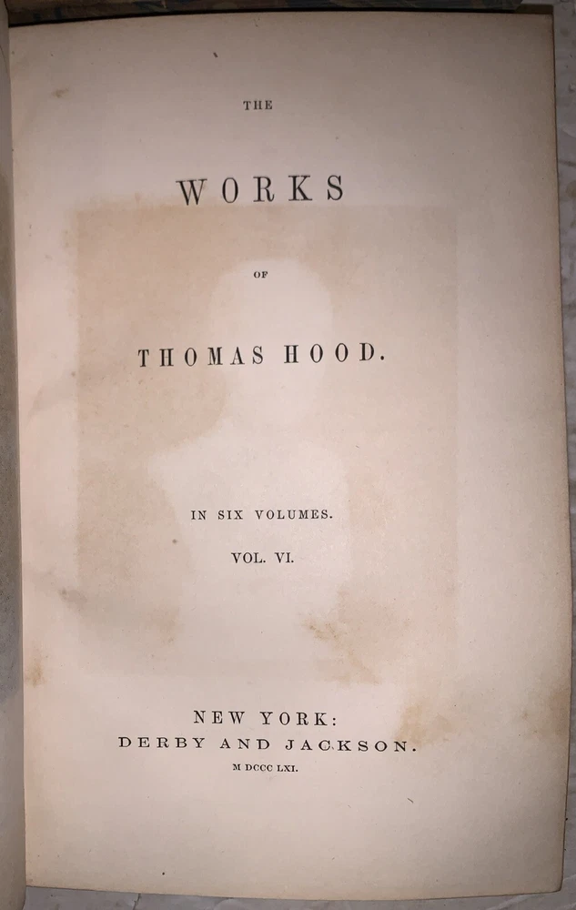 The Works of Thomas Hood In Six Volumes New York: Derby and Jackson 1861 First Edition Thus Six octavos, xxviii, 475p; 488p; 487p; 494p; 496p; 506 pages, bound in period quarter leather over marbled boards. Gilt lettering and decoration to spines. Marbled edges on all six volumes and marbled endpapers in volumes 2 through 6. Some discoloration, damage to a couple of the spines, spine label missing, boards slightly splayed on a few of the volumes, previous owner's inscription, rubbing and wear, else in good + condition. The Works of Thomas Hood is a celebrated collection that showcases the wit, humor, and poetic prowess of Thomas Hood, a 19th-century English poet and satirist known for his distinctive blend of light-hearted verse and dark, often socially conscious themes. The collection includes a wide range of Hood's poetry and prose, from playful puns and whimsical rhymes to poignant reflections on poverty and injustice, capturing his versatility as a writer. Hood's work frequently addresses social issues of his time, such as labor rights and the plight of the working poor, making his voice both timeless and impactful. Notable pieces like "The Song of the Shirt" and "The Bridge of Sighs" highlight his empathetic eye for the suffering of others, while his humorous works reflect a keen wit that made him a favorite in literary circles. The Works of Thomas Hood remains a valuable resource for readers seeking both entertainment and insight into 19th-century social issues. If you have any questions, feel free to ask, and don't forget to check out my other listings.