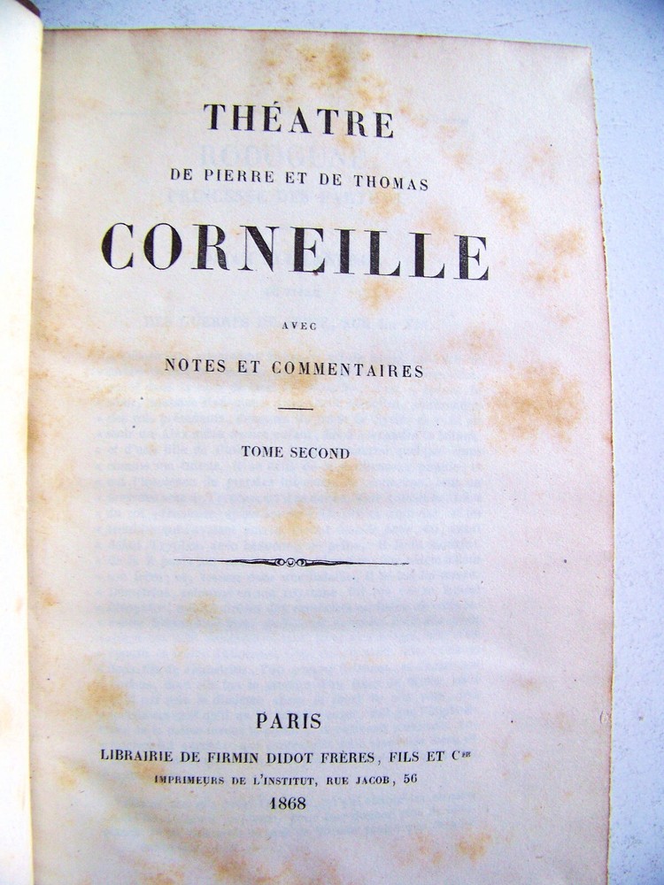 WE'VE PURCHASED ANOTHER TERRIFIC COLLECTION OF BOOKS A LIBRARY FULL OF VINTAGE BOOKS! FIRST EDITIONS SCARCE TITLES A WIDE VARIETY OF TOPICS SO GET COMFORTABLE...GRAB A CUP OF COFFEE...AND ENJOY SHOPPING SCARCE COPY OF THE 1868 FRENCH TEXT EDITIONS TWO VOLUME SET LEATHER BOUND OVER SPINE THEATRE DE PIERRE ET DE THOMAS CORNEILLE BY: ? PUBLISHED BY: FIRMIN DIDOT FRERES