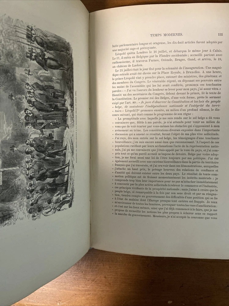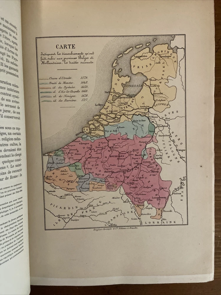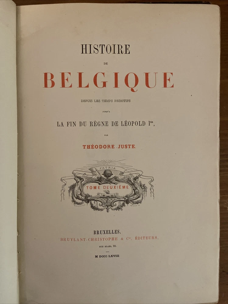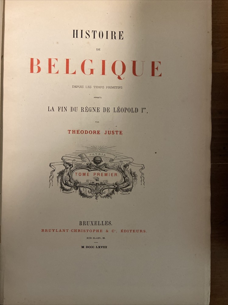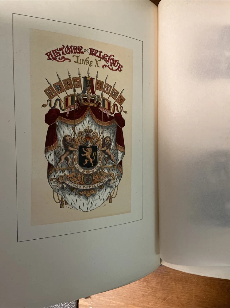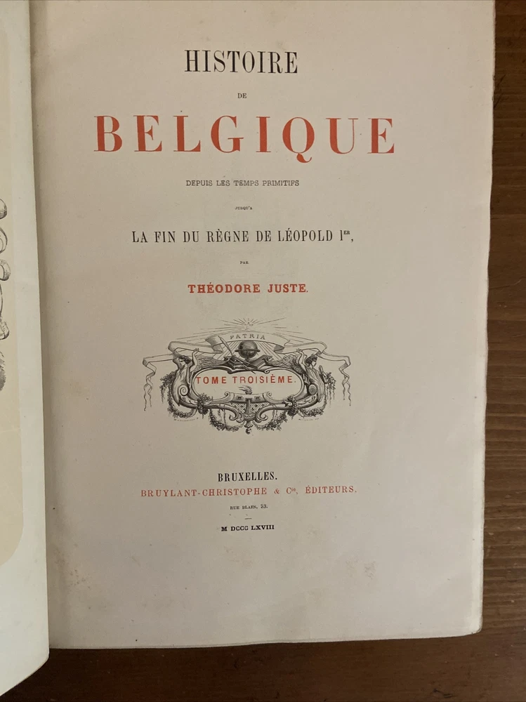 1868 Historie de Belgique 3 vol set; Belgium. Gorgeous 3/4 leather binding with cloth boards in very good plus condition. Marbled pastedowns and endpapers. Volume I shows minor wear to inside hinge but secure - otherwise no issues with volumes. Minor rub to boards and edge wear. Contents overall clean and secure; hint of toning and foxing but nothing distracting. Scarce. Volume I 380 pages. Volume II 360 pages. Volume III 352 pages.