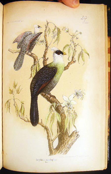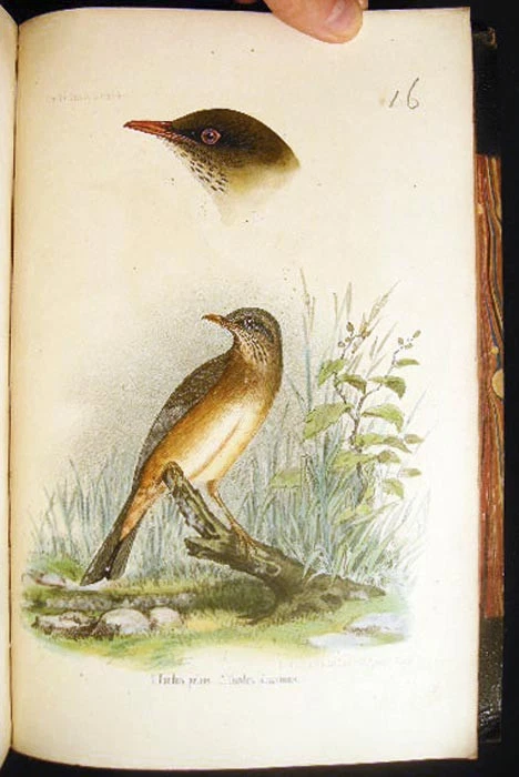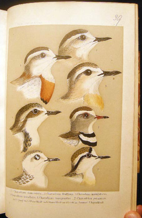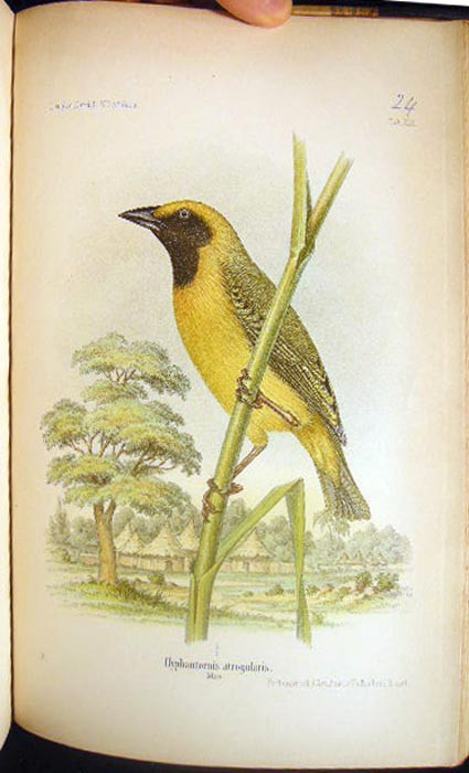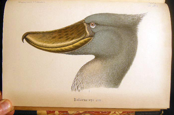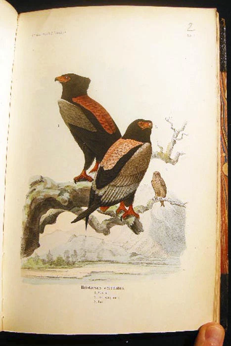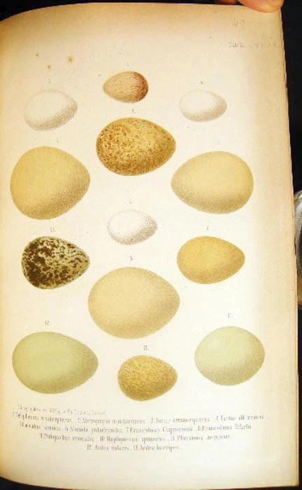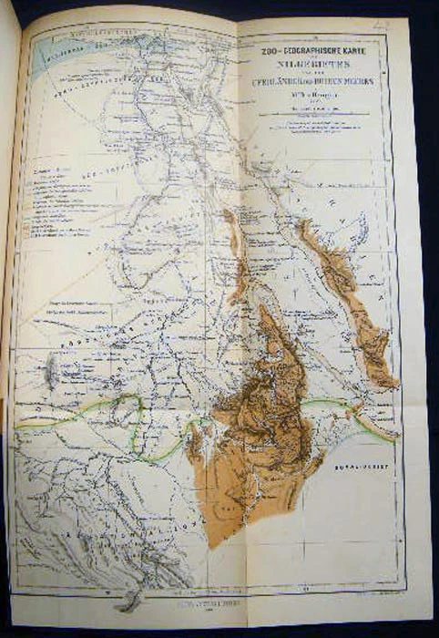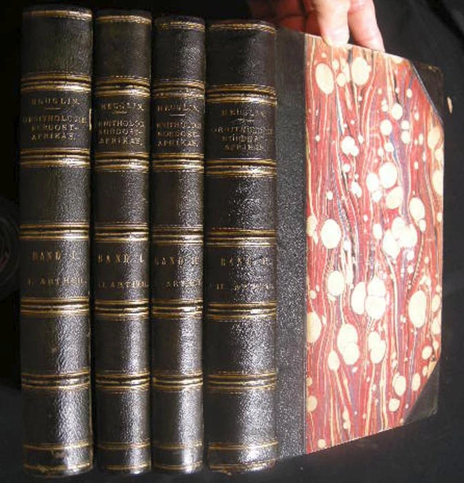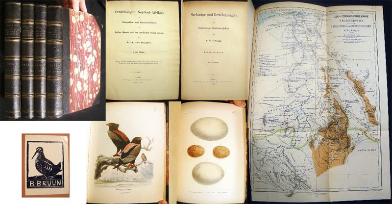 [23066] Von Heuglin, M. Th. Ornithologie Nordost-Afrika's Der Nilquellen-und Kusten-Gebiete Des Rothen Meeres Und Des Nordlichen Somal-Landes. Cassel: Verlag Von Theodor Fischer, 1869. First Edition. cviii + 1512 + cccxxv (index) pages; five parts bound in 4, the fifth part being "Nachtrage und Berichtegungen zur Ornithologie Nordost-Afrika's von M. Th. von Heuglin Mit Betragen von Dr. O. Finsch" (Cassel, also Fisher, 1871); the set produced over time, 1869 - 1875; With folding colored map & 51 plates, 50 in color: 40 bird plates & 10 plates of eggs and 1 uncolored plate, collated complete; German text; Being the results of the extensive discoveries in this region of Martin Theodor von Heuglin (1824 -1876) German explorer and ornithologist, who spent most of his life intrepidly traveling and making scientific discoveries in the field of African natural history and other areas; while he held the position of Austrian consul at Khartoum, "...he travelled in Abyssinia and Kordofan, making a valuable collection of natural history specimens...It is principally by his zoological, and more especially his ornithological, labours that Heuglin has taken rank as an independent authority..."; (Britannica, 11th Ed.); approx. 7" x 10" size; endpapers with the bookplate of Dr. Bertel Bruun (1937 - 2011) Danish-American naturalist, international conservationist and neurologist, author of several birding guides; bound in contemporary marbled paper covered boards, black leather corners and spines; spines with simple gilt rules, gilt titles; spine leather splitting at edges, more so on one volume, holding on by the cords; the bindings still very secure and firmly sewn; one bird plate surface adhered to back of sheet; pencil numbers on plate corners; text printed with varying paper stocks, with uneven quality, some sections more toned and browned than others; the plates generally clean, well-colored and in good condition.