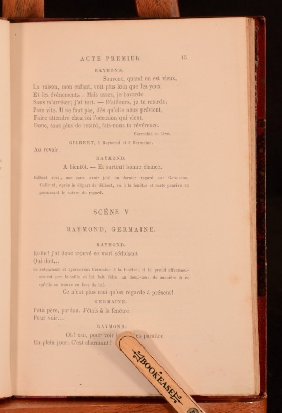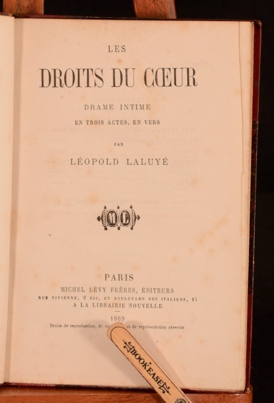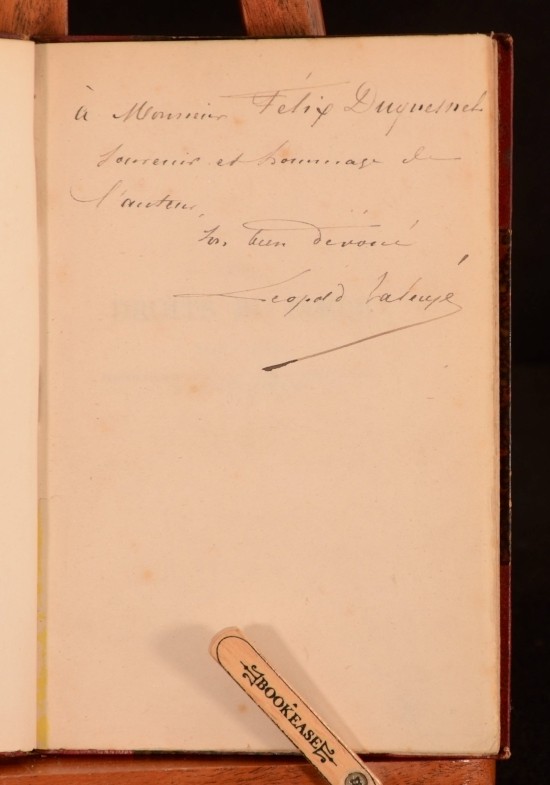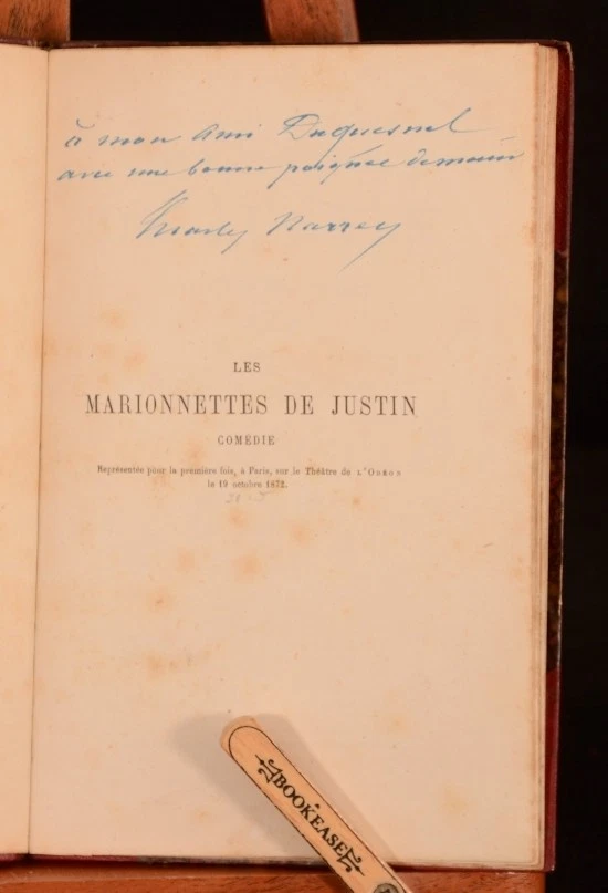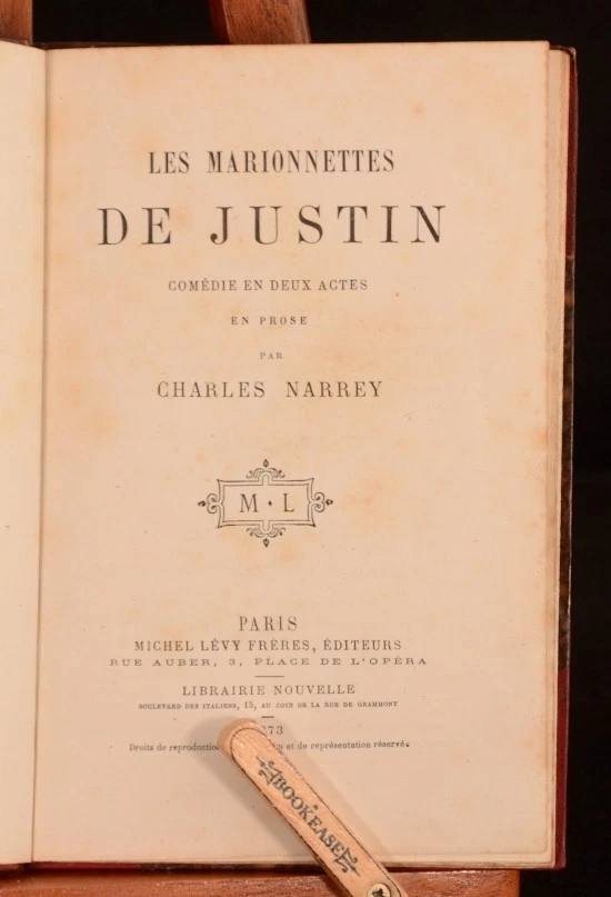 Click here to see our other books! Les Marionnettes de Justin et Les Droits de Coeur Charles Narrey; Leopole Laluye 1869 - 1873 Michel Levy Freres : Paris 7" by 5" 57pp; 88pp SUMMARY Two uniformly bound plays by eminent French playwrights. Fine Binding,Leather Binding Overall Condition: Very Good Indeed This book weighs 0.75 KG when packed UK Postage: £ 3.99 US Postage: £ 19.99 EU Postage : £ 15.99 European Postage: £ 16.99 Asia Postage: £ 21.99 Worldwide Postage: £ 25.99 DESCRIPTION 'Les Marionnettes de Justin' by Charles Narrey and 'Les Droits de Coeur' by Leopold Laluye. Both volumes are in the original French. Both volumes appear to be signed by the playwrights with an inscription addressed to a Mr Dugnesned (sp). Charles Narrey was a 19th century French writer from an Irish family. He made his debut into the literary sphere with his novel 'Deux Heures de Mysteres' and his stage debut was with two comedies performed at the Theatre de L'Odeon. Leopold Laluye was a French playwright, writer, designer and lithographer. CONDITION In a half morocco binding with paper covered boards. Externally, very smart with just some minor rubbing to the head and tail of spines and to the extremities. Both volumes are signed by the authors with an inscription to a 'Dugnesned'. Both volumes are firmly bound. Pages are age toned as expected with paper used. Scattered spots to endpapers and the odd spot throughout. Overall Condition: Very Good Indeed GLOSSARY OF TERMS Overall Condition (Dustwrapper condition rating is shown after that for the book itself, where a dustwrapper is present) Fine - Very well preserved copy showing very little wear Very Good Indeed - Only one or two minor faults, really a very attractive copy Very Good - Quite a wide term meaning no major faults but probably several smaller ones often expected given the age of the book, but still a respectable copy Good - Meaning not very good. Some more serious faults as will be described in the condition report under 'condition' Good Only - Meaning one or more faults that could really do with repair Fair - As with good only above but with other faults leaving a compromised copy even after repair Poor - Really bad and possibly seriously incomplete. We only sell books in this condition where their rarity or value makes them attractive none the less. Major defects will be described. GUARANTEE We offer a full money back guarantee on our descriptions. Please ask for details and conditions. We prefer PAYPAL. If you pay via PAYPAL we will post the item off the same or the next working day with the postage you have selected. Please note we cannot accept USD cheques