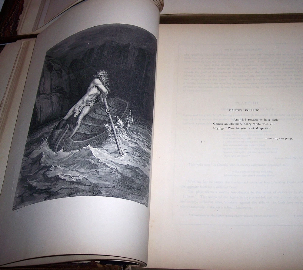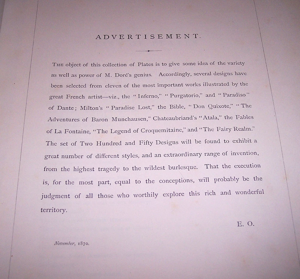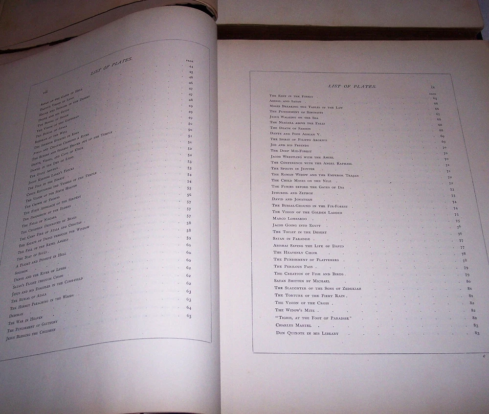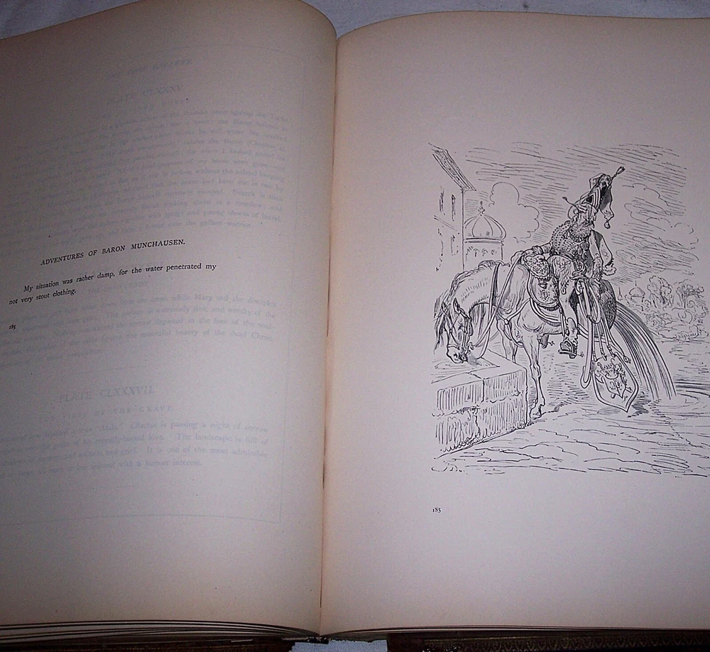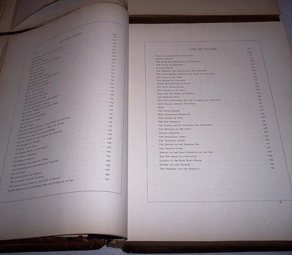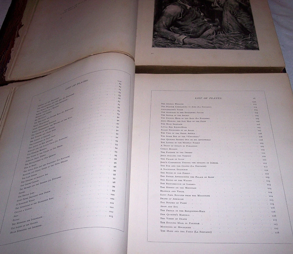 1870 C. Gustave Dore Gallery Book Set W/250 Illustrated Engravings Each Book Estate Find. I searched every where to find another exactly like this one and could not. Gustave Dore was a prolific engraver, artist, illustrator, and sculptor, working primarily as a wood and steel engraver. He produced over 100,000 sketches in his lifetime, and lived to be 50 years old, averaging 6 sketches per day for each day he lived. By the time he died he had also earned over $2 million, living a life of affluence. Even though he was an untrained, self-taught artist, who never used a live model, and who could not sketch from nature, his work is considered some of the most important in the entire engraving art world. As a child, young Dore was an avid artist, and earned his way as an illustrator in a Paris bookshop, publishing his first drawings when he was 15 years old. His young age and great talent drew much attention, which led to newspaper and journal articles written about the “child illustrator,” and generated further interest in the artist. As an illustrator, Dore created engravings for the books of Balzac, Rabelais, Milton, Dante, Edgar Allen Poe, and Lord Byron. He was commissioned to illustrate a version of the English Bible, which was extremely popular, allowing for the foundation of his own gallery, the Dore Gallery. For his work on Dante’s Inferno, he was decorated with the Cross of the Legion of Honor. Text by Edmund Ollier (including a memoir of Dore) 250 illustrations by Gustave Dore Leather binding Each original 1870 book is a collection of 250 full-page Doré wood engravings from 11 of his illustrated editions, including Dante, Milton, Cervantes, and the Bible. Contains a selection of the best of Doré s illustrations from the Bible, Milton s Paradise Lost, Dante s Inferno, Cervantes Don Quixote, La Fontaine s Fables and Baron Munchausen, among others The plate engravings are stunning. In good overall condition for age other than the spine was replaced at some point in time with black electrical tape The first few and last few pages show most wear and staining, with inside pages in good shape for age with minor foxing and stains Due to its age and with such huge books, I always consider these fragile and to be understandably handled with care especially when opening to read Set weighs approximately 22 pounds and measures approx 15.5 X 2 X 12 inches each book. FREE LOCAL PICKUP Selling As-Is PRODUCT LIABILITY DISCLAIMER : No warranty of any kind, expressed or implied, is made regarding the function, use of and/or safety of the product(s) sold. Buyer assumes all risk and liability resulting from purchase of above item(s) . Also check out my store for more Visit My eBay Store: Horse Cents and Pony Tales