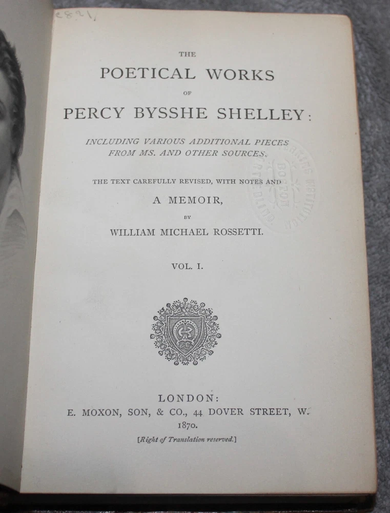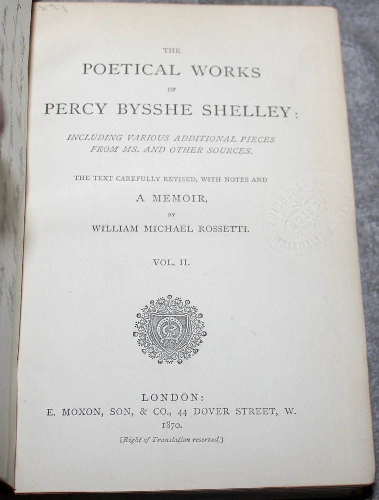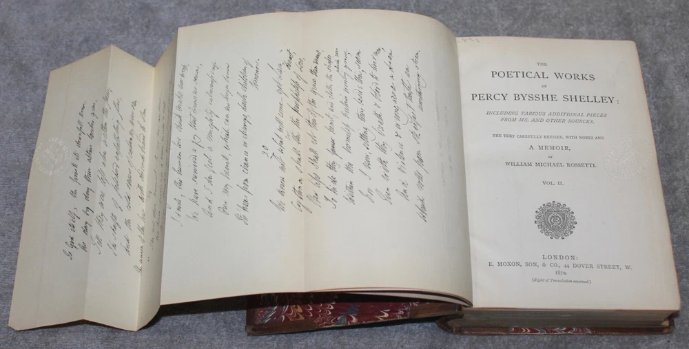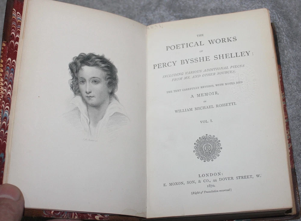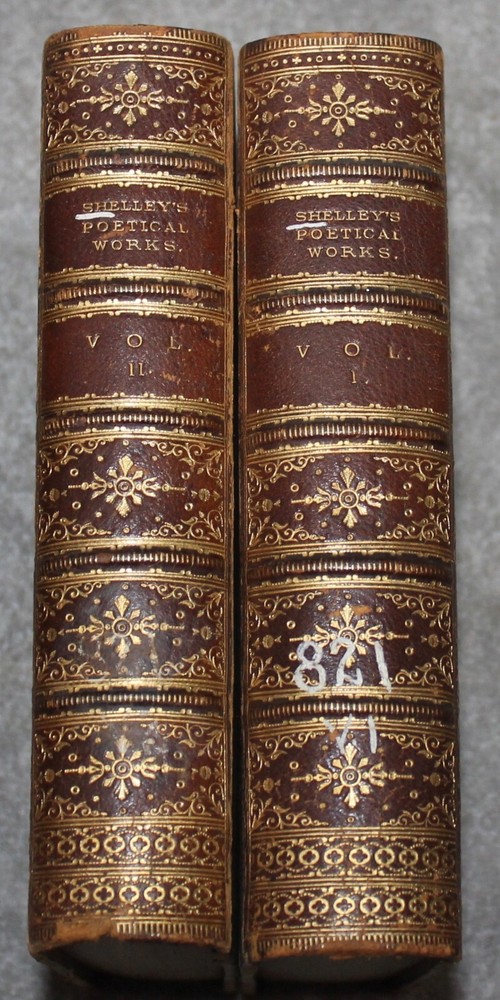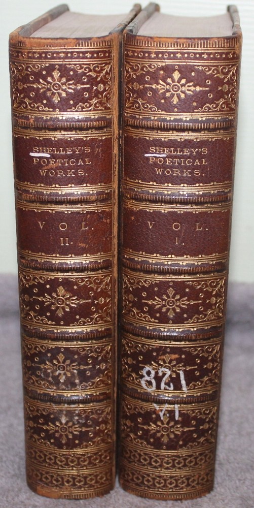 YOU ARE BIDDING ON AN ANTIQUE SET OF BOOKS " THE POETICAL WORKS OF PERCY BYSSHE SHELLEY" PRINTED IN LONDON IN 1870 BY E. MOXON, SON & CO. REVISED BY WILLIAM MICHAEL ROSSETTI. IT IS A TWO VOLUME SET WITH 3/4 LEATHER BINDING . THE END PAPERS ARE MARBLED. IT ORIGINALLY BELONGED TO THE PERKING SCHOOL FOR THE BLIND IN BOSTON AND THE TITLE PAGES HAVE A RAISED SEAL WITH THIS AND THERE ARE SOME NUMBERS MARKED ON THE 1ST VOLUME'S SPINE. THEY ARE IN EXCELLENT CONDITION WITH ONLY LIGHT WEAR, AS SHOWN. PLEASE LOOK AT ALL PHOTOS AND ASK ANY QUESTIONS YOU MAY HAVE. REMEMBER THAT I SELL MOSTLY ANTIQUE AND VINTAGE ITEMS AND THAT THEY ARE MOSTLY LIKELY NOT BE PERFECT DO TO THE NATURE OF THEIR AGE. IF YOU HAVE A PROBLEM PLEASE CONTACT ME BEFORE LEAVING FEEDBACK.