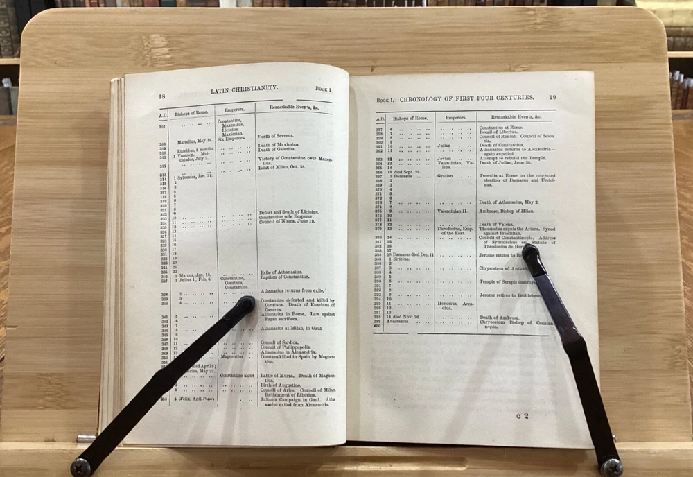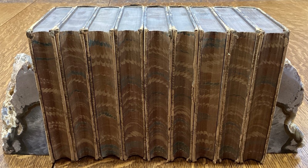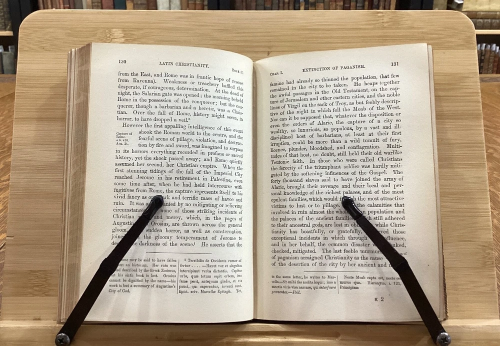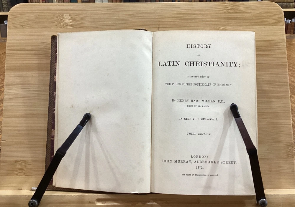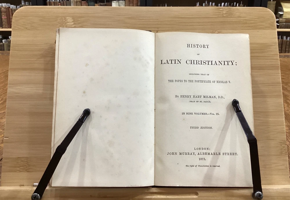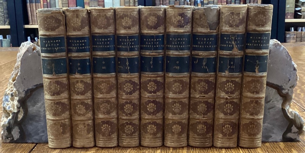 History of Latin Christianity; Including that of The Popes to the Pontificate of Nicolas V. Henry Hart Milman, D.D. London: John Murray, Albemarle Street, 1872. Complete set in 9 volumes. Uniform leather binding measuring 7 x 5", 12mos. Vol. I Vol. II Vol. III Vol. IV Vol. V Vol. VI Vol. VII Vol. VIII Vol. IX In fair condition. Full leather boards normally scuffed at edges and worn/bumped at corners. Rear boards with sticker residue to bottom half. Heads and tails of leather spines rubbed; Vol. VII head with exposed binding. Vol. VII & Vol. VII with exposed cording at raised bands. Title and volume labels with light chipping, but still legible. Hinges rubbed; Vol. I with cracked hinge at head of spine. Front and rear gutters split in most volumes. Foxing to front and rear end-pages. Rear paste-downs with marking from sticker removal. Text-blocks lightly toned at edges, but otherwise clean and bright. Please see photos and ask questions, if any, before purchasing. History of Latin Christianity: Including That of the Popes to the Pontificate of Nicolas V is a comprehensive set written by Henry Hart Milman (1791-1868). The series covers the history of Christianity in the Latin world, including the history of the popes up to pontificate of Nicolas V. Providing a detailed account of the development of Christianity in the Latin world, including the role of the papacy, the Crusades, and the various religious orders. Milman's writing style is engaging and informative, making his work accessible to both scholars and general readers. A must-read for anyone interested in the history of Christianity or the history of the papacy. Complete set in 9 volumes. FORN-SHELF-0485-BB-2502-BH52