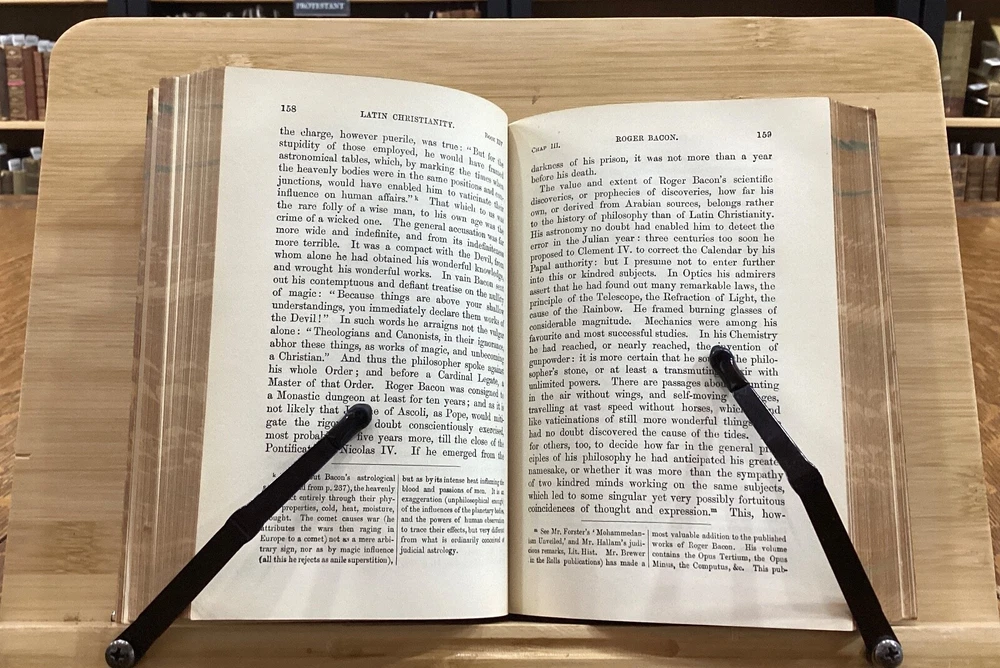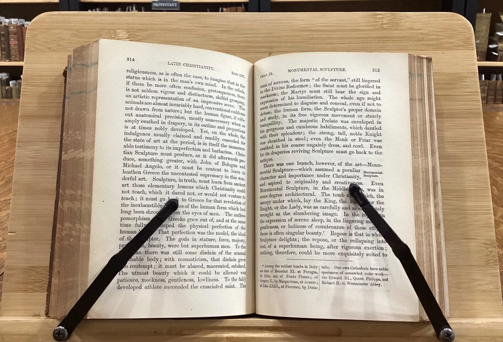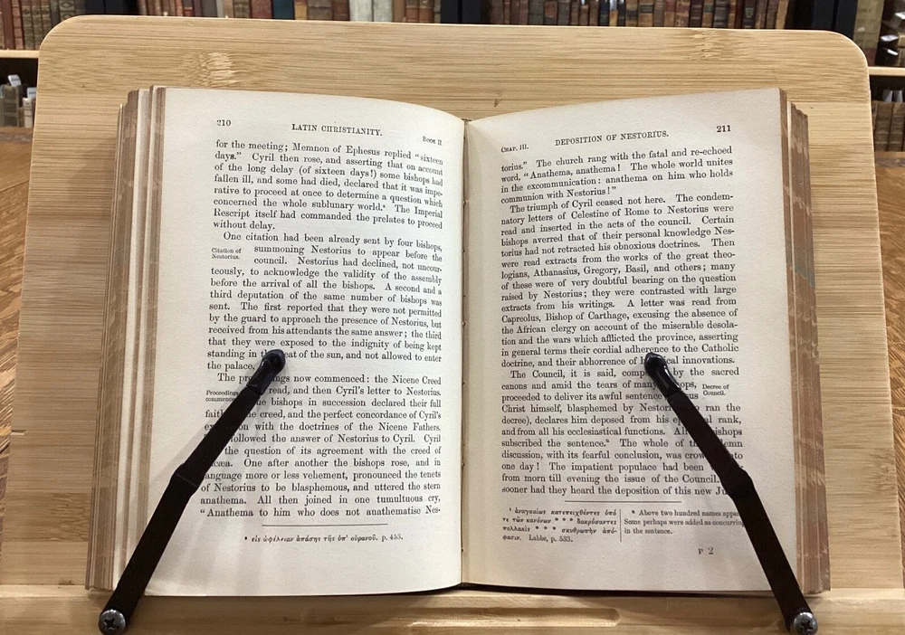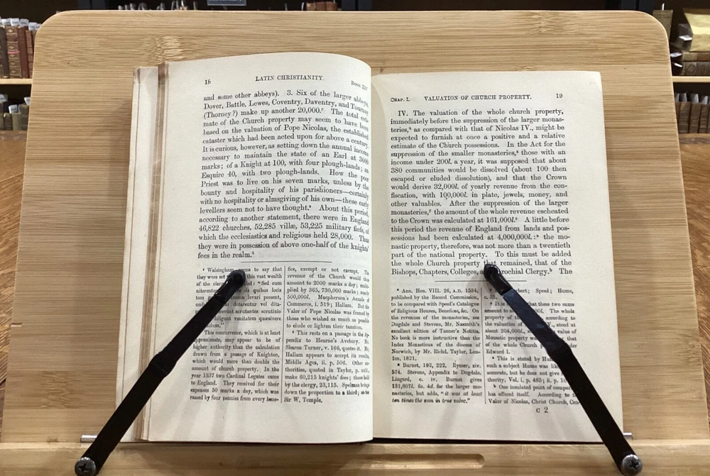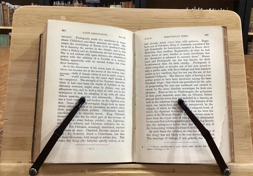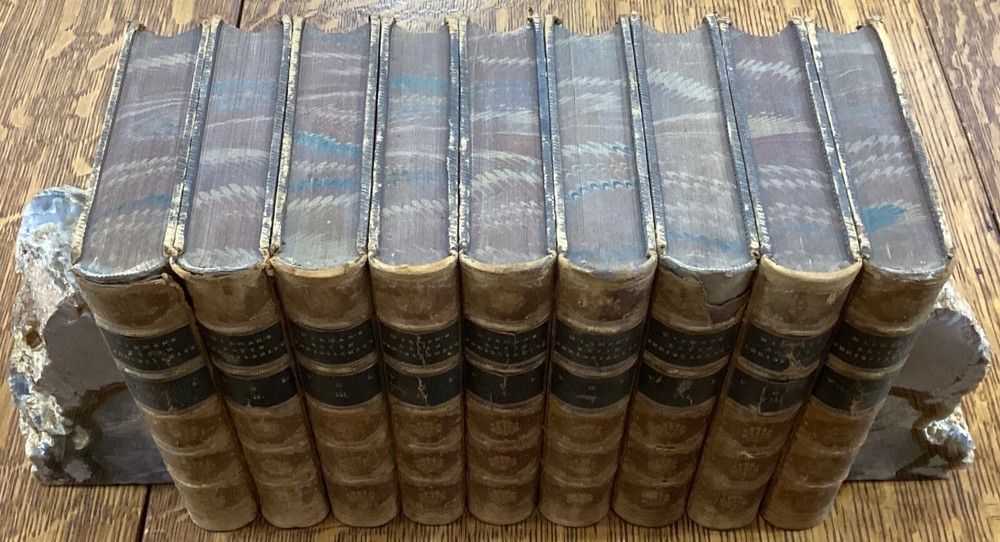 History of Latin Christianity; Including that of The Popes to the Pontificate of Nicolas V. Henry Hart Milman, D.D. London: John Murray, Albemarle Street, 1872. Complete set in 9 volumes. Uniform leather binding measuring 7 x 5", 12mos. Vol. I Vol. II Vol. III Vol. IV Vol. V Vol. VI Vol. VII Vol. VIII Vol. IX In fair condition. Full leather boards normally scuffed at edges and worn/bumped at corners. Rear boards with sticker residue to bottom half. Heads and tails of leather spines rubbed; Vol. VII head with exposed binding. Vol. VII & Vol. VII with exposed cording at raised bands. Title and volume labels with light chipping, but still legible. Hinges rubbed; Vol. I with cracked hinge at head of spine. Front and rear gutters split in most volumes. Foxing to front and rear end-pages. Rear paste-downs with marking from sticker removal. Text-blocks lightly toned at edges, but otherwise clean and bright. Please see photos and ask questions, if any, before purchasing. History of Latin Christianity: Including That of the Popes to the Pontificate of Nicolas V is a comprehensive set written by Henry Hart Milman (1791-1868). The series covers the history of Christianity in the Latin world, including the history of the popes up to pontificate of Nicolas V. Providing a detailed account of the development of Christianity in the Latin world, including the role of the papacy, the Crusades, and the various religious orders. Milman's writing style is engaging and informative, making his work accessible to both scholars and general readers. A must-read for anyone interested in the history of Christianity or the history of the papacy. Complete set in 9 volumes. FORN-SHELF-0485-BB-2502-BH52