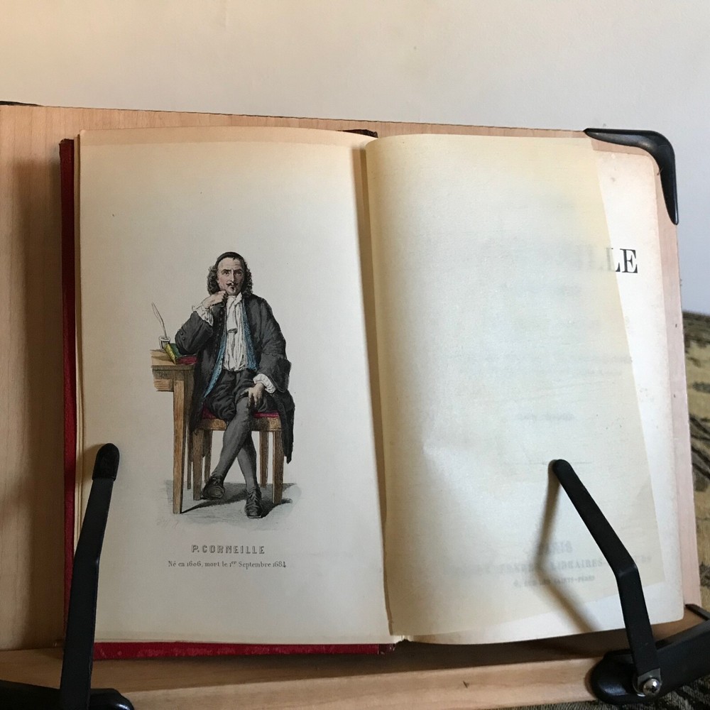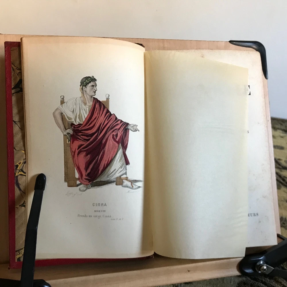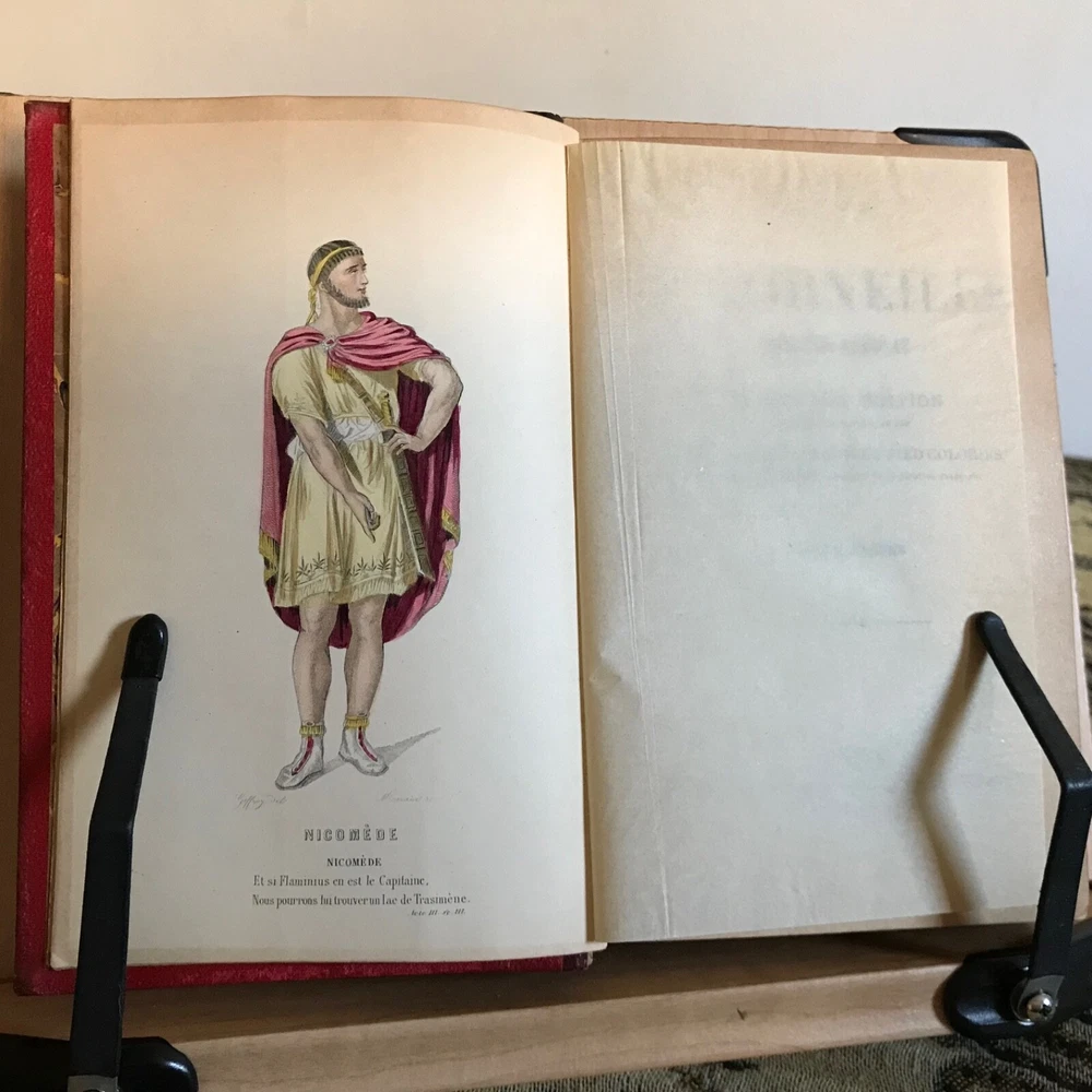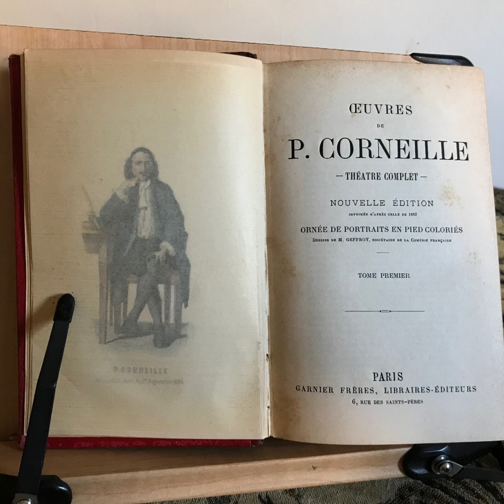 Oeuvres de P. Corneille. Théatre complet Nouvelle édition imprimée d'après celle de 1682. Ornée de portraits en pied coloriés. Dessins de M. Geffroy, Pierre Corneille, Garnier Freres, Paris, 1875, complete in three volumes, red leather, 7.25 x 4.75”, 12mo. In good condition. Nicely bound in beautiful red, pebbled leather. All gilt edges. Boards exhibit minor wear with light edge abrasions and rubbed corners. Spines darkened with dryness along hinges and extremes. Armorial bookplates of Lea on paste downs. Interiors lightly toned, free of markings. Plates are bright, clean and colorful. Tissue guards intact. Bindings intact. Please see photos. Pierre Corneille was a French tragedian. He is generally considered one of the three great seventeenth-century French dramatists, along with Molière and Racine. COLI1875AFGK