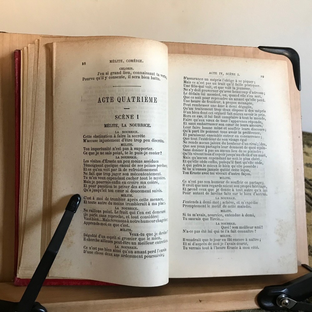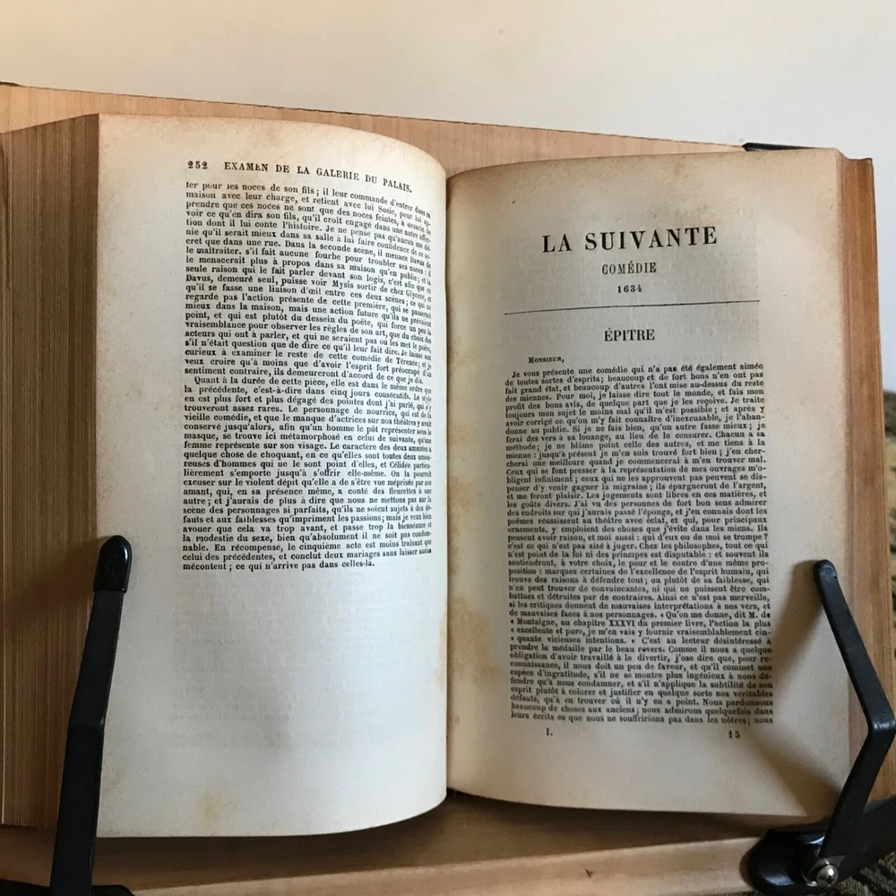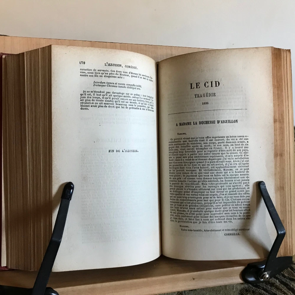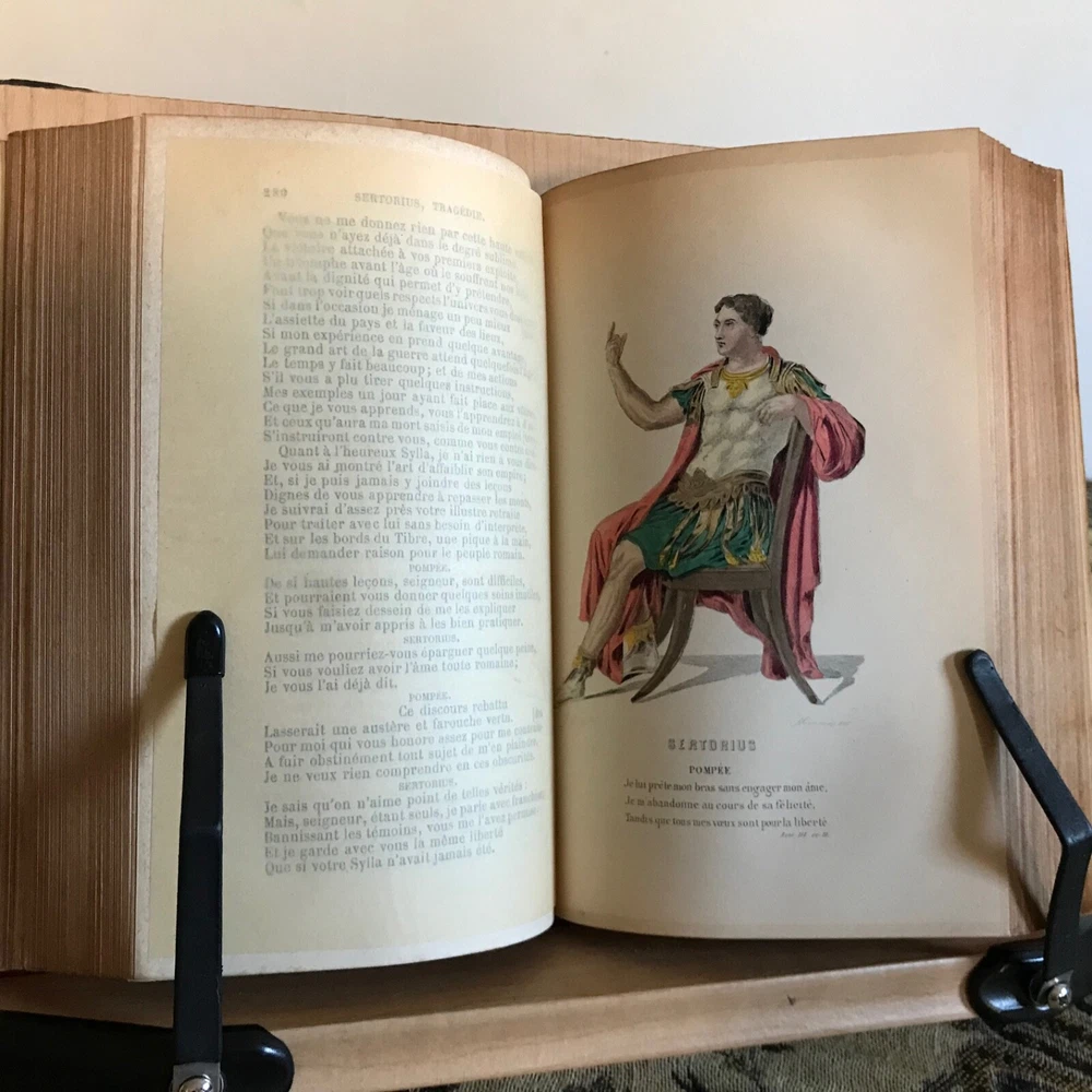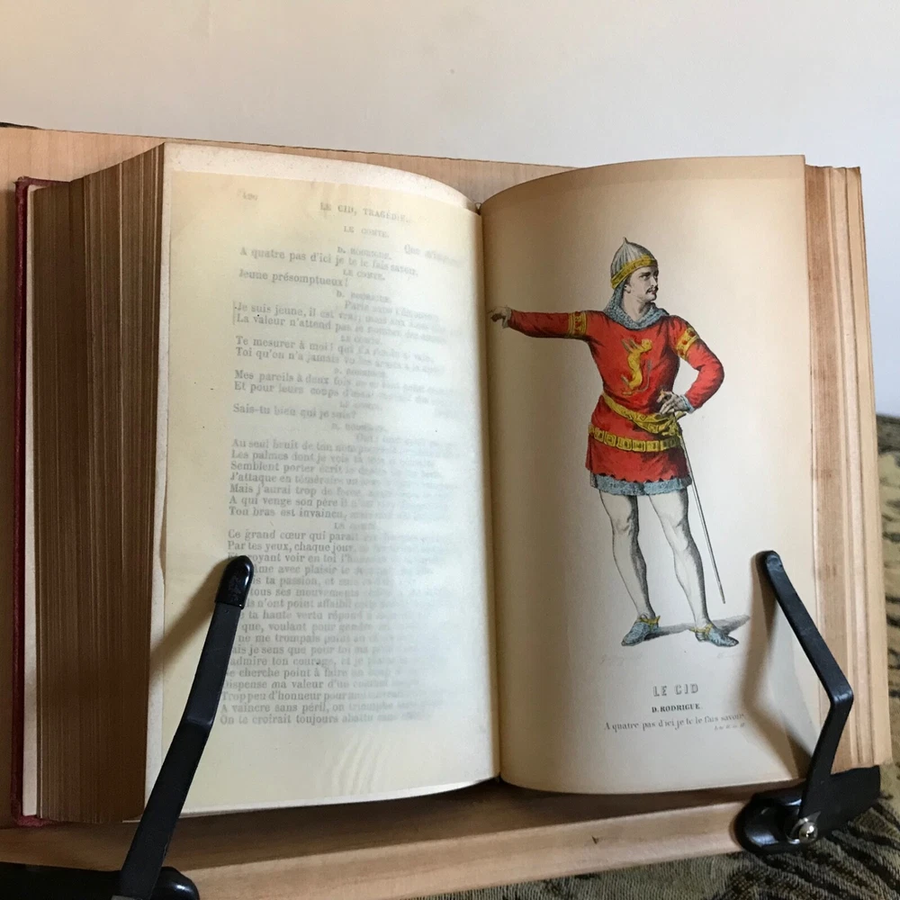 Oeuvres de P. Corneille. Théatre complet Nouvelle édition imprimée d'après celle de 1682. Ornée de portraits en pied coloriés. Dessins de M. Geffroy, Pierre Corneille, Garnier Freres, Paris, 1875, complete in three volumes, red leather, 7.25 x 4.75”, 12mo. In good condition. Nicely bound in beautiful red, pebbled leather. All gilt edges. Boards exhibit minor wear with light edge abrasions and rubbed corners. Spines darkened with dryness along hinges and extremes. Armorial bookplates of Lea on paste downs. Interiors lightly toned, free of markings. Plates are bright, clean and colorful. Tissue guards intact. Bindings intact. Please see photos. Pierre Corneille was a French tragedian. He is generally considered one of the three great seventeenth-century French dramatists, along with Molière and Racine. COLI1875AFGK
