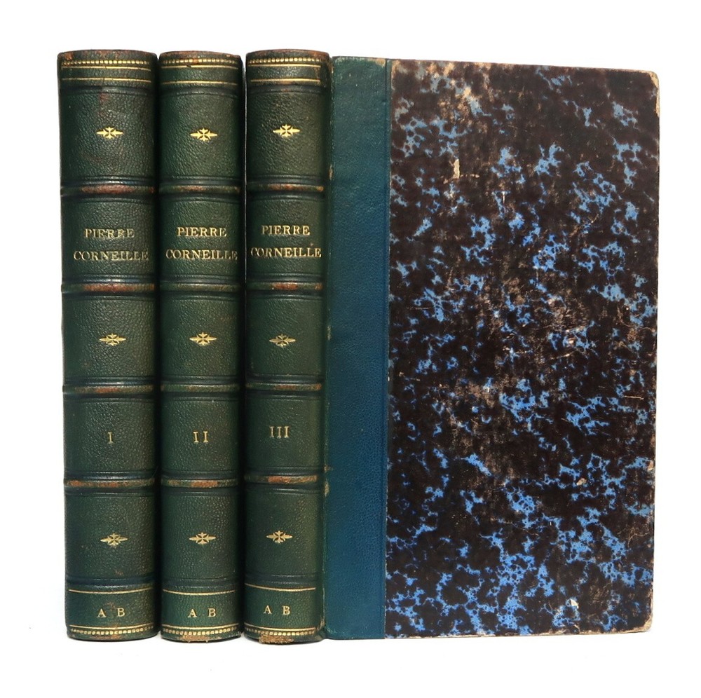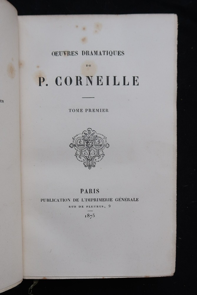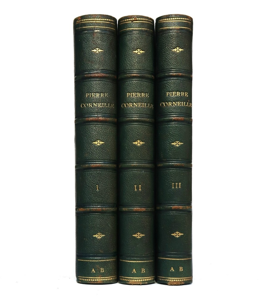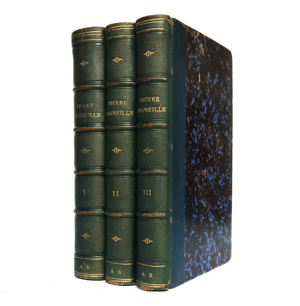 "Oeuvres Dramatiques de P. Corneille". Complete set in 3 volumes. Paris, Publications de l'Imprimerie Générale, 1875. 19 x 12.5 cm., 332 + 286 + 295 pages. Text in French. Bound in period half leather, raised bands, gilt to spine, marbled endpapers. Slight wear to edges and corners, interior in very good condition. Pierre Corneille (French pronunciation: [pjɛʁ kɔʁnɛj]; 6 June 1606 – 1 October 1684) was a French tragedian. He is generally considered one of the three great seventeenth-century French dramatists, along with Molière and Racine. As a young man, he earned the valuable patronage of Cardinal Richelieu, who was trying to promote classical tragedy along formal lines, but later quarrelled with him, especially over his best-known play, Le Cid, about a medieval Spanish warrior, which was denounced by the newly formed Académie française for breaching the unities. He continued to write well-received tragedies for nearly forty years.