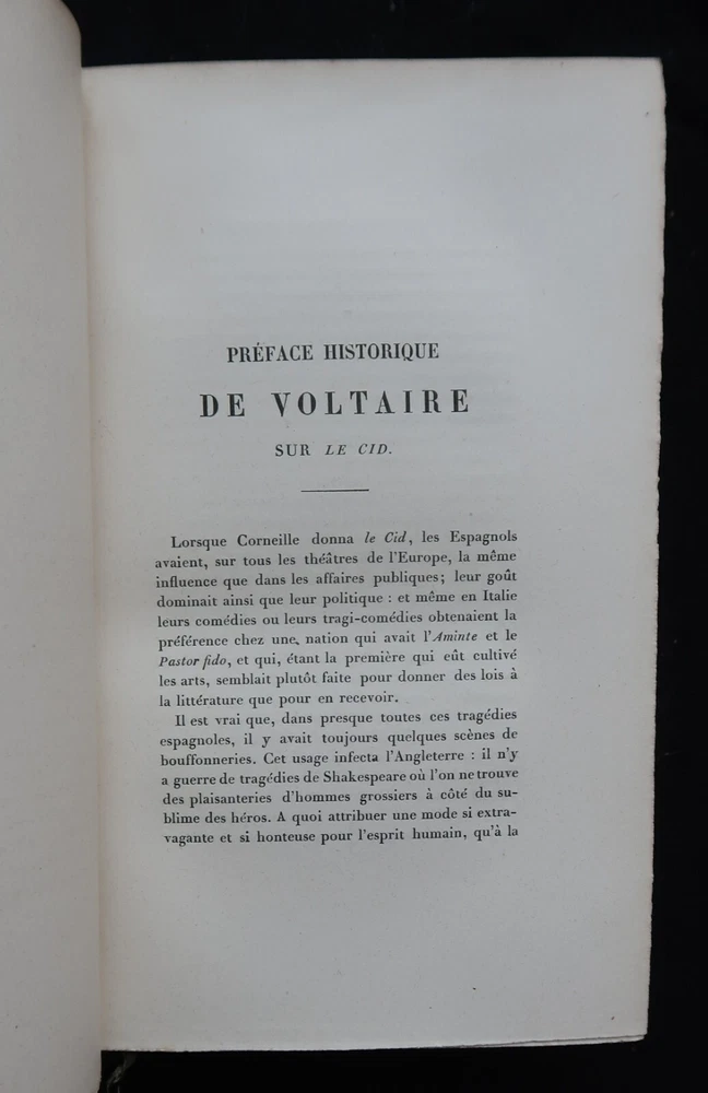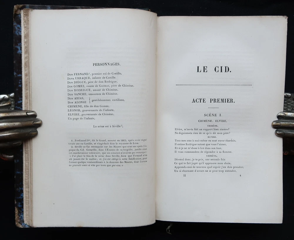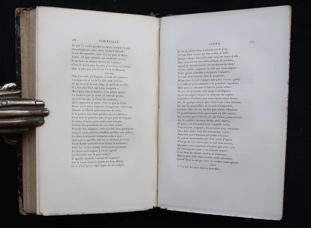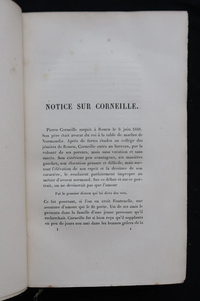 "Oeuvres Dramatiques de P. Corneille". Complete set in 3 volumes. Paris, Publications de l'Imprimerie Générale, 1875. 19 x 12.5 cm., 332 + 286 + 295 pages. Text in French. Bound in period half leather, raised bands, gilt to spine, marbled endpapers. Slight wear to edges and corners, interior in very good condition. Pierre Corneille (French pronunciation: [pjɛʁ kɔʁnɛj]; 6 June 1606 – 1 October 1684) was a French tragedian. He is generally considered one of the three great seventeenth-century French dramatists, along with Molière and Racine. As a young man, he earned the valuable patronage of Cardinal Richelieu, who was trying to promote classical tragedy along formal lines, but later quarrelled with him, especially over his best-known play, Le Cid, about a medieval Spanish warrior, which was denounced by the newly formed Académie française for breaching the unities. He continued to write well-received tragedies for nearly forty years.