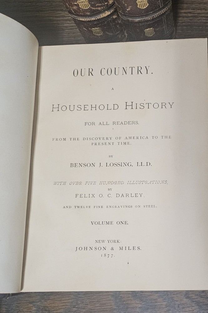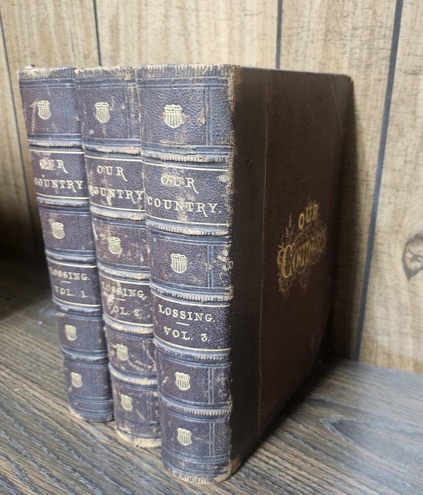 1877 OUR COUNTRY A HOUSEHOLD HISTORY LEATHER BOOK SET LOSSING 3 VOLUMES Some noticeable wear to covers. Interior in good condition.