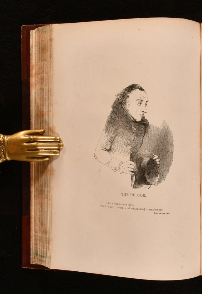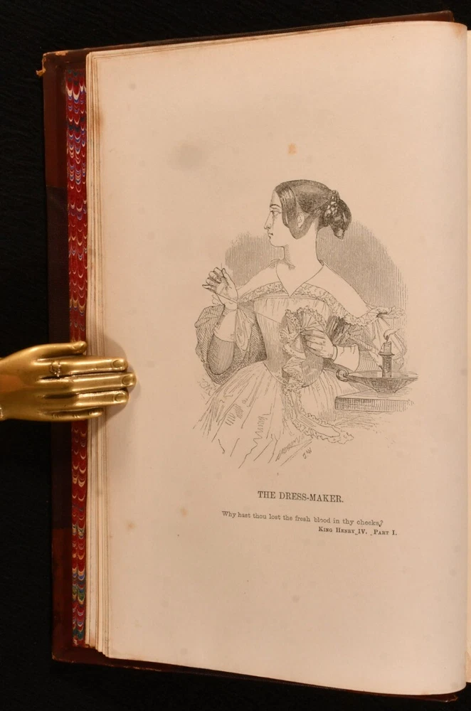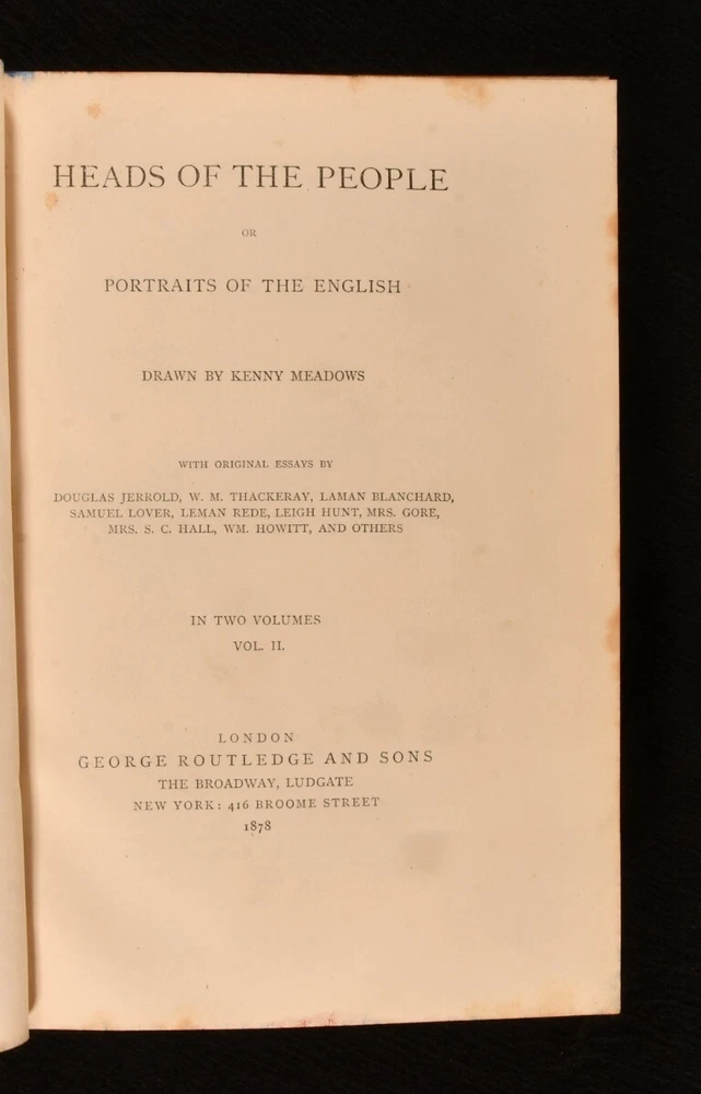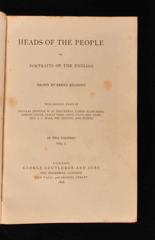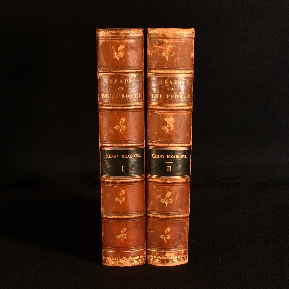 Click here to see our other books! Heads of the People or Portraits of the English Douglas Jerrold; W. M. Thackeray; Leigh Hunt; Mrs. Gore; et al. 1878 George Routledge and Sons : London 9.5" by 6.5" x, 400; vii, 385pp. SUMMARY Kenny Meadows' witty caricatures of the English with essays by a variety of authors, complete in two uniformly bound volumes. Illustrated,Leather Binding Overall Condition: Very Good This book weighs 2.25 KG when packed UK Postage: £ 3.99 US Postage: £ 36.99 EU Postage : £ 25.99 European Postage: £ 27.99 Asia Postage: £ 47.99 Worldwide Postage: £ 69.99 DESCRIPTION Two volumes in half calf bindings with marbled end papers and edges. Illustrated with 108 illustrations. Collated, complete. A two-volume set containing Kenny Meadows' witty caricatures of various English stereotypes in the nineteenth century, including the Chaperon and the Debutante, the Old Squire, the British Sailor, the Radical M.P., the Medical Student, the Factory Child, and many more. These illustrations are accompanied by original essays by distinguished writers, such as William Makepeace Thackeray, Leigh Hunt, and others. CONDITION In half calf bindings. Externally, generally smart, though somewhat rubbed. Internally, firmly bound. Pages are bright and clean except for the odd spot to the first and last few pages. Plate of 'lawyer's clerk' detached but intact. Overall Condition: Very Good GLOSSARY OF TERMS Overall Condition (Dustwrapper condition rating is shown after that for the book itself, where a dustwrapper is present) Fine - Very well preserved copy showing very little wear Very Good Indeed - Only one or two minor faults, really a very attractive copy Very Good - Quite a wide term meaning no major faults but probably several smaller ones often expected given the age of the book, but still a respectable copy Good - Meaning not very good. Some more serious faults as will be described in the condition report under 'condition' Good Only - Meaning one or more faults that could really do with repair Fair - As with good only above but with other faults leaving a compromised copy even after repair Poor - Really bad and possibly seriously incomplete. We only sell books in this condition where their rarity or value makes them attractive none the less. Major defects will be described. GUARANTEE We offer a full money back guarantee on our descriptions. Please ask for details and conditions. We prefer PAYPAL. If you pay via PAYPAL we will post the item off the same or the next working day with the postage you have selected. Please note we cannot accept USD cheques