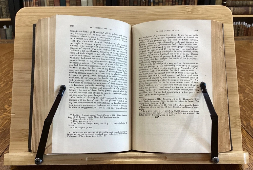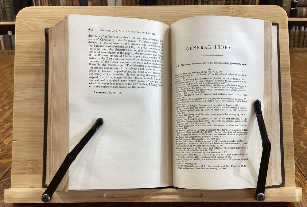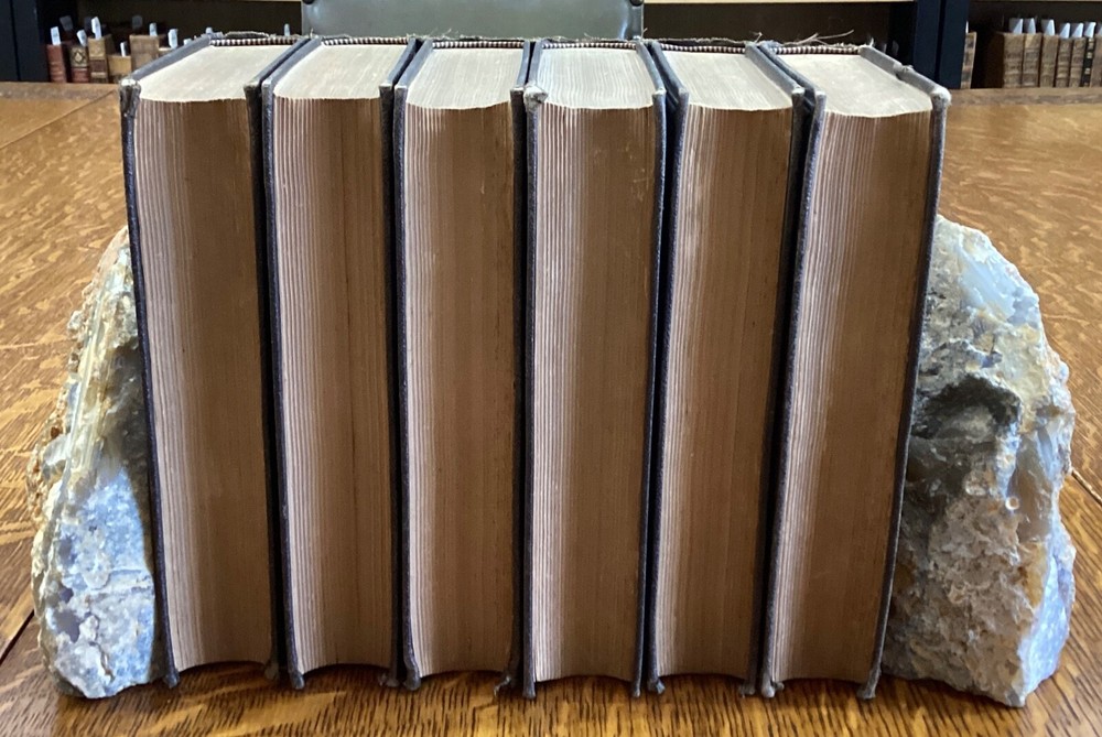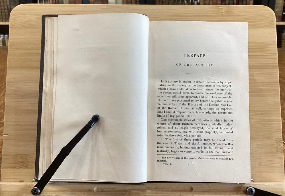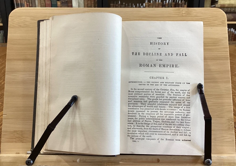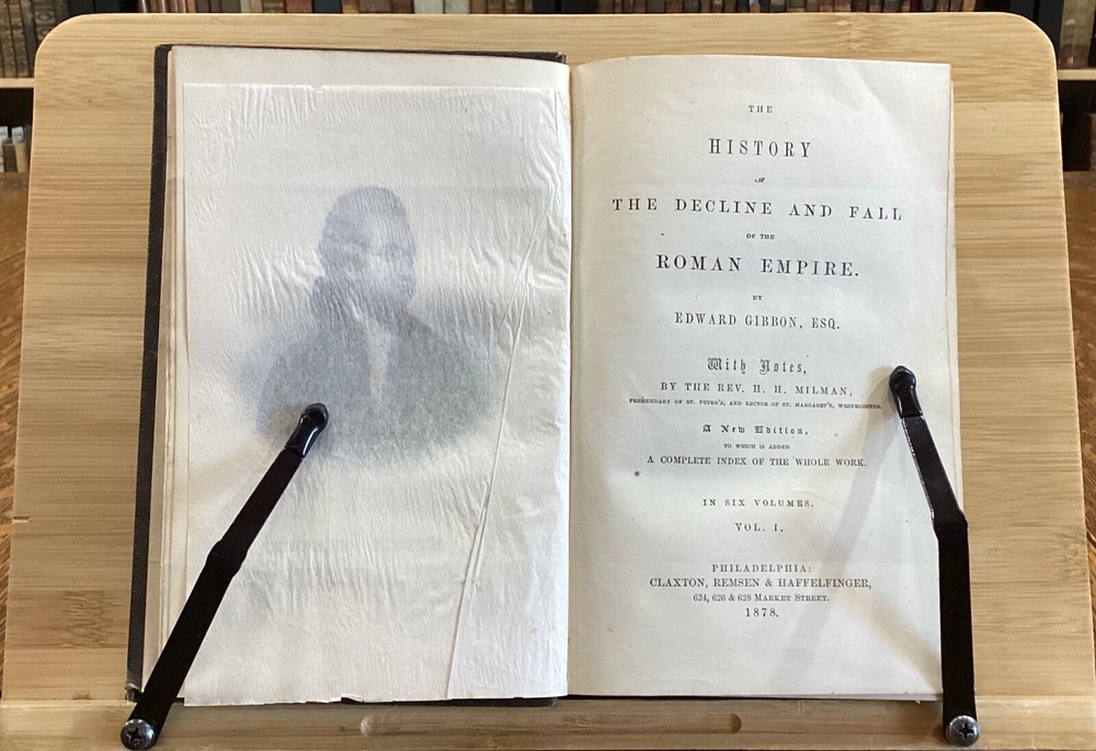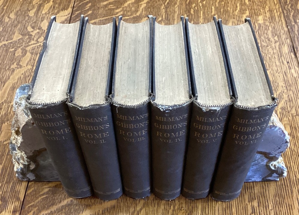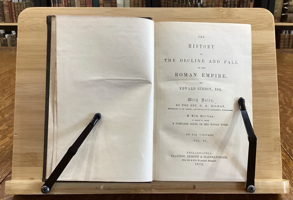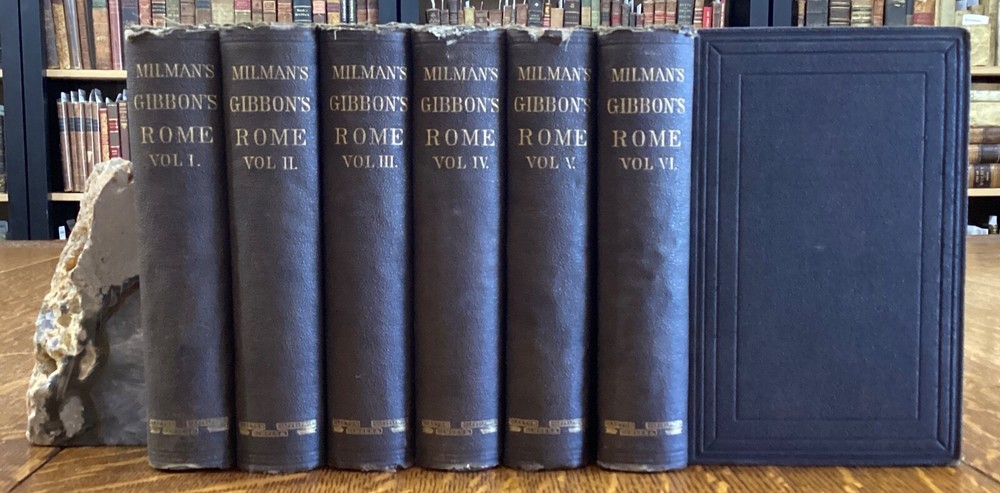 The History of The Decline and Fall of the Roman Empire. Edward Gibbon, Esq; with notes by Rev. H. H. Milman. Philadelphia: Claxton, Remsen & Haffelfinger, 1878. Complete six volume set. With uniform brown cloth binding. 7.75 x 5.5”, 12mo. Vol. I Vol. II Vol. III Vol. IV Vol. V Vol. VI In fair condition. Cloth boards scuffed at edges, and worn on corners. Head and tail of spines chipped and fraying. Gilt title labels on spine bright. With bumped corners, and bumped top edge on Vol I. Several volumes’ have cracked front and rear gutters: I, II, IV, VI. Bindings otherwise intact. Edges of text-blocks toned. Offsetting on title pages. Text-blocks look clean. Rear paste-downs stamped from previous owner. Please see photos and ask questions, if any, before purchasing. Edward Gibbon was an English essayist, historian, and politician. His most important work, The History of the Decline and Fall of the Roman Empire published in six volumes between 1776 and 1789, is known for the quality and irony of its prose, its use of primary sources, and its polemical criticism of organized religion. Although he published other works, Gibbons devoted much of his life to this one work. His autobiography Memoirs of My Life and Writings is devoted largely to his reflections on how the book virtually became his life, comparing the publication of each succeeding volume to a newborn child. The History of the Decline and fall of the Roman Empire is a complete six volume work by Gibbon. The six volumes cover from 98 to 1590, the peak of Roman Empire, the history of early Christianity and its emergence as the Roman state religion, the fall of the Western Roman Empire, the rise of Genesis Khan and Tamerlane and the fall of Constantinople, as well as discussions on the ruins of Ancient Rome. Complete Set in 6 Volumes FORN-SHELF-0509-BB-2502-BH45