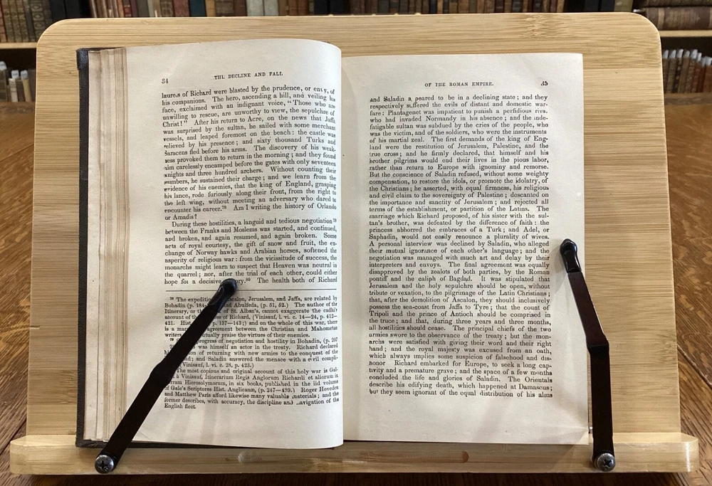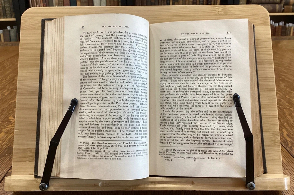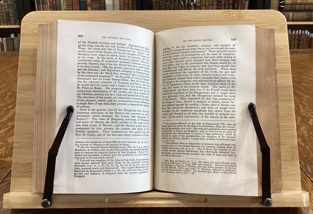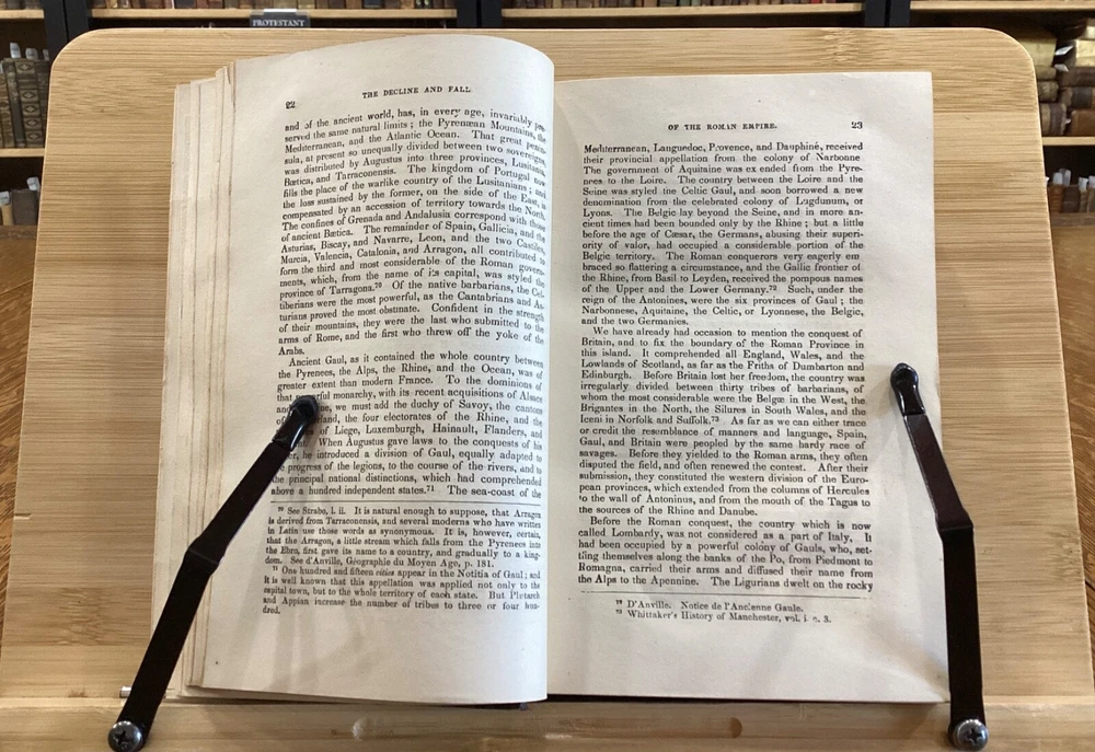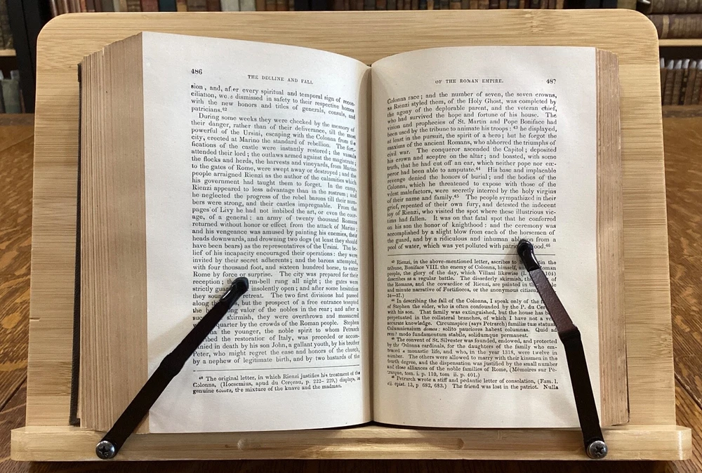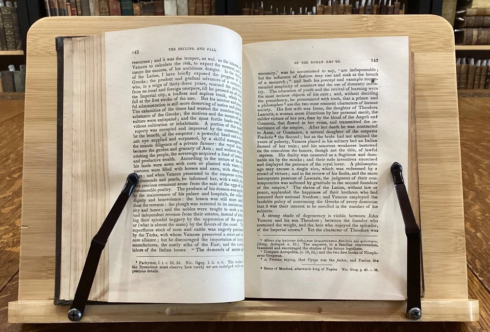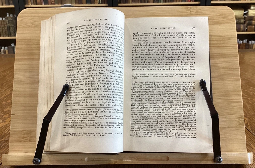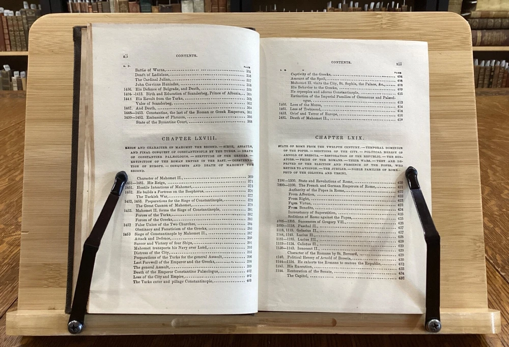The History of The Decline and Fall of the Roman Empire. Edward Gibbon, Esq; with notes by Rev. H. H. Milman. Philadelphia: Claxton, Remsen & Haffelfinger, 1878. Complete six volume set. With uniform brown cloth binding. 7.75 x 5.5”, 12mo. Vol. I Vol. II Vol. III Vol. IV Vol. V Vol. VI In fair condition. Cloth boards scuffed at edges, and worn on corners. Head and tail of spines chipped and fraying. Gilt title labels on spine bright. With bumped corners, and bumped top edge on Vol I. Several volumes’ have cracked front and rear gutters: I, II, IV, VI. Bindings otherwise intact. Edges of text-blocks toned. Offsetting on title pages. Text-blocks look clean. Rear paste-downs stamped from previous owner. Please see photos and ask questions, if any, before purchasing. Edward Gibbon was an English essayist, historian, and politician. His most important work, The History of the Decline and Fall of the Roman Empire published in six volumes between 1776 and 1789, is known for the quality and irony of its prose, its use of primary sources, and its polemical criticism of organized religion. Although he published other works, Gibbons devoted much of his life to this one work. His autobiography Memoirs of My Life and Writings is devoted largely to his reflections on how the book virtually became his life, comparing the publication of each succeeding volume to a newborn child. The History of the Decline and fall of the Roman Empire is a complete six volume work by Gibbon. The six volumes cover from 98 to 1590, the peak of Roman Empire, the history of early Christianity and its emergence as the Roman state religion, the fall of the Western Roman Empire, the rise of Genesis Khan and Tamerlane and the fall of Constantinople, as well as discussions on the ruins of Ancient Rome. Complete Set in 6 Volumes FORN-SHELF-0509-BB-2502-BH45