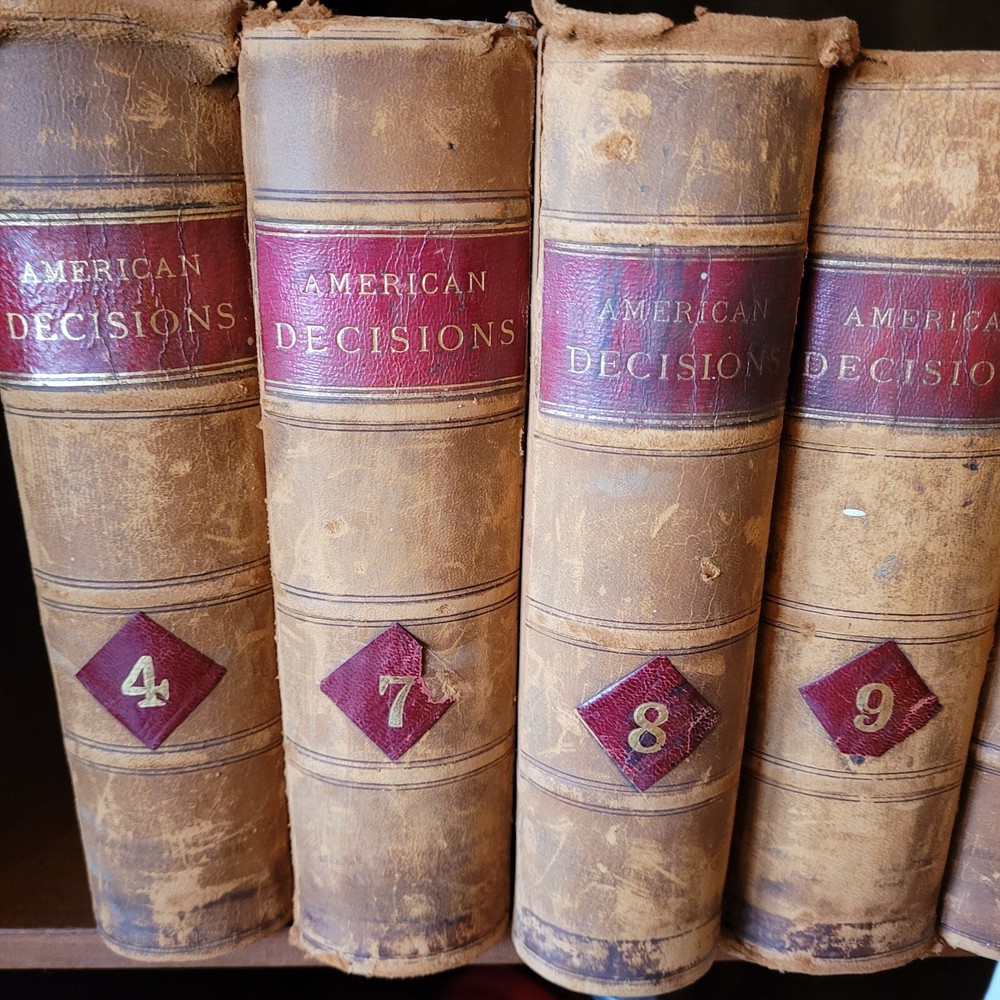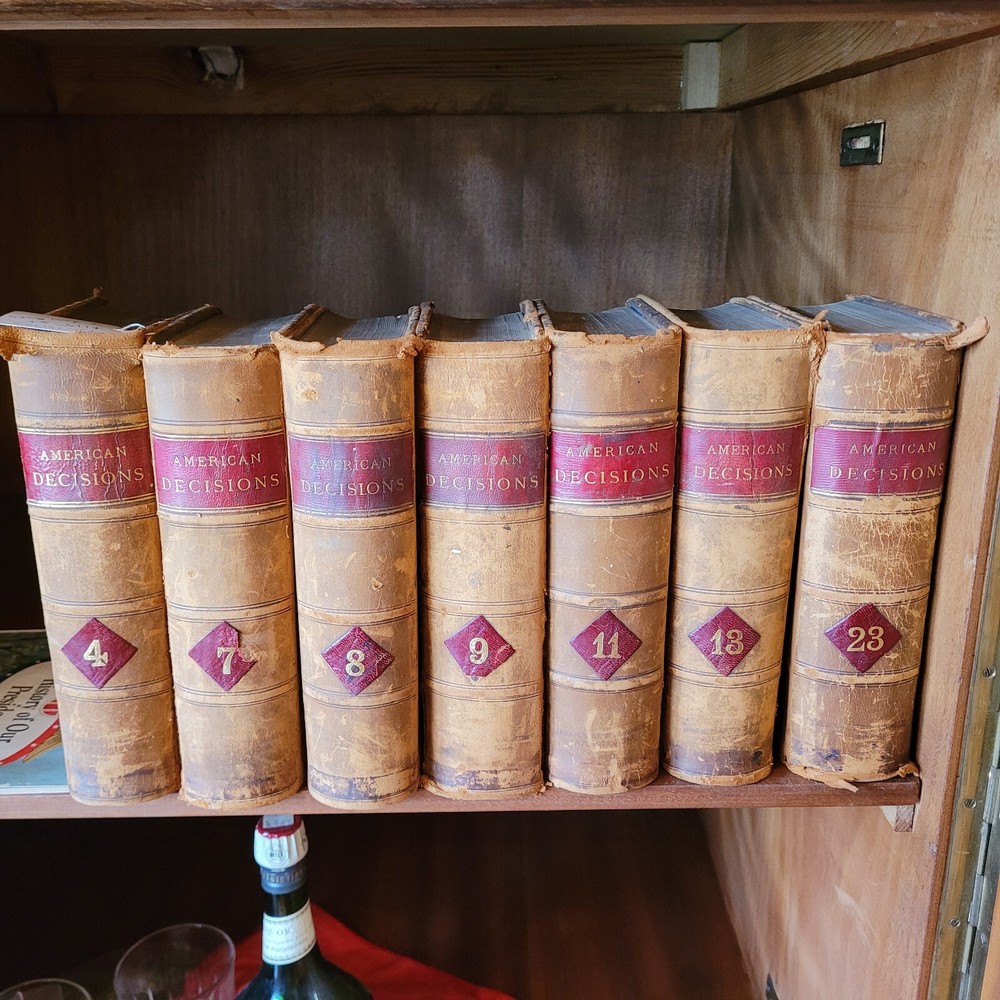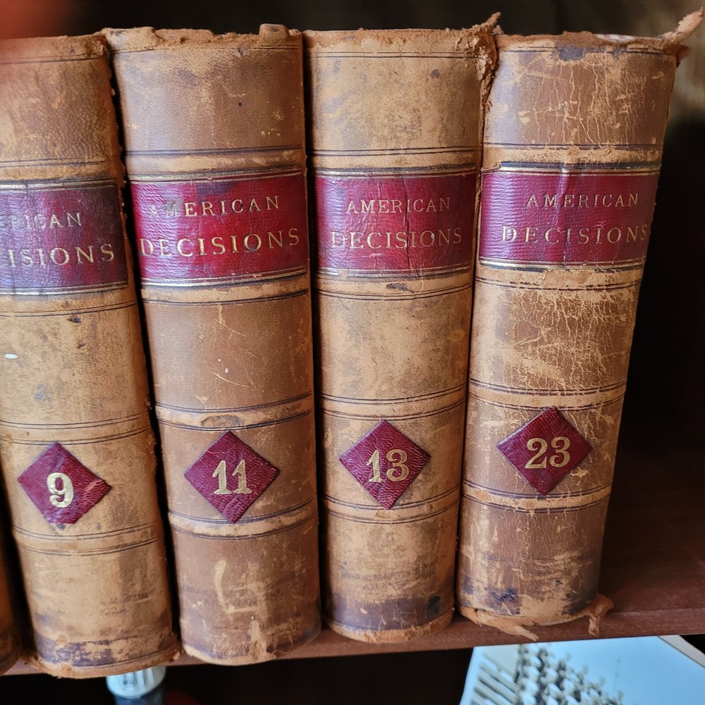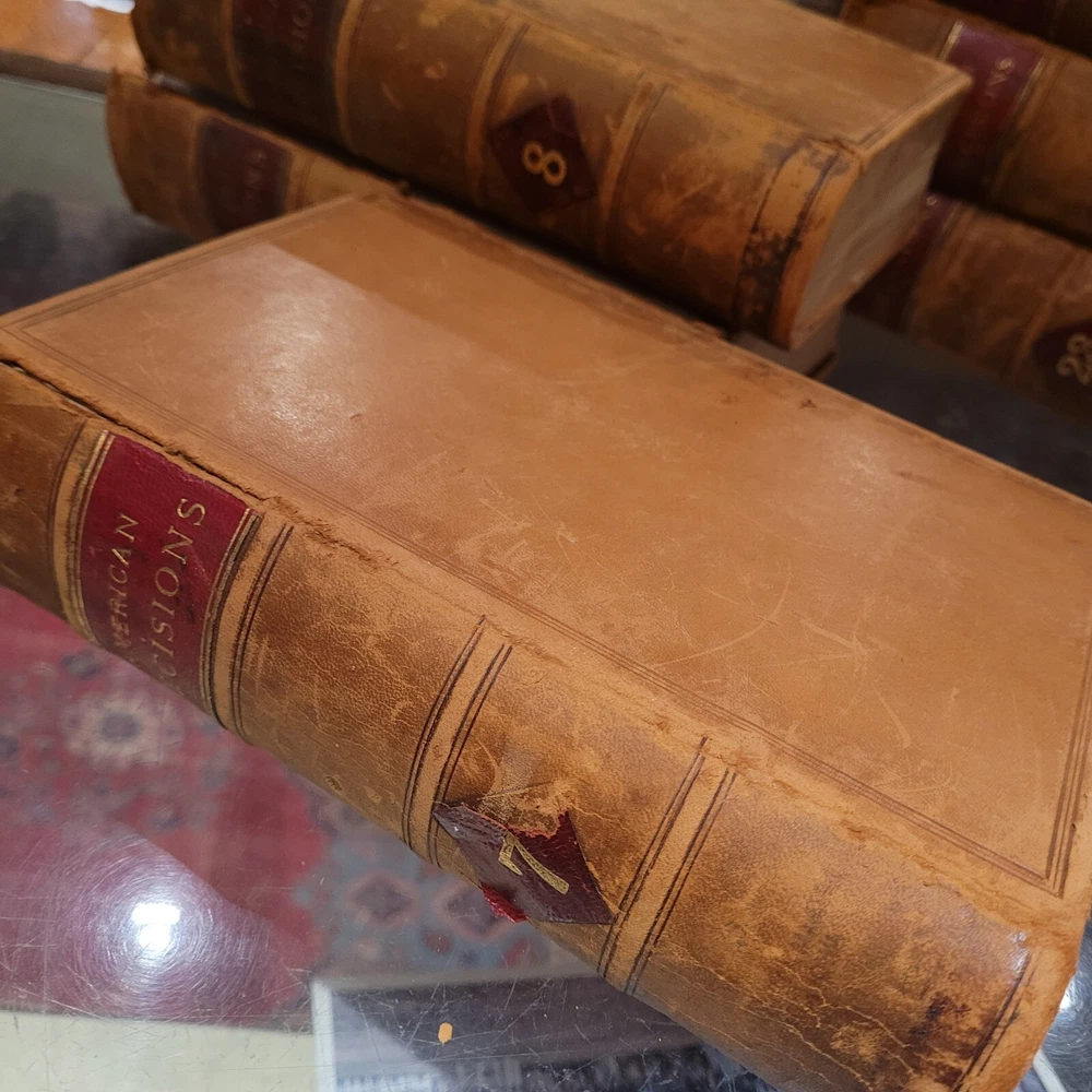 Collection of court decisions that were decided in several states. Published in San Franciso by A.L. Bancroft and Company (Law book publishers, booksellers and stationers). Books are stamped with the name of Swan, Martin & Martin from Atlantic ,Iowa. Tasteful decor addition for a law office.