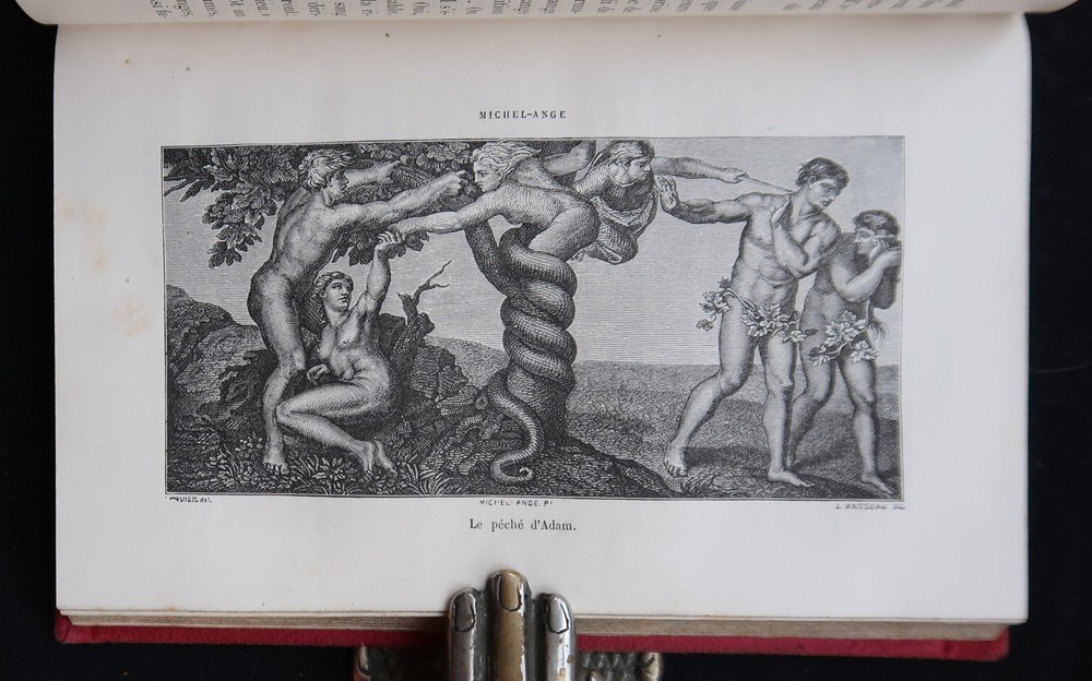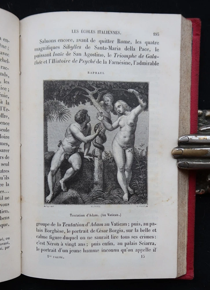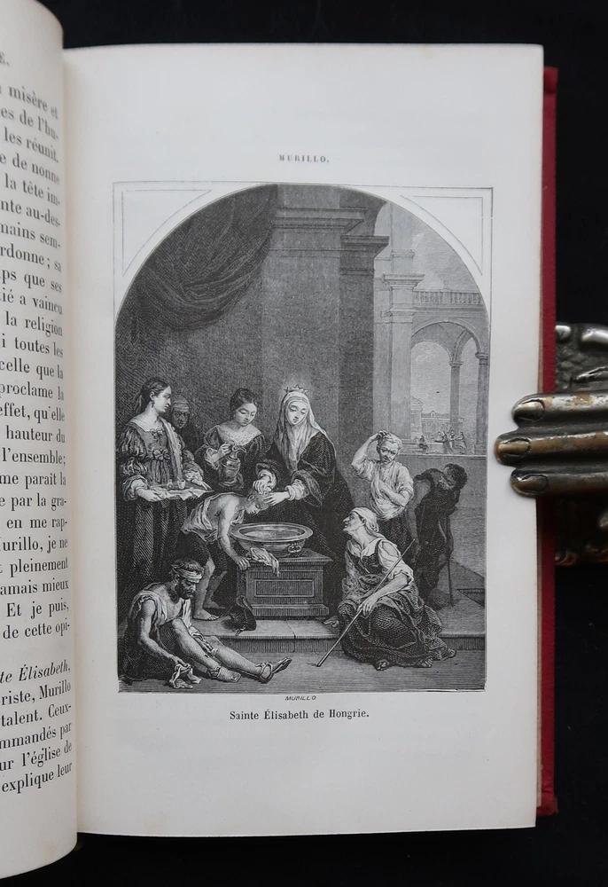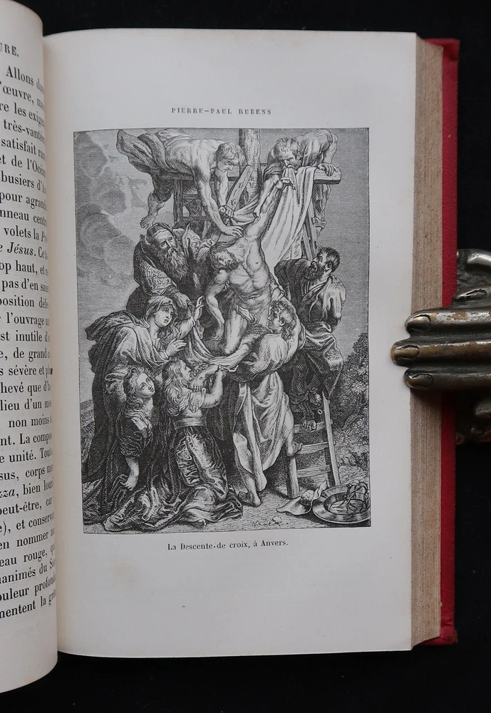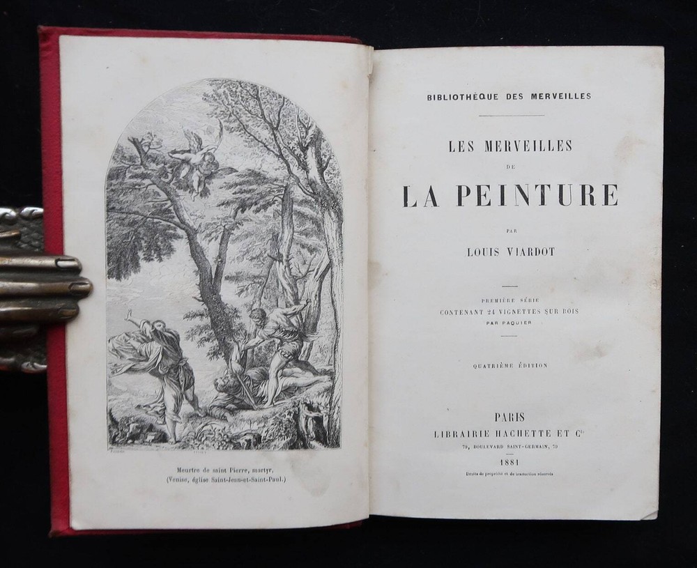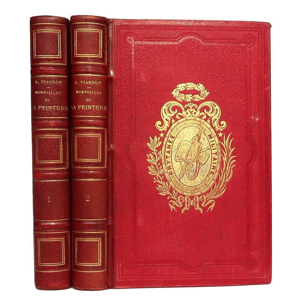 "Louis Viardot: Les Merveilles de la Peinture". Complete set in 2 volumes. Illustrated with 38 engravings. Paris, Librairie Hachette et Cie, 1881. 18 x 12 cm., 342 + 347 pages. Text in French. Bound in period half leather, raised bands, gilt to spines and front boards, marbled endpapers. Very good condition.