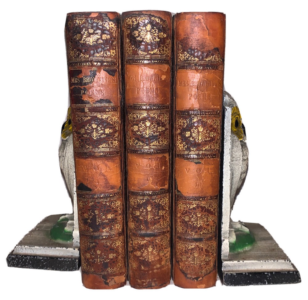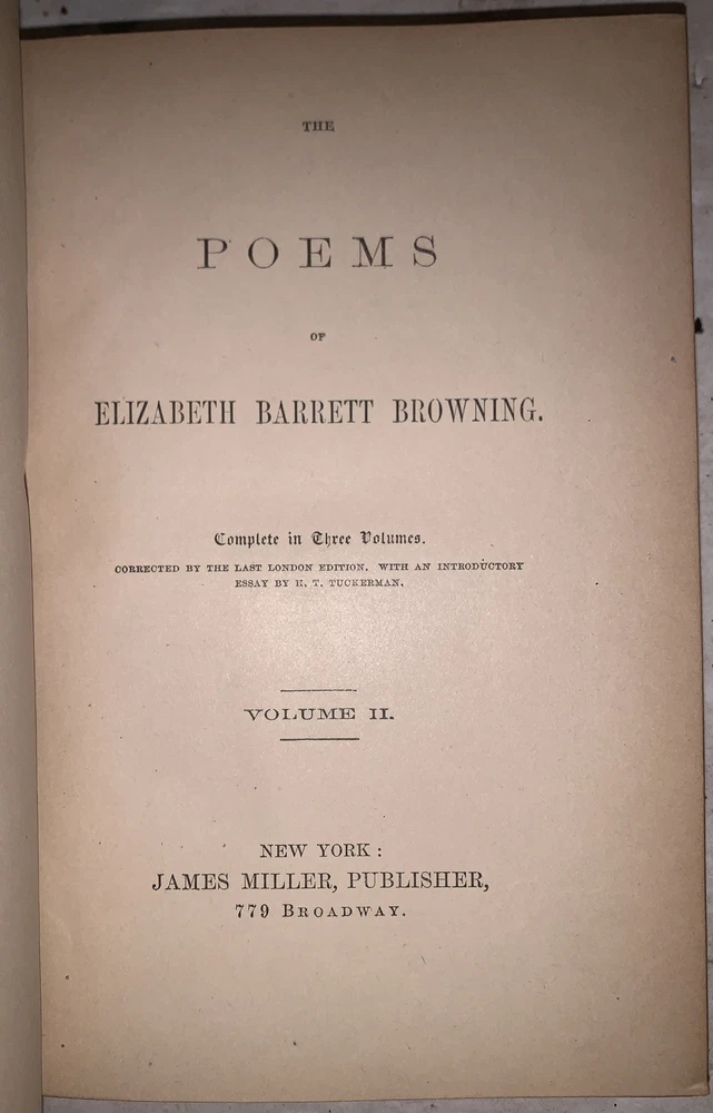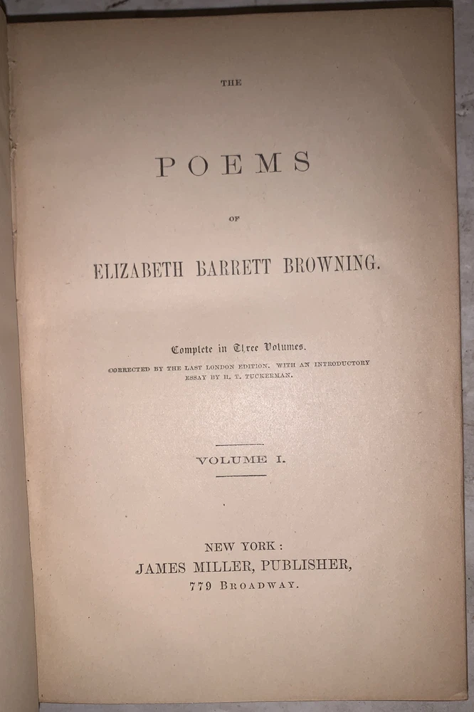 The Poems of Elizabeth Barrett Browning Complete in Three Volumes Corrected by the last London Edition. With an introductory essay by H. T. Tuckerman New York: James Miller ND, prior owner's inscription dated 1881 in each volume. Three 12mos, 458p; 455p; 456 pages, each volume bound in period full tree calf leather. Gilt decoration to spines and borders of each board, inside gilt dentelles, all edges gilt, marbled endpapers. Some rubbing and wear, professionally rebacked with hinges reinforced, a few scuffs, else in good + condition. If you have any questions feel free to ask and don't forget to check out my other listings.