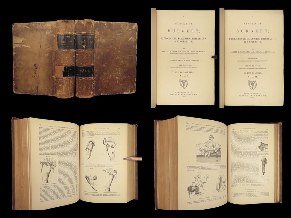 1882 GROSS Anatomy & Surgery System Medicine Pathology Therapy Engraving 2v Set Samuel Gross, a renowned 19 th -century physician and surgeon, was well-known for his medical treatises on surgery, particularly “ System of Surgery ”. This work is highly desirable and important, regardless of edition, and, according to ‘ Heirs of Hippocrates ’ the greatest surgical treatise ever written and was for many years the standard text in medical schools. Gross composed this work to be “the most elaborate, if not the most complete treatise in the English language.” (GM 5607). This 1882 edition is highly sought after, and this example is no exception with 1623 engravings throughout. Item number: #24946 Price: $750 GROSS, Samuel A System of Surgery: pathological, diagnostic, therapeutic and operative Philadelphia: Henry C. Lea’s Son and Co., 1882. Details : · Collation: Complete with all pages; 2 volumes o Vol. I – xxxii, 33-1194 § 704 illustrations o Vol. II – xxxii, [2], 19-1174, [2], 4 § 919 illustrations · References: HoH 931; Garrison-Morton 5607; Osler 2842 · Language: English · Binding: Leather; tight and secure · Size : ~10.5in X 7.25in (27cm x 18.5cm) Our Guarantee: Very Fast. Very Safe. Free Shipping Worldwide. Customer satisfaction is our priority! Notify us with 7 days of receiving, and we will offer a full refund without reservation! 24946
