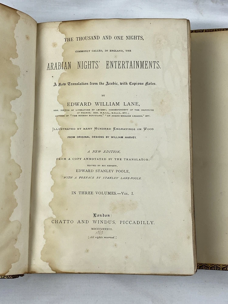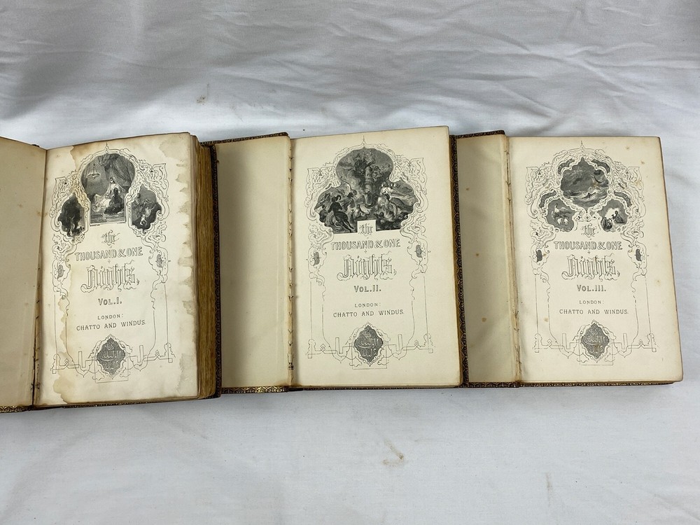 Pre-Owned, Antique We ship out fast! Either same day or next business day after payment Monday-Friday. Please review all photos, read entire description & ask any questions you may have ** Volume I has some water marks on the pages. See photos 5,6,7 & 8. The water marks are primarily on the first 150 pages. I have more photos that I can send you if interested. The Thousand And One Nights / Arabian Nights Entertainments 3 Volume Set By Edward William Lane Chatto & Windus London, England 1883 Shipping FedEx w/ Insurance Thanks for looking :-) Many of the items we sell come from estates, therefore we don’t have the background knowledge of their history, age, manufacturer, etc., unless marked. While we are not experts, we do cursory research on the merchandise we sell and describe them to the best of our ability. Please ask questions prior to purchasing or bidding. Unless specified as “new,” most items are pre-owned, used and/or vintage and therefore it may show normal age wear. See all pictures and use the enlarge tool, as this will provide you with the best description of the product. You will receive the item in the photos. Seller’s policy: Purchasing or making an offer commits you to buying the item and agreeing to the following policies: Please pay within 3 days after auction ends. If item is listed as a “Buy It Now/Or Best Offer,” immediate payment is required. Immediate payments are preferred and are always appreciated! If no payment is made within 3 days of purchase, a non-payment claim will be filed. Return policy: We do not accept returns unless a listing was grossly misrepresented. If you receive an item damaged in the mail, please take and send photos of the damage and the packaging so we may file an insurance claim with our carrier. Although we don’t accept returns, please communicate any issues with us prior to leaving feedback so we can work to resolve issues. Our goal is to keep you as a happy, returning customer and we appreciate positive feedback. Location: SF