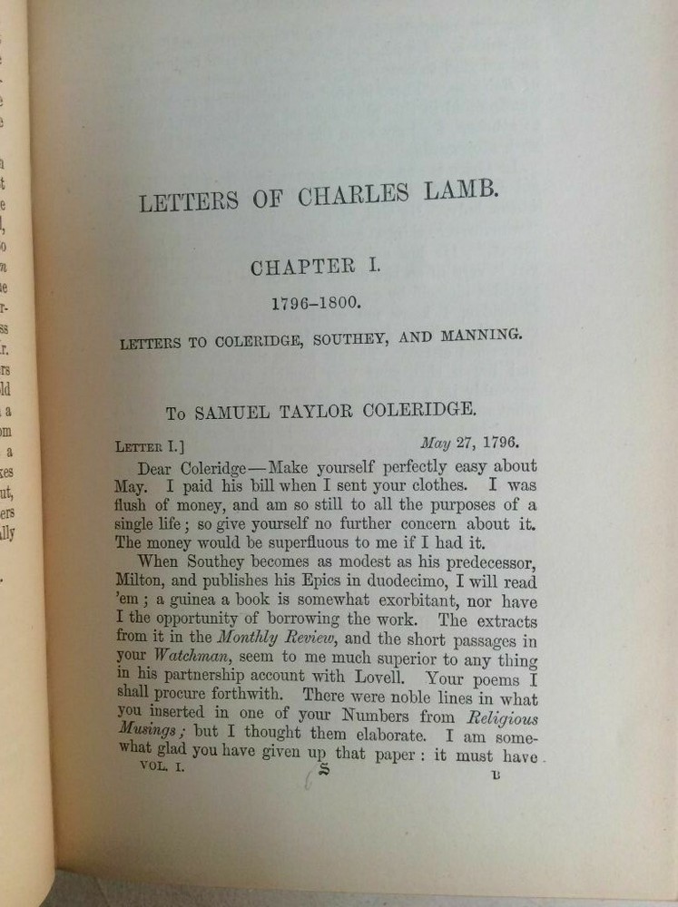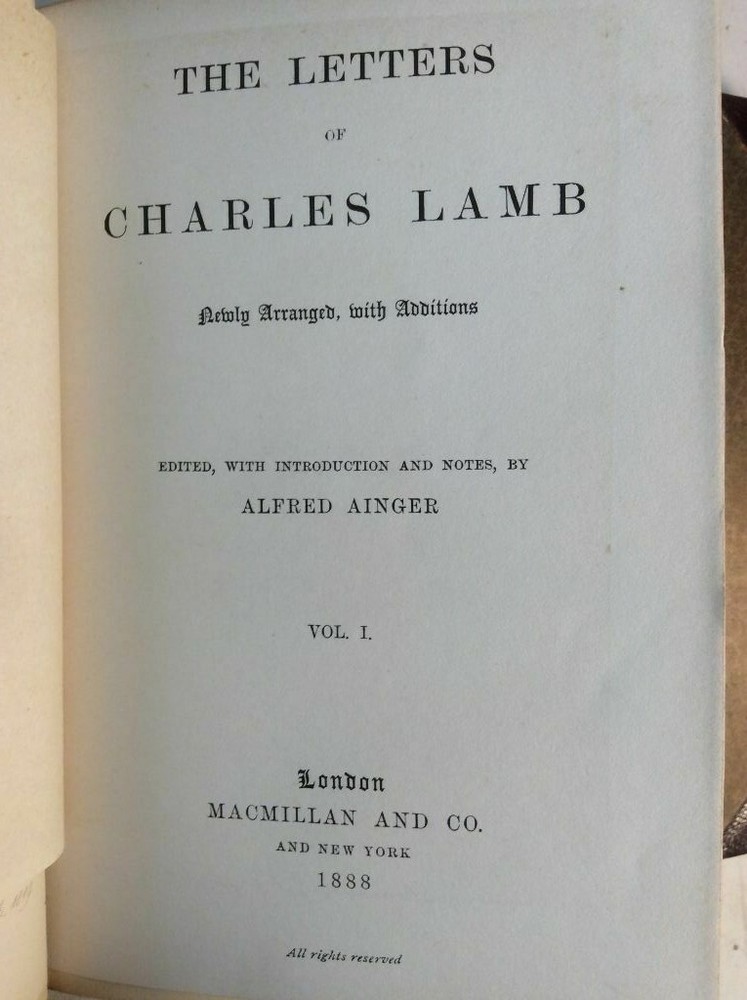 Attention Charles Lamb fans!!! You are bidding on a rare set of antique hardcover books titled The Letters of Charles Lamb. Newly Arranged With Additions. Edited with Introduction and Notes, by Alexander Ainger. Published by Macmillan and Co., London and New York, 1888. The set is complete in two volumes and you are bidding on both volumes. It is an all-matching set. This antique set is three-quarter bound in brown leather with leather tips. The spines have four wide raised bands.The pages are tightly bound with almost no foxing. The top of the pages has gilt edge. The set shows some corner/edge and general wear but remains in good condition. Would make a super addition to a collection. Great gift idea! (Inventory: Box 19-A) Track Page Views With Auctiva's FREE Counter