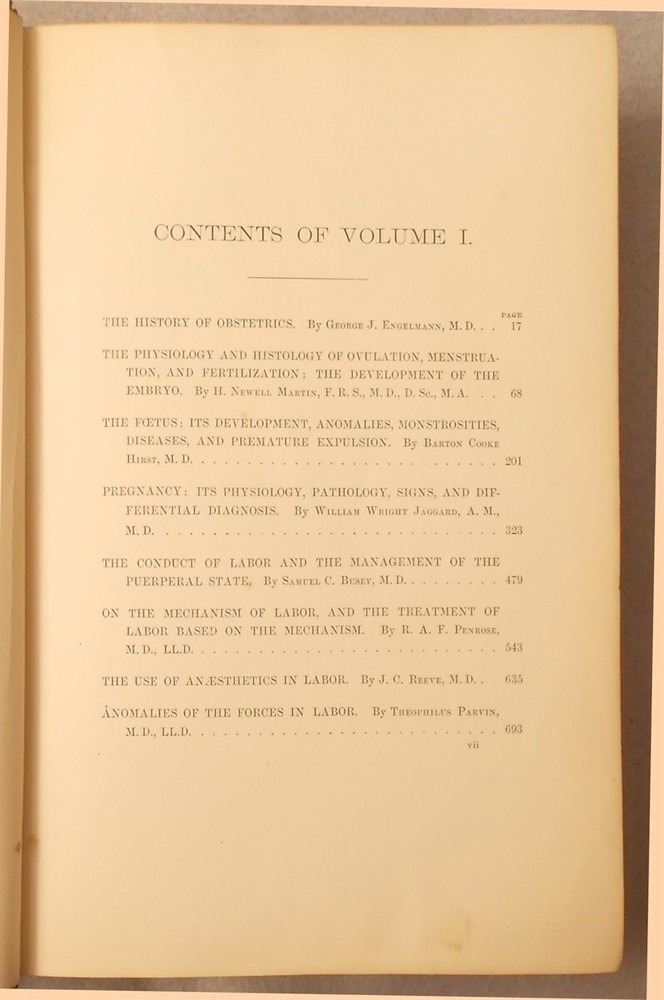 Hirst, Barton Cooke. A System of American Obstetrics (2 Volume Set) . Lea Brothers & Company, 1888. Leather: Good About 10" x 6.5", 808 & 854pp. A solid set bound in full leather. There is some scuffing and staining to the covers, more on Vol II, faint dampstain on the bottom edge of Vol II. Lacking the front endpaper of Vol. I, name inside both vols.