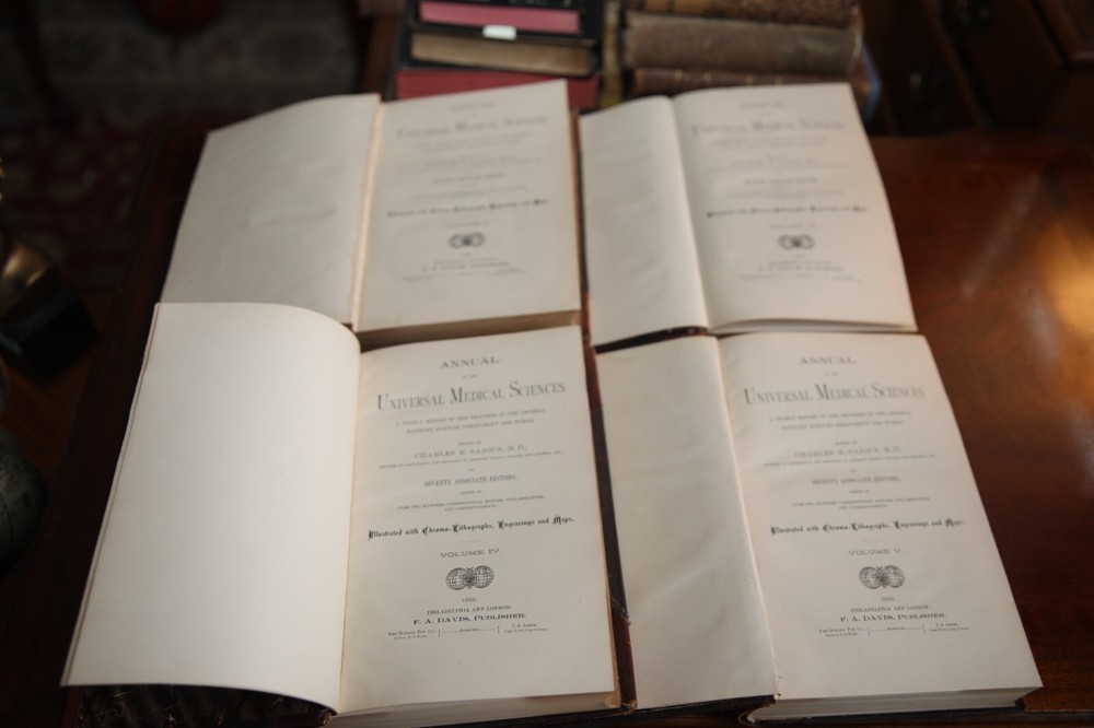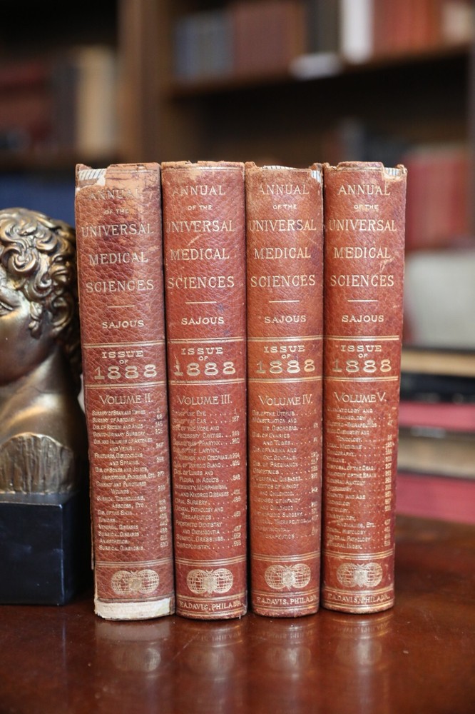 Step back in time with this 1888 edition of The Annual of the Universal Medical Sciences, an incredibly rare and historically significant four-volume medical reference set. Edited by Charles E. Sajous, M.D., this set compiles the most advanced medical knowledge of the late 19th century, covering a broad spectrum of medical research, surgical techniques, and treatments. This antique collection is a treasure trove for medical historians, collectors, and professionals interested in vintage medical texts. Lavishly bound in leather with gilt lettering, these volumes are beautifully crafted and richly illustrated with chromolithographs, engravings, and maps. Features: Title: Annual of the Universal Medical Sciences Author/Editor: Dr. Charles E. Sajous, M.D. Volumes: II, III, IV, and V (4 out of 5 volumes) Publication Year: 1888 Publisher: F.A. Davis, Philadelphia & London Binding: Leather-bound hardcovers with gold embossed lettering Illustrations: Includes chromolithographs, engravings, and medical diagrams Condition: Good+ considering its age – some wear on spines and covers, minor foxing and toning inside, but pages remain intact and legible. See photos for details. Price: $125 or best reasonable offer Keywords: antique medical books, rare medical encyclopedia, vintage medical reference, 19th-century medicine, Charles Sajous, universal medical sciences, 1800s medical literature, leather-bound medical books, historical medical texts, Victorian-era medicine, old medical books for collectors, rare scientific books, antique physician resources