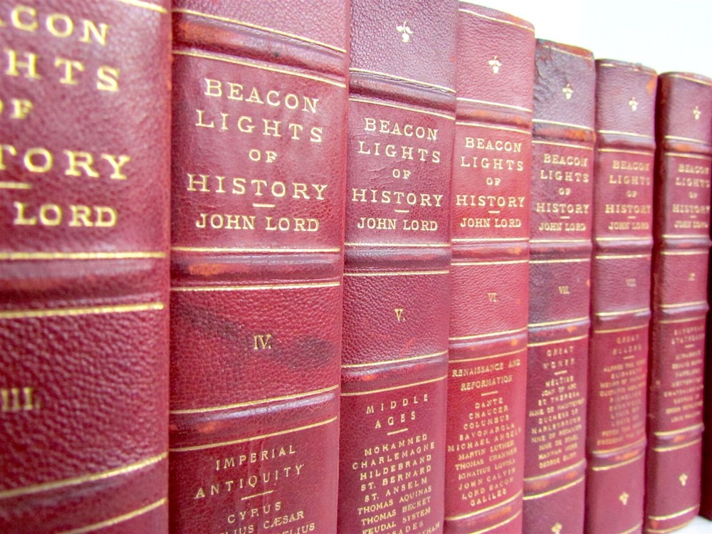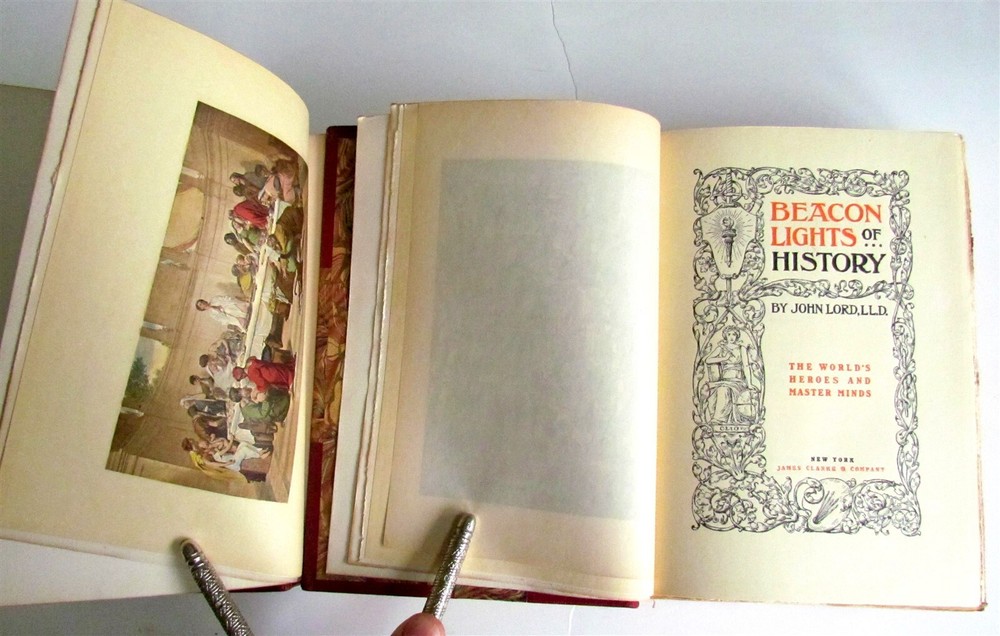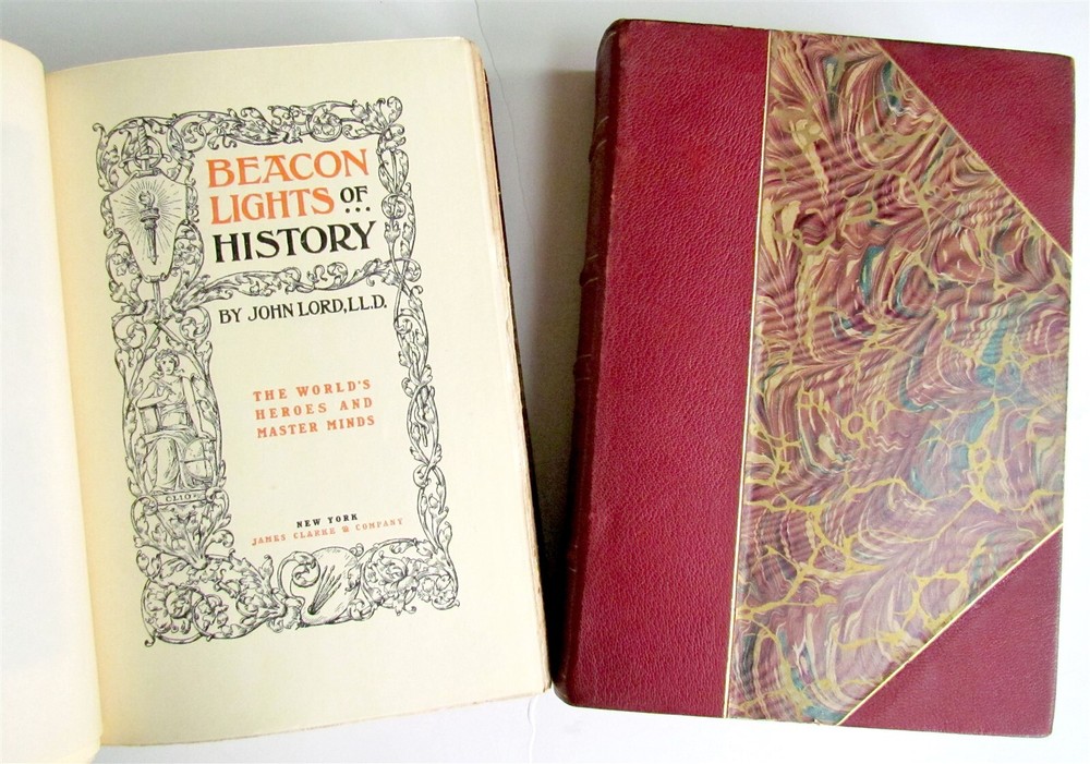 BEACON'S LIGHTS OF HISTORY by John Lord New York, James Clarke & Company; 1888-1902 15 VOLUMES COMPLETE SET 3/4 red morocco with marbled boards. Gilt top edge. Excellent interior, minor wear of bindings Size 6 by 8.5" Text in English ============================== Powered by SixBit's eCommerce Solution
