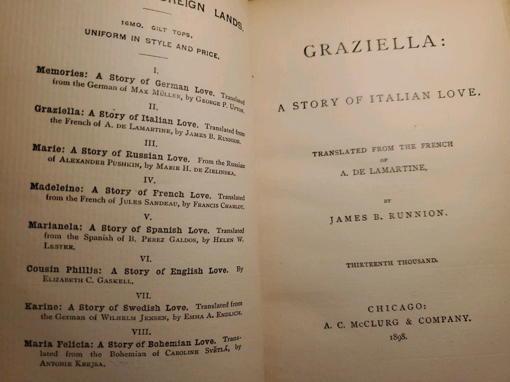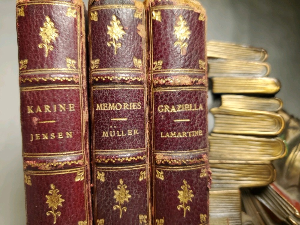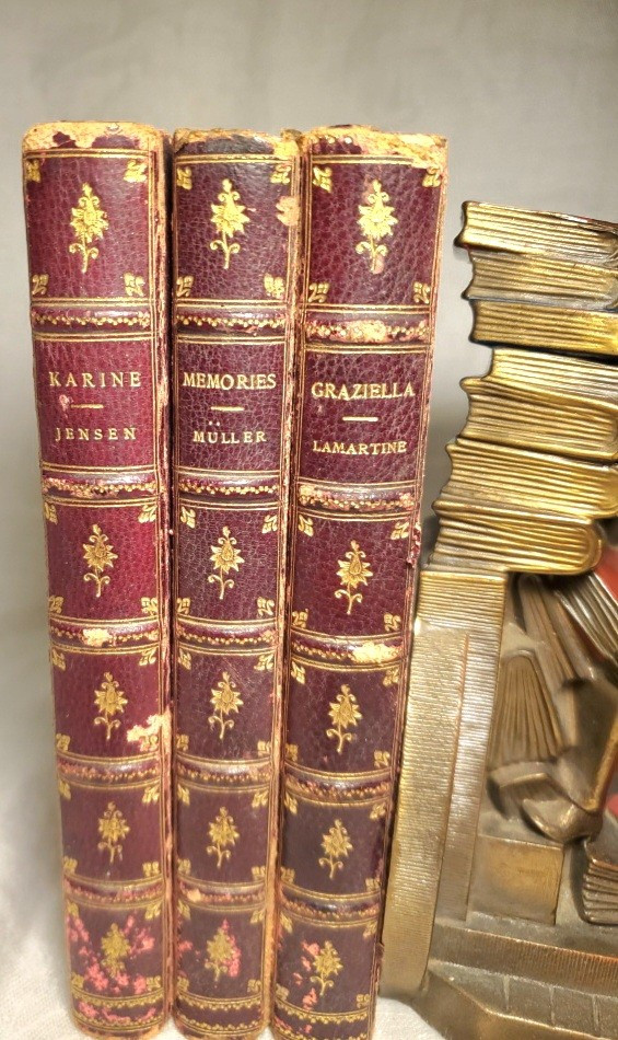 Beautiful and old set of three romance and love story books from the 1890s, featuring matching gorgeous old red leather hardcovers. The books are a luxury edition, collector's edition, and 1st edition, with inscriptions inside. Published by AC McClurg and Company in Chicago, the books are part of North American literature and fiction, printed in English in 1898. This set is a valuable addition for collectors or enthusiasts of antique books. Titles: KARINE : A SWEDISH LOVE STORY by Jensen GRAZIELLA : A story of Italian Love MEMORIES : A Story of German Love by Muller