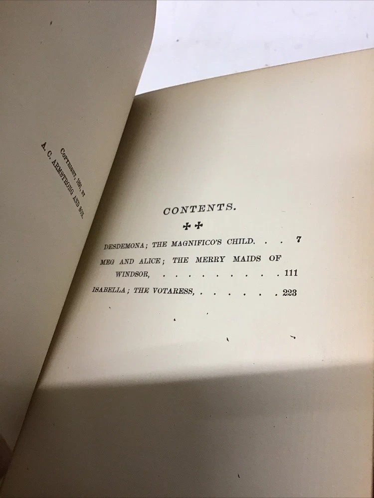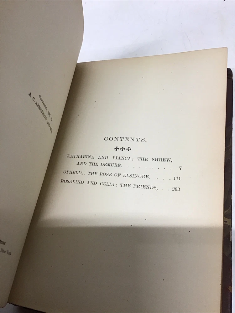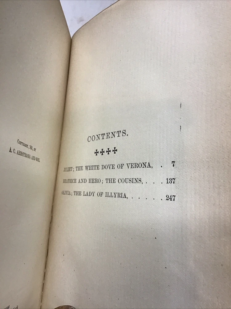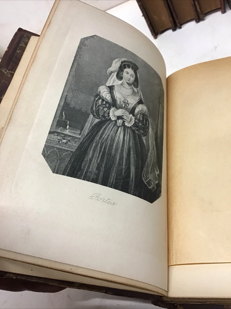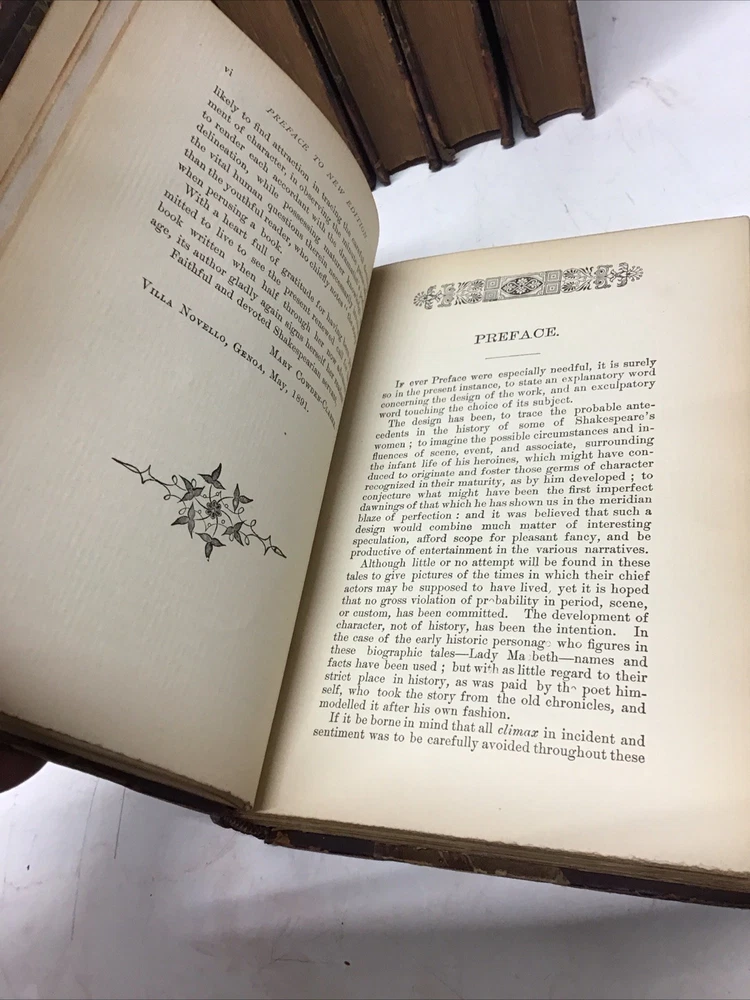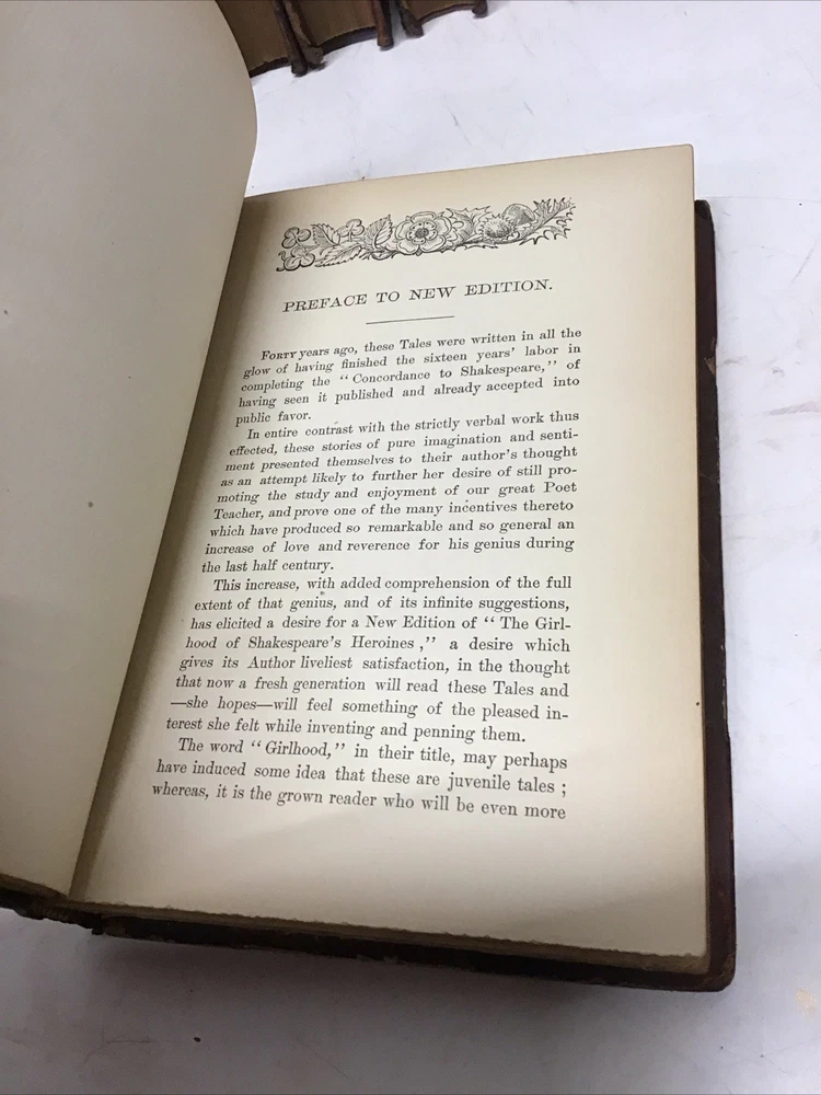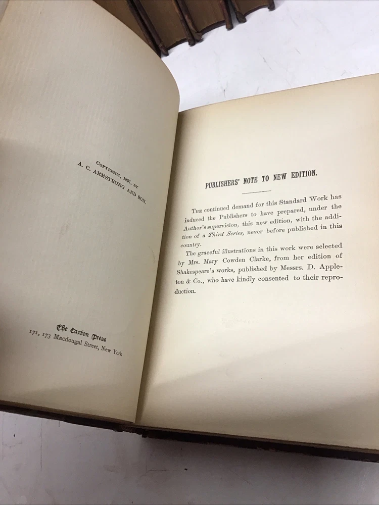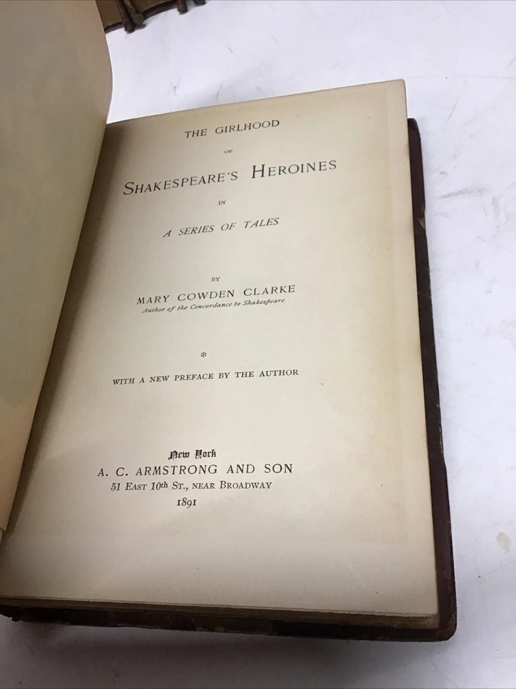 The product is a 1891 new edition of "The Girlhood of Shakespeare's Heroines" by Mary Cowden Clarke, published in 5 volumes by A.C. Armstrong & Son in New York. The hardcover leather binding adds a touch of elegance to this classic literature and fiction book set. Written in English, this collection offers a unique perspective on the famous Shakespearean heroines during their younger years, making it a valuable addition to any collector's library. 1891 The Girlhood of Shakespeare's Heroines (5 Volume Set) Clarke, Mary Cowden Size 5” x 7” Covers have wear being 135+ years old Volumes 2,4,5 have tape supporting the covers as they have been detached and are somewhat stiff to open. Some tears to marbleized endpapers and name of previous owner. Keep in mind the shipping price also covers handling fees, packaging materials & time, not just postage. See our eBay store for thousands of our other items. B16