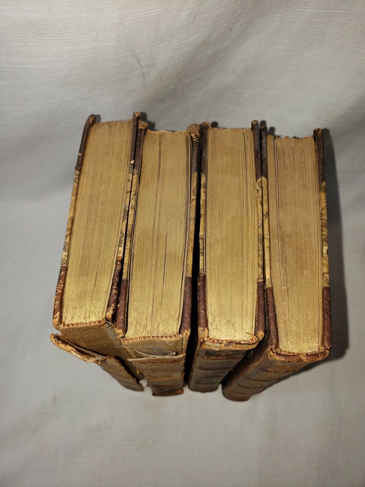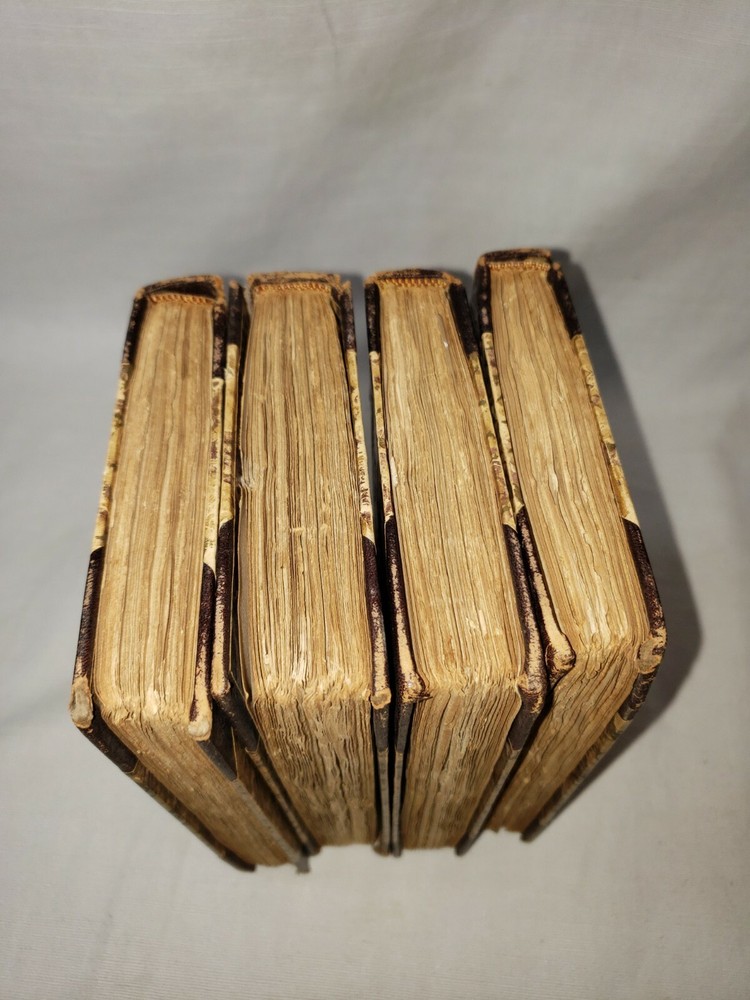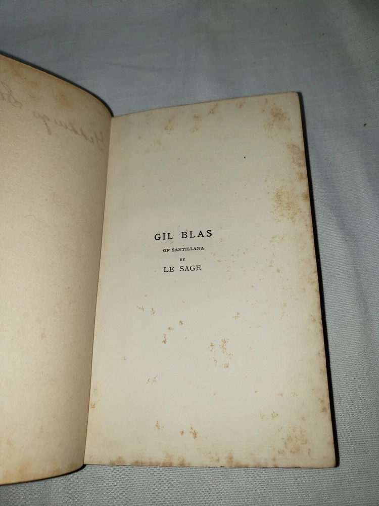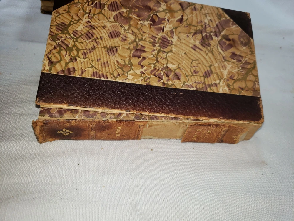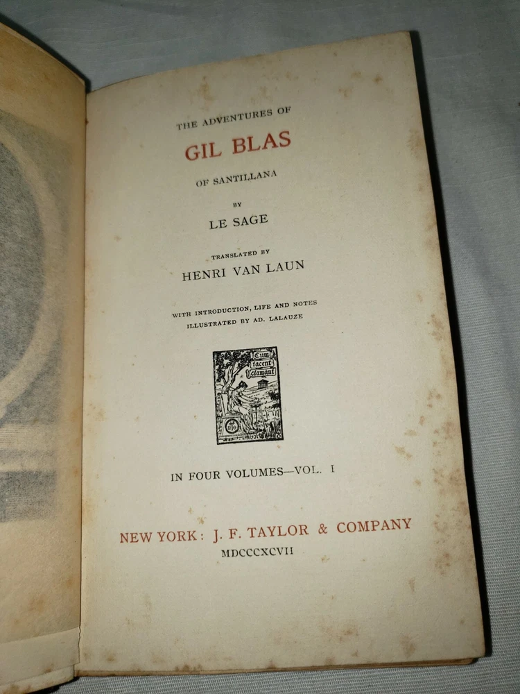 Four volume set of the Adventures of Gil Blas of Santillane by Le Sage - Numbered Cabinet Edition 155 of 1000, published by J.F. Taylor and Company in 1897. This translation is by Henri van Laun. Measure about 4.5" by 7". Fair overall condition as shown - leather portions have broken down some, in particular the 2nd volume which as been reaffixed with simple tape. This volumes cover is also detatching as shown in the last photo. Some foxing and discoloration to page edges as shown. Each volume has "Giddings Stone" written in the flyleaf, perhaps a reference to the mansion in Texas. Photos are of the exact volumes for sale so please have a look and let me know should you have any questions.