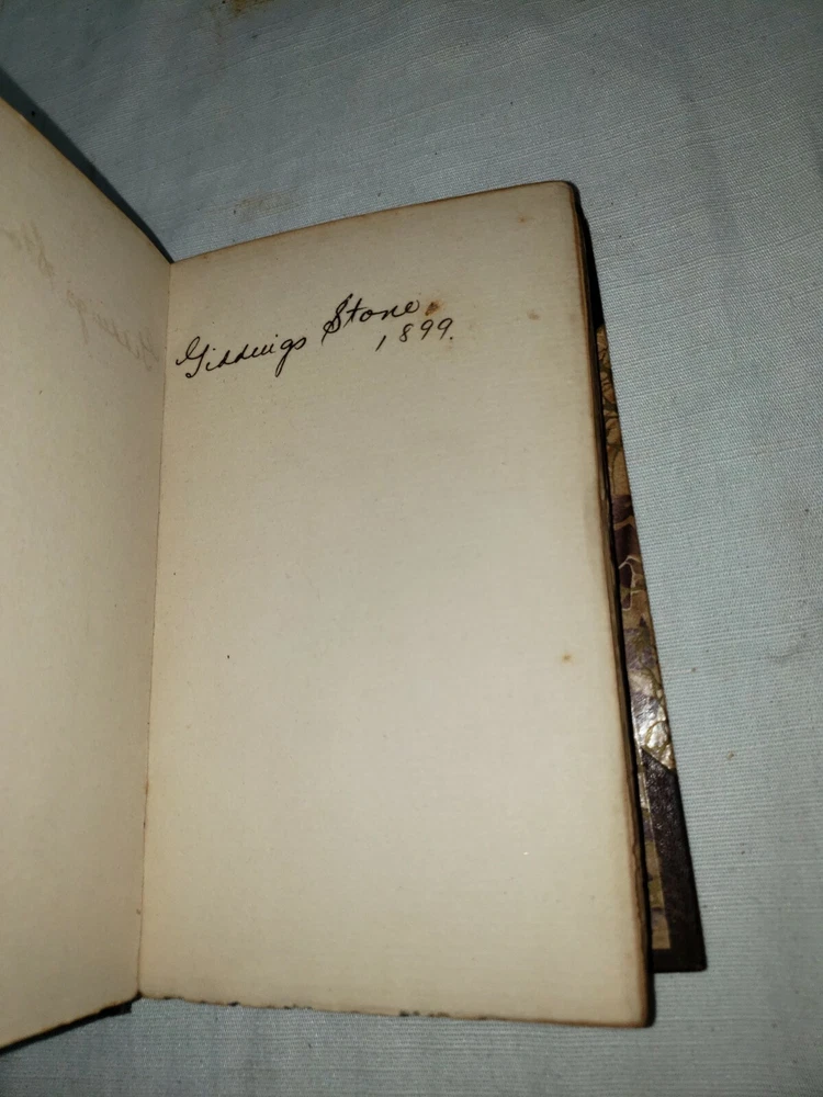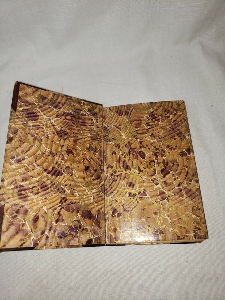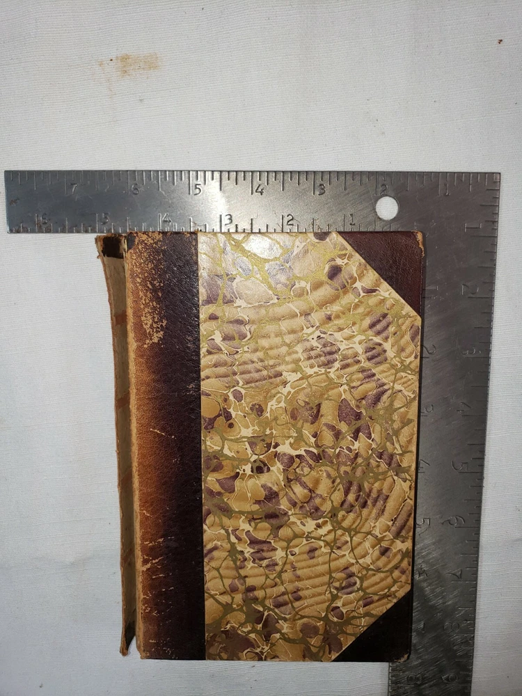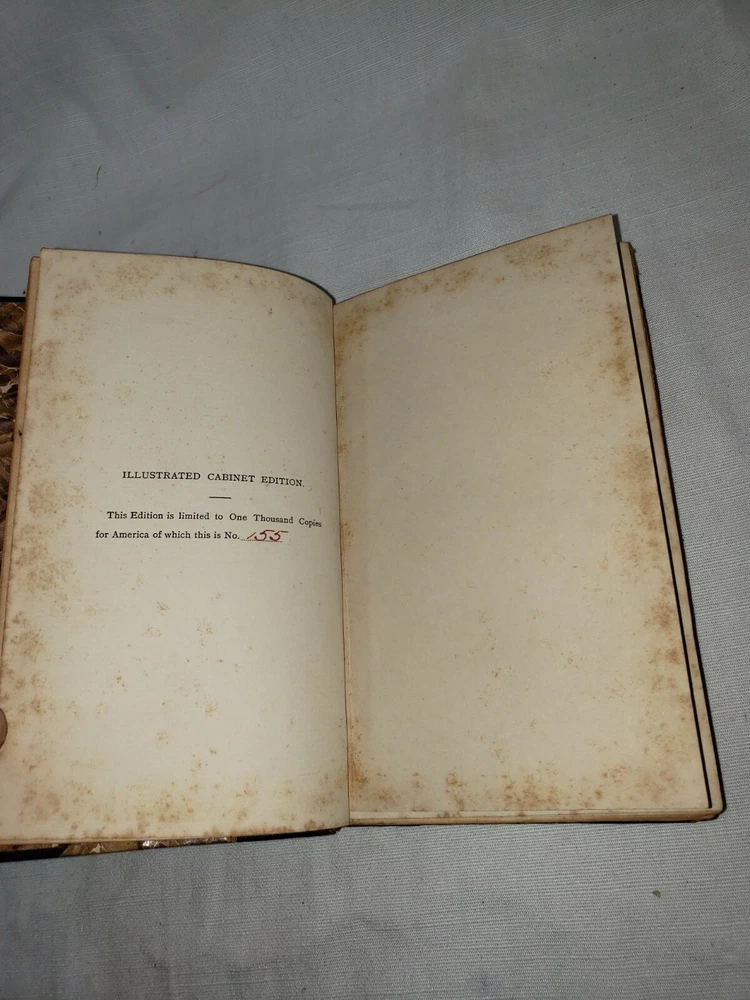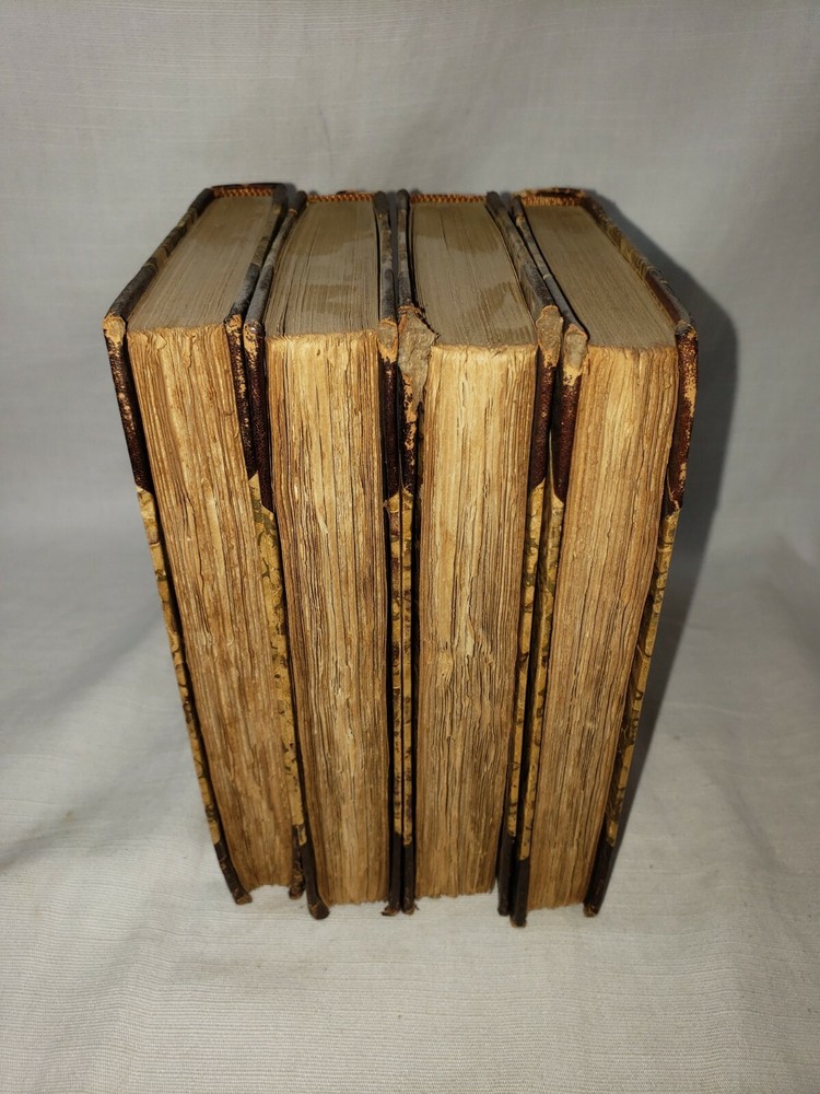 Four volume set of the Adventures of Gil Blas of Santillane by Le Sage - Numbered Cabinet Edition 155 of 1000, published by J.F. Taylor and Company in 1897. This translation is by Henri van Laun. Measure about 4.5" by 7". Fair overall condition as shown - leather portions have broken down some, in particular the 2nd volume which as been reaffixed with simple tape. This volumes cover is also detatching as shown in the last photo. Some foxing and discoloration to page edges as shown. Each volume has "Giddings Stone" written in the flyleaf, perhaps a reference to the mansion in Texas. Photos are of the exact volumes for sale so please have a look and let me know should you have any questions.