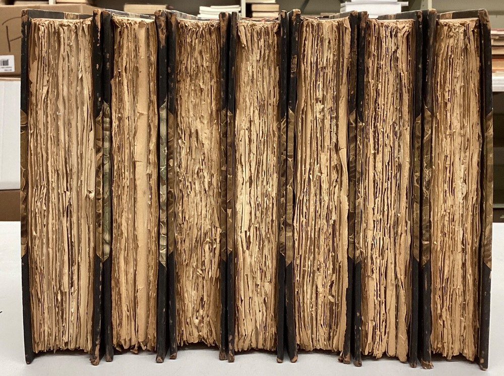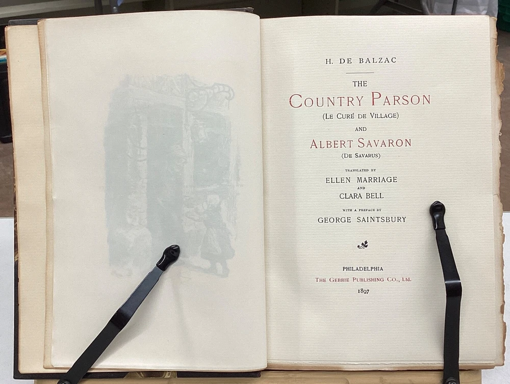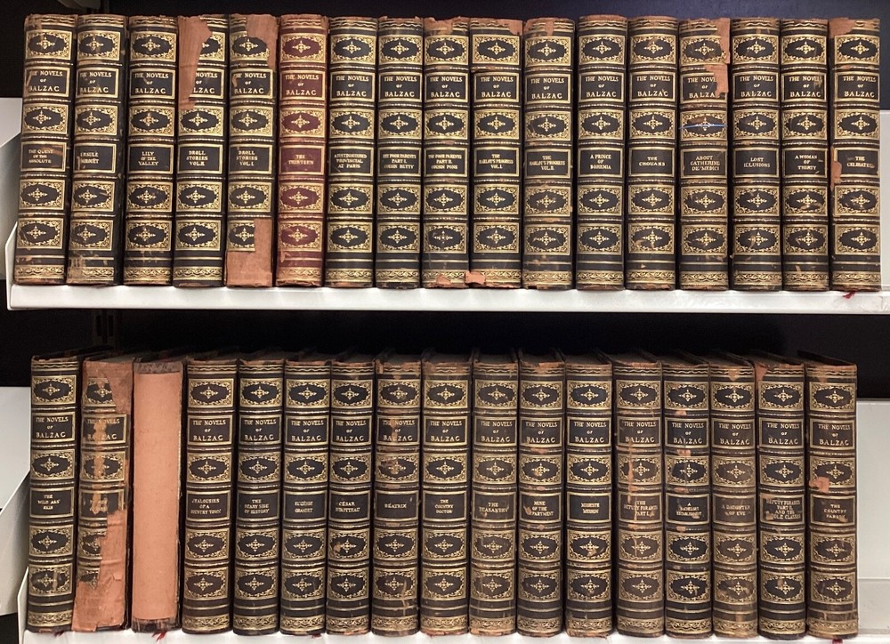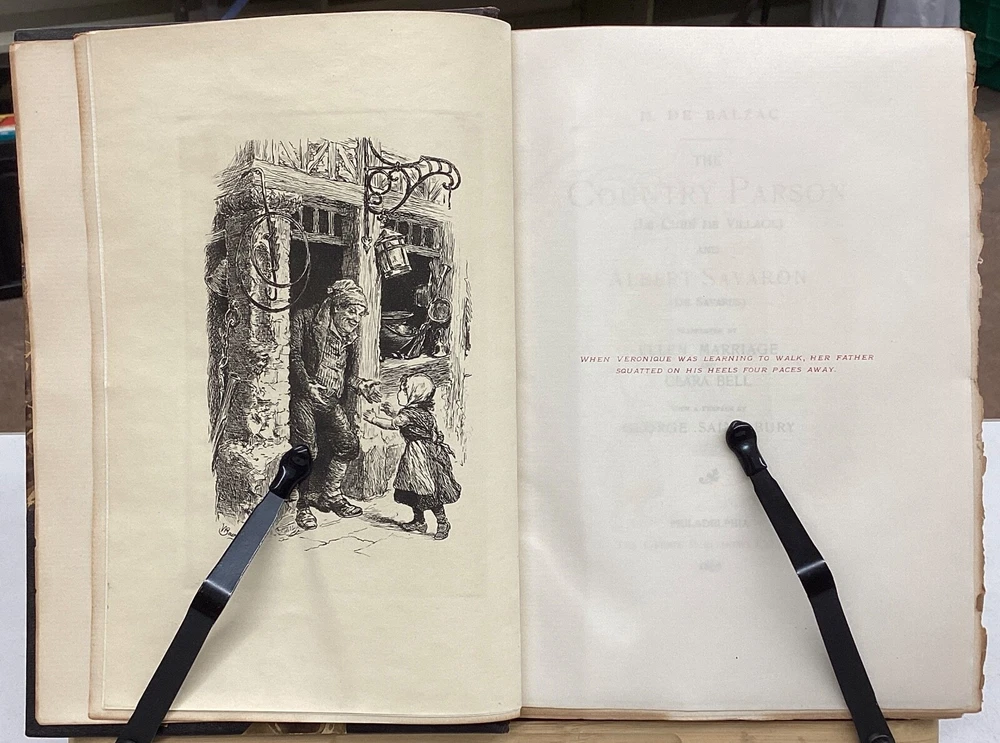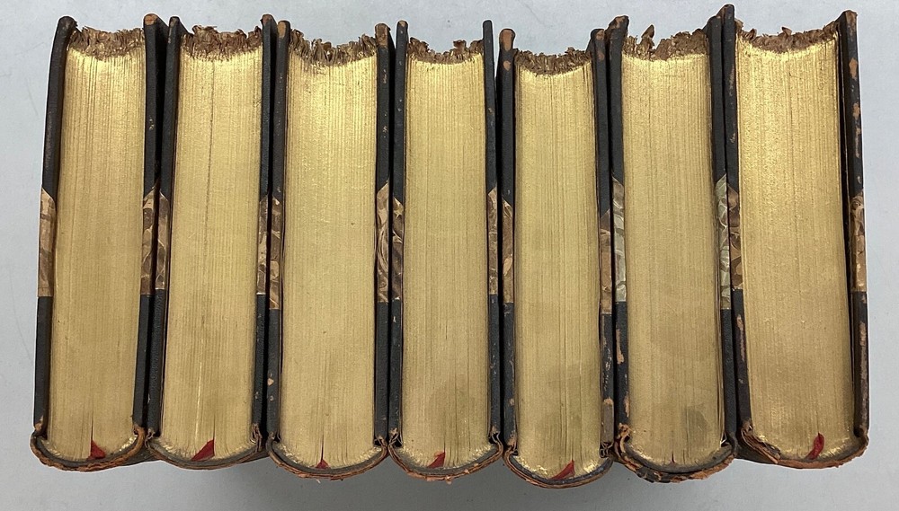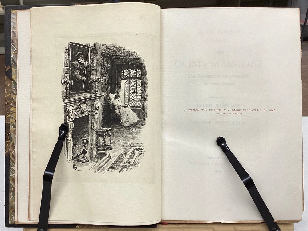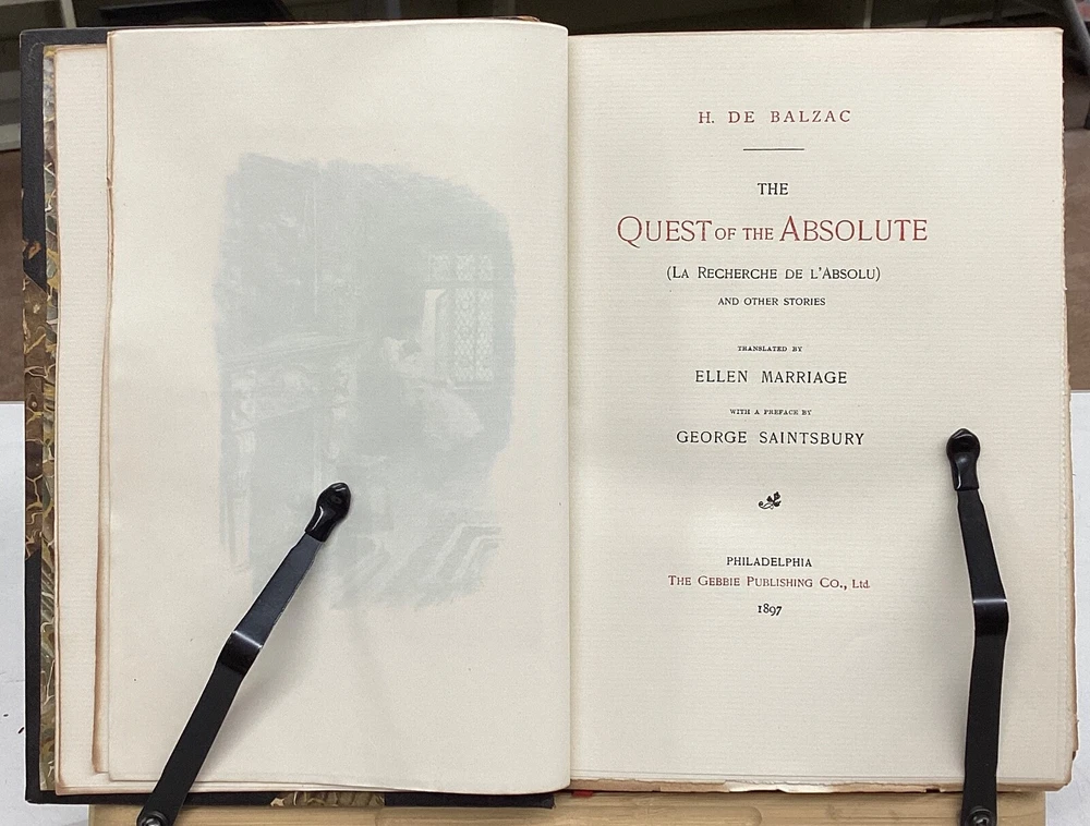 ***PLEASE NOTE: THIS SET IS LARGE AND WILL REQUIRE MULTIPLE BOXES FOR SHIPMENT. WE CAN SHIP DOMESTICALLY ONLY (not outside of U.S.) SHIPPING PRICE IS NON-NEGOTIABLE. The Novels of H. De Balzac. Philadelphia: The Gebbie Publishing Co., Ltd. 1897-1899. Complete thirty-four volume set in uniform half-leather bindings measuring 8.75 x 6.5", 8vos. Vol. 1: The Quest of The Absolute Vol. 2: Ursule Mirouet Vol. 3: Lily of The Valley Vol. 4: Droll Stories Vol. I Vol. 5: Droll Stories Vol. II Vol. 6: The Thirteen Vol. 7: A Distinguished Provincial at Paris Vol. 8: The Poor Parents Part I: Cousin Betty Vol. 9: The Poor Parents Part II: Cousin Pons Vol. 10: The Harlot's Progress Vol. I Vol. 11: The Harlot's Progress Vol. II Vol. 12: A Prince of Bohemia Vol. 13: The Chouans Vol. 14: About Catherine De'Medici Vol. 15: Lost Illusions Vol. 16: A Woman of Thirty Vol. 17: The Celibates Vol. 18: The Wild Ass' Skin Vol. 19: Father Goriot Vol. 20: Seraphita Vol. 21: Jealousies of A Country Town Vol. 22: The Seamy Side of History Vol. 23: Eugenie Grandet Vol. 24: Cesar Birotteau Vol. 25: Beatrix Vol. 26: The Country Doctor Vol. 27: The Peasantry Vol. 28: Muse of The Department Vol. 29: Modeste Mignon Vol. 30: The Deputy For Arcis Part I Vol. 31: The Deputy For Arcis Part II Vol. 32: A Bachelor's Establishment Vol. 33: A Daughter of Eve Vol. 34: The Country Parson In fair condition. As is. Half-leather boards scuffed at edges and worn/bumped at leather corners. Heads and tails of spines bumped or lacking (including headbands); Spines chipped with exposed binding in Vol. 4-5, 17 & 19; Vol. 20 lacking spine. Vol. 10 & 14 with torn spine near head. Spine toned of Vol. 6. Gilt top edge is bright. Toned fore-edge of text-block. Front and rear gutters cracked or starting in most volumes. Binding otherwise intact. Rear paste-downs with tear from sticker removal. Text-blocks otherwise clean and bright. Please see photos and ask questions, if any, before purchasing. Honoré de Balzac ( 20 May 1799 – 18 August 1850) was a French novelist and playwright. The novel sequence La Comedie Humaine, which presents a panorama of post-Napoleonic French life, is generally viewed as his magnum opus. After writing several novels, in 1832 Balzac conceived the idea for an enormous series of books that would paint a panoramic portrait of "all aspects of society". The moment the idea came to him, Balzac raced to his sister's apartment and proclaimed: "I am about to become a genius!" Although he originally called it Etudes des Mœurs (literally 'Studies of manners', or 'The Ways of the World') it eventually became known as La Comédie humaine , and he included in it all the fiction that he had published in his lifetime under his own name. This was to be Balzac's life work and his greatest achievement. Complete thirty-four volume set. FORN-SHELF-0453-BB-2503-BH80